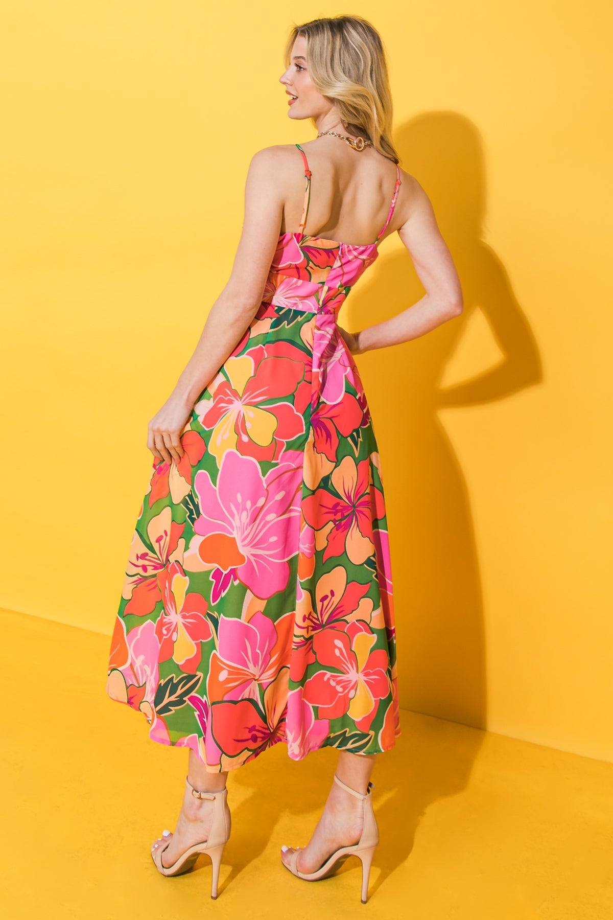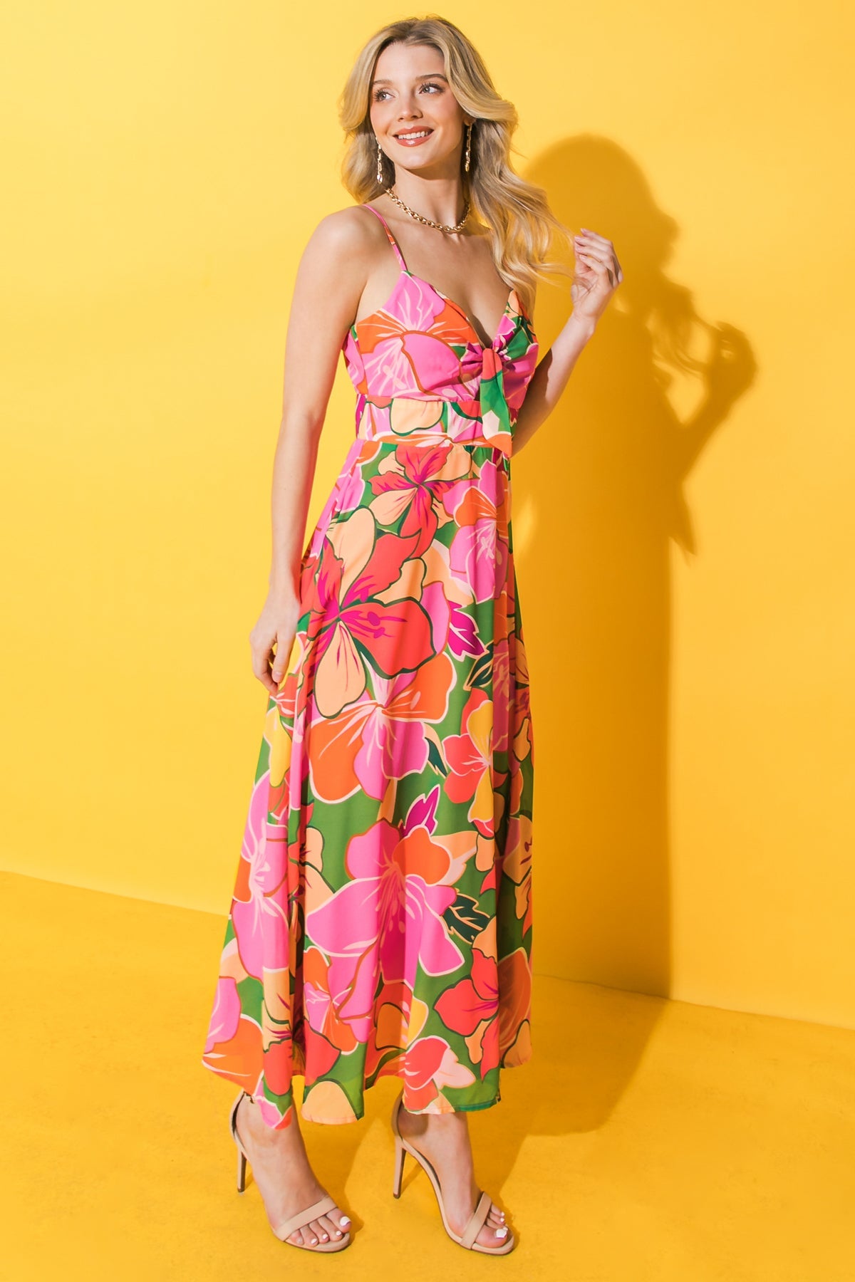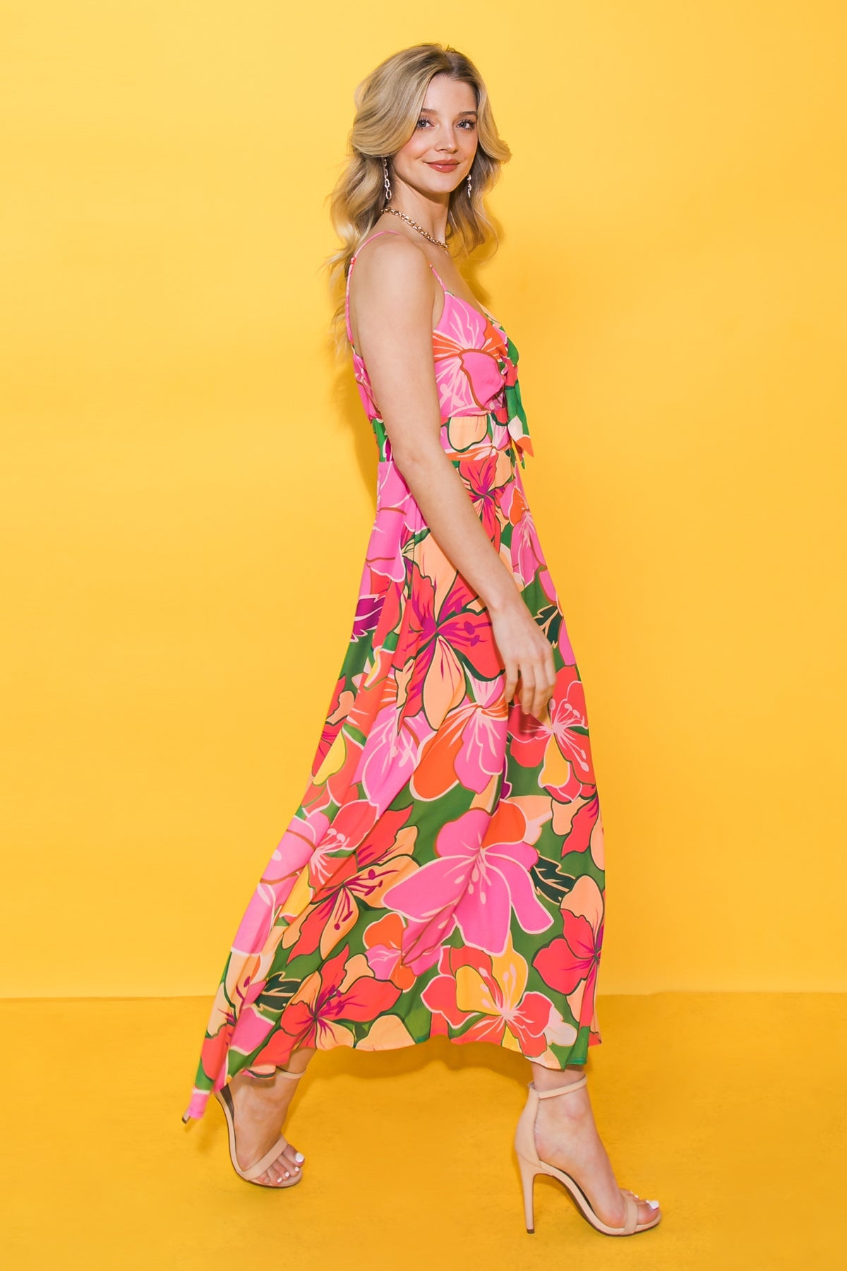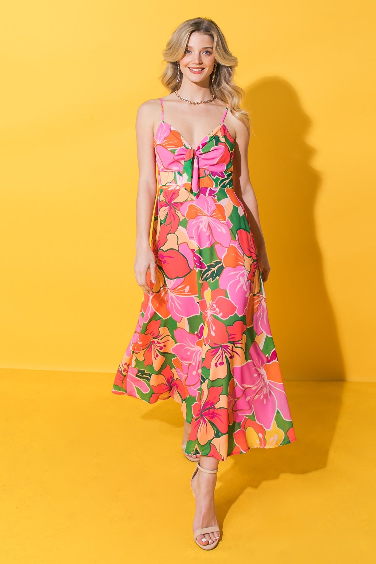 A printed woven midi dress featuring sweetheart neckline with front tie detail, spaghetti strap, A line skirt and back zipper closure