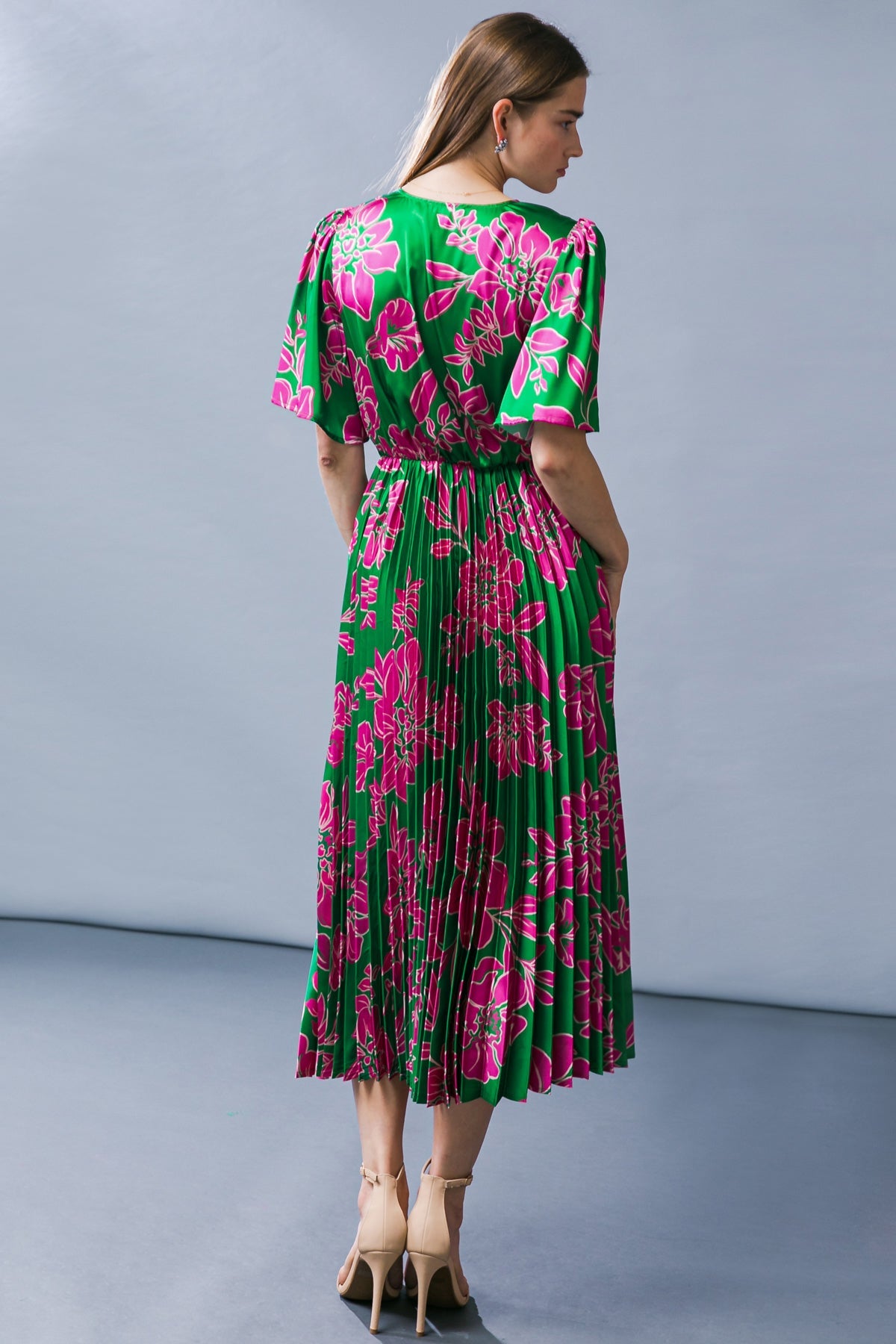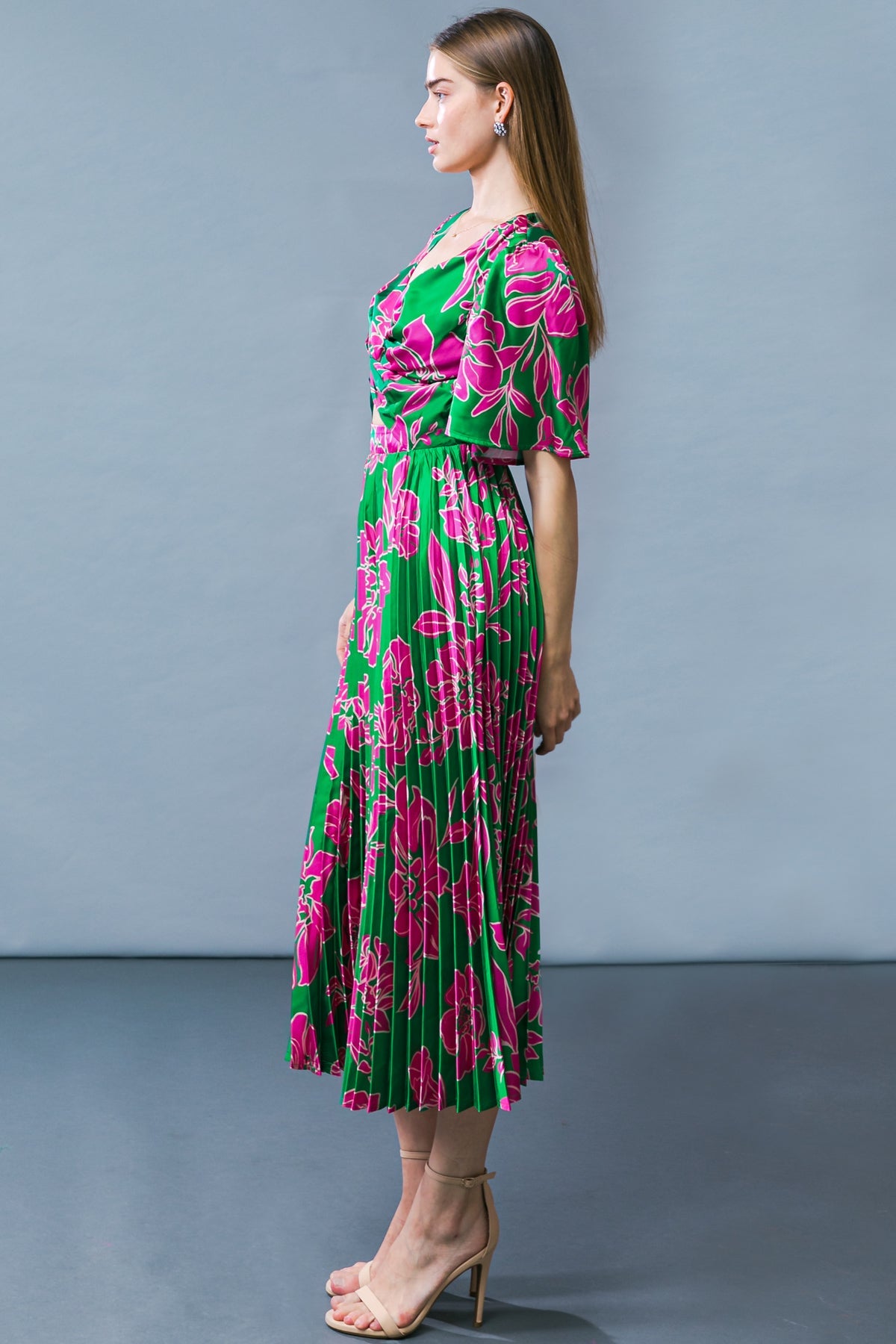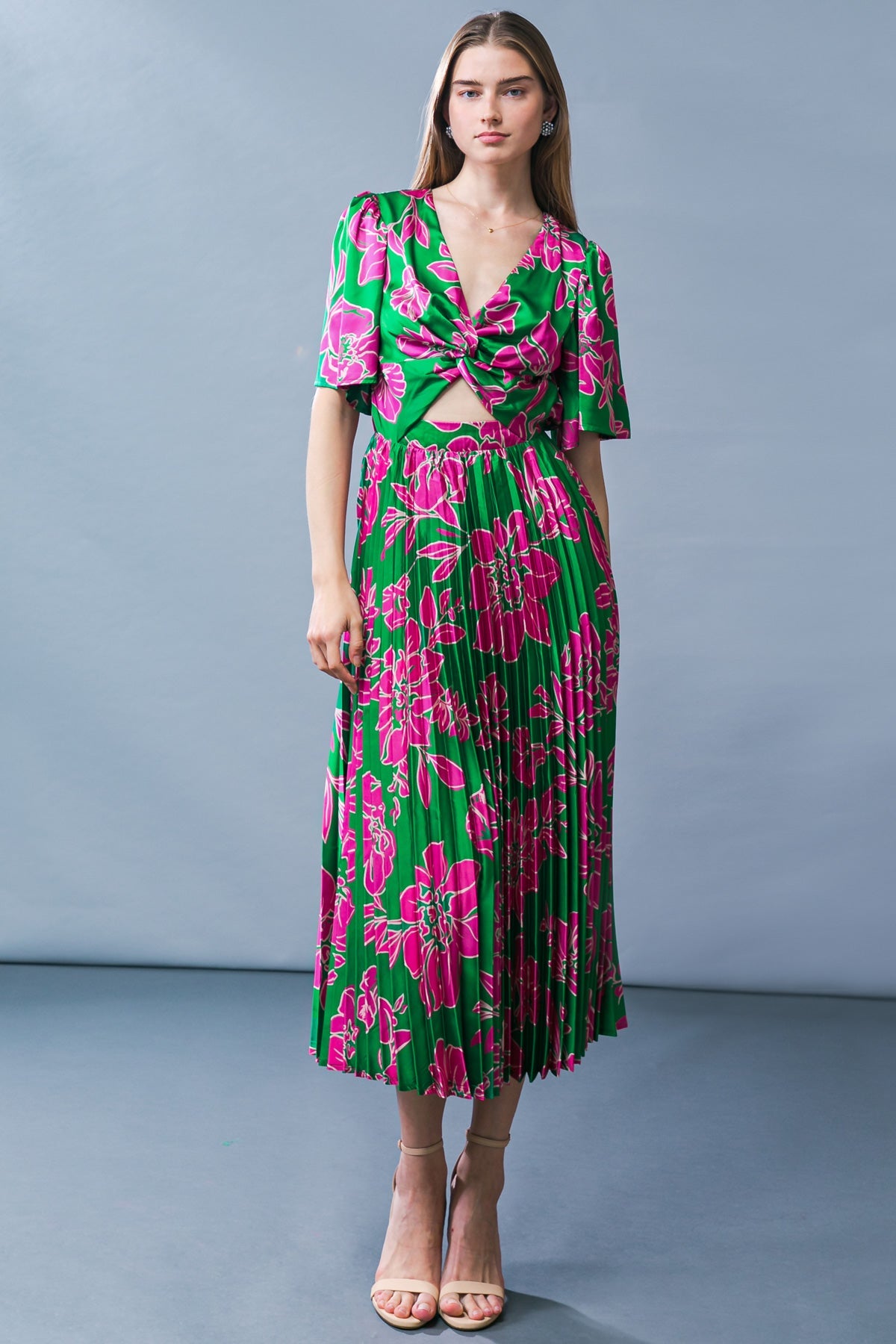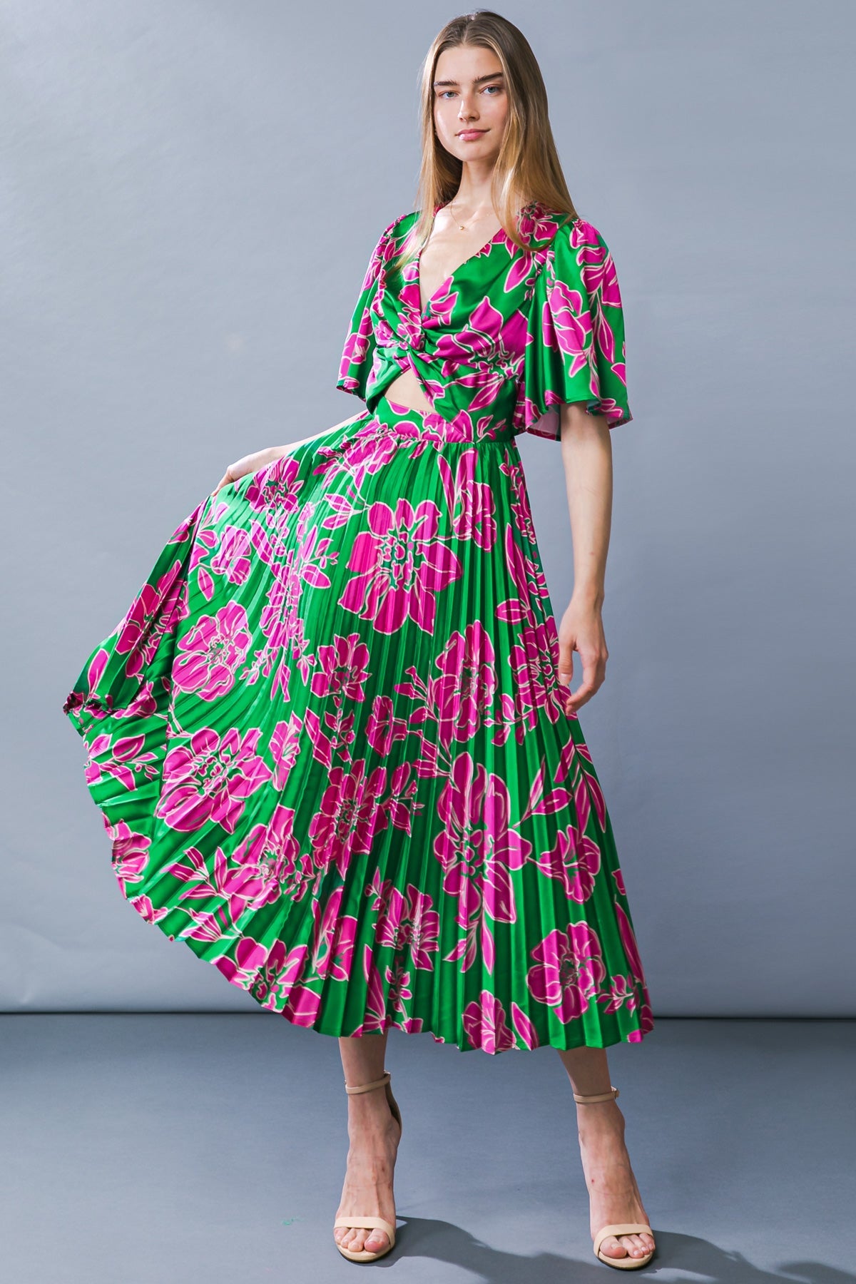 A printed woven midi dress featuring V neckline, front twist and cut out detail, short flutter sleeve, pleated skirt and elasticized back waist