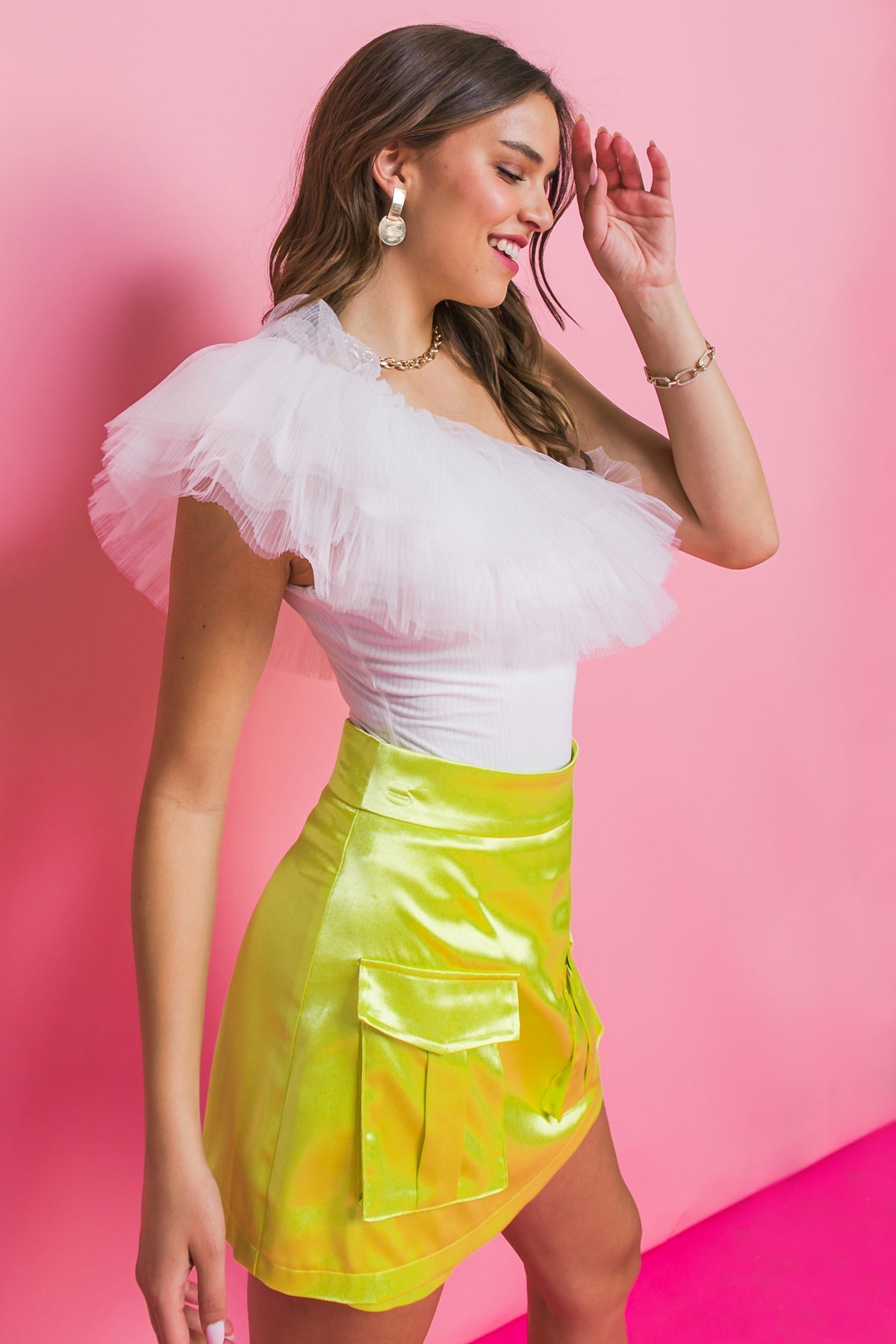 Make a stunning style statement in the Champagne Dreams Knit Bodysuit. This solid knit bodysuit features a flattering one shoulder neckline and striking tulle ruffles. The bottom snap closure ensures a perfect fit and total comfort. Style it with shorts for a summery look.