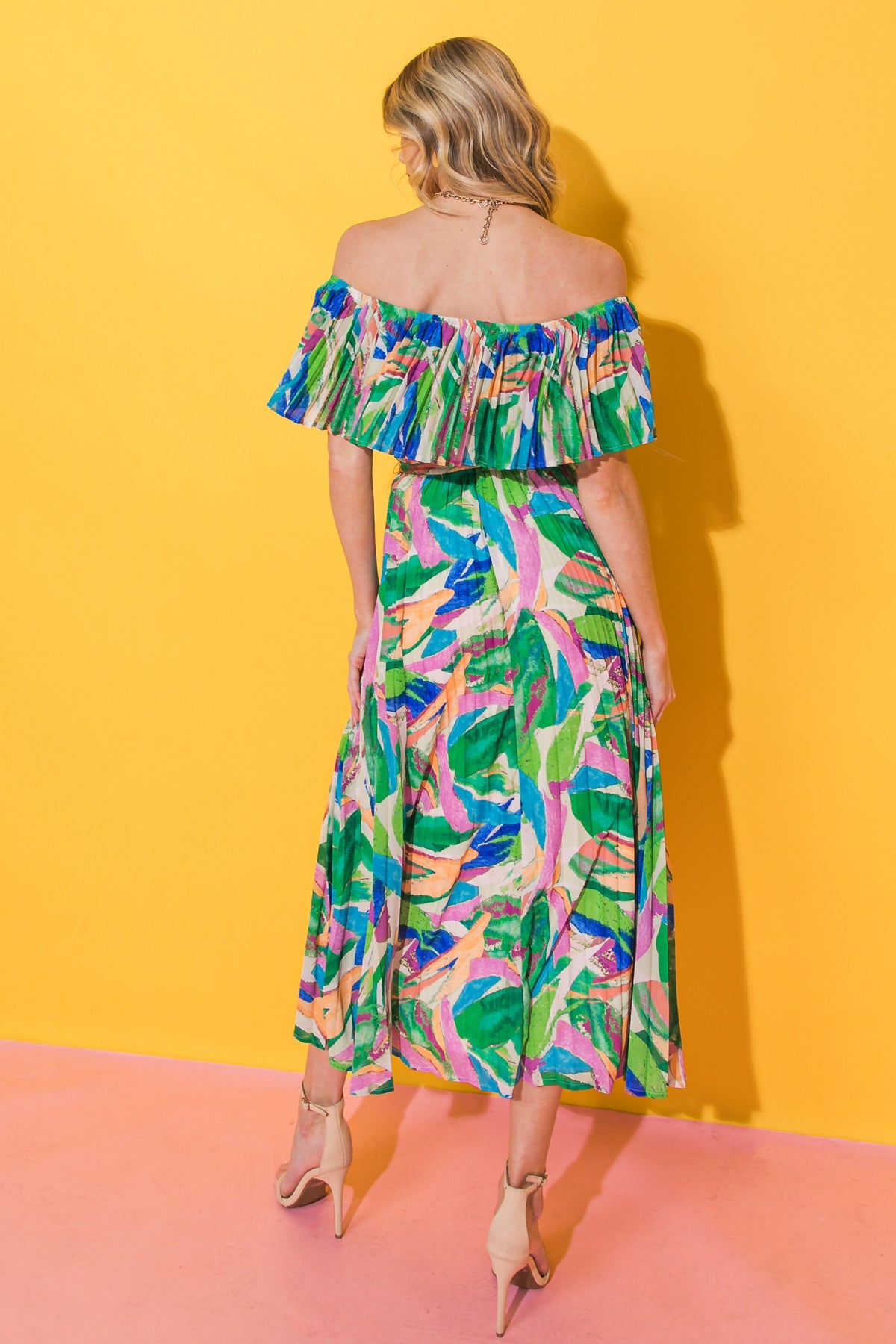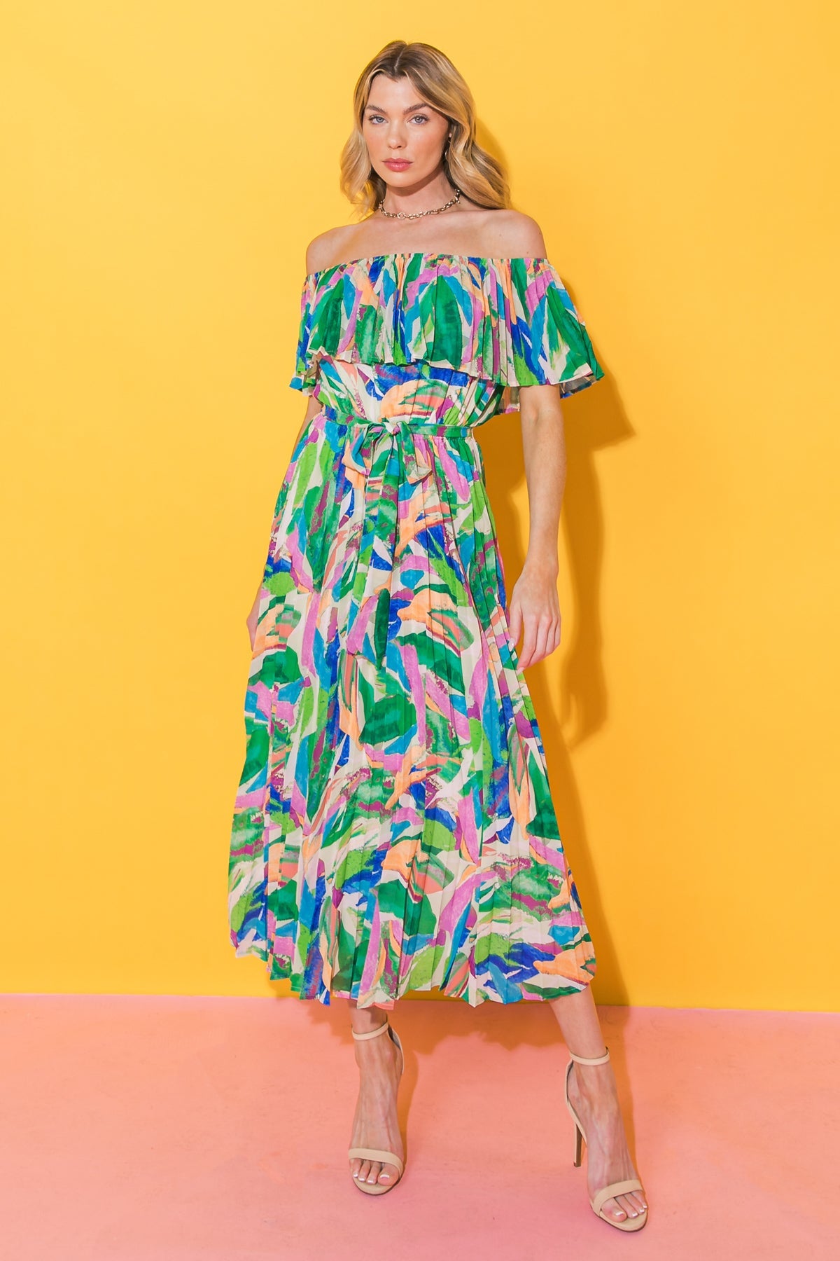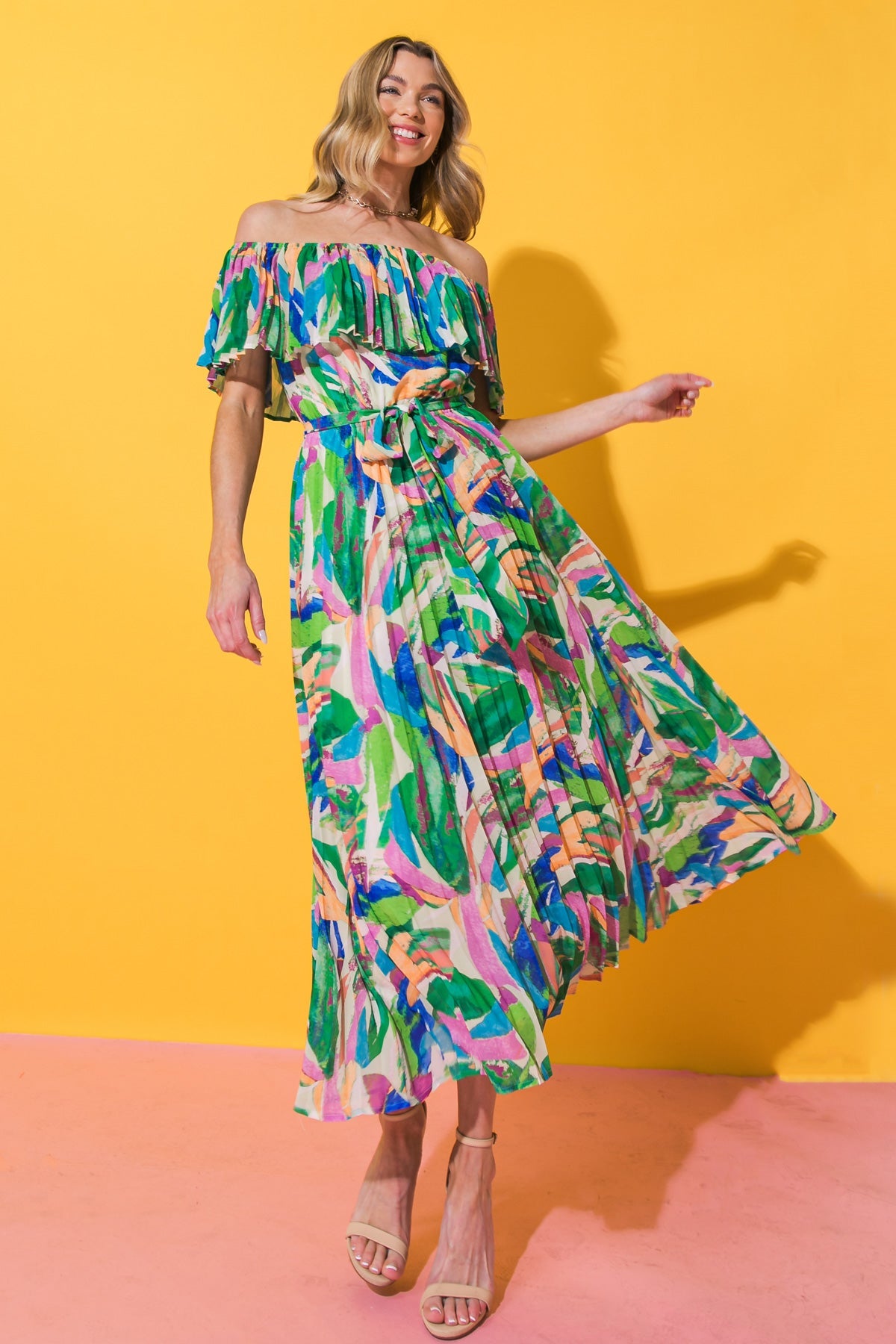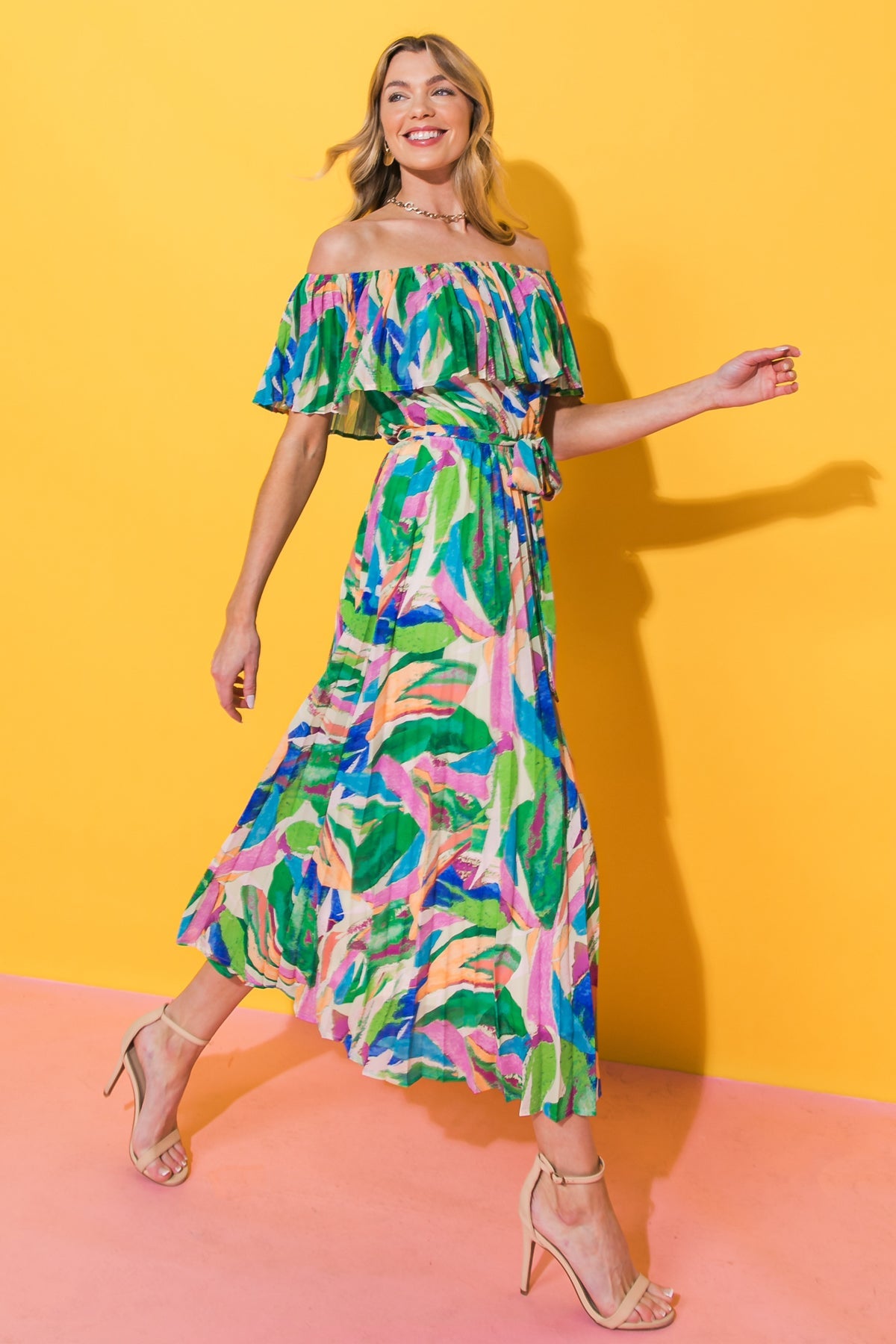 This CHARMING CELEBRATION WOVEN MIDI DRESS is perfect for any special occasion. The printed woven pleated design is sophisticated and figure-flattering, with an off-the-shoulder neckline, cinched waist and self-sash belt for an extra touch of elegance. Make your next celebration even more special with this stunning midi dress!