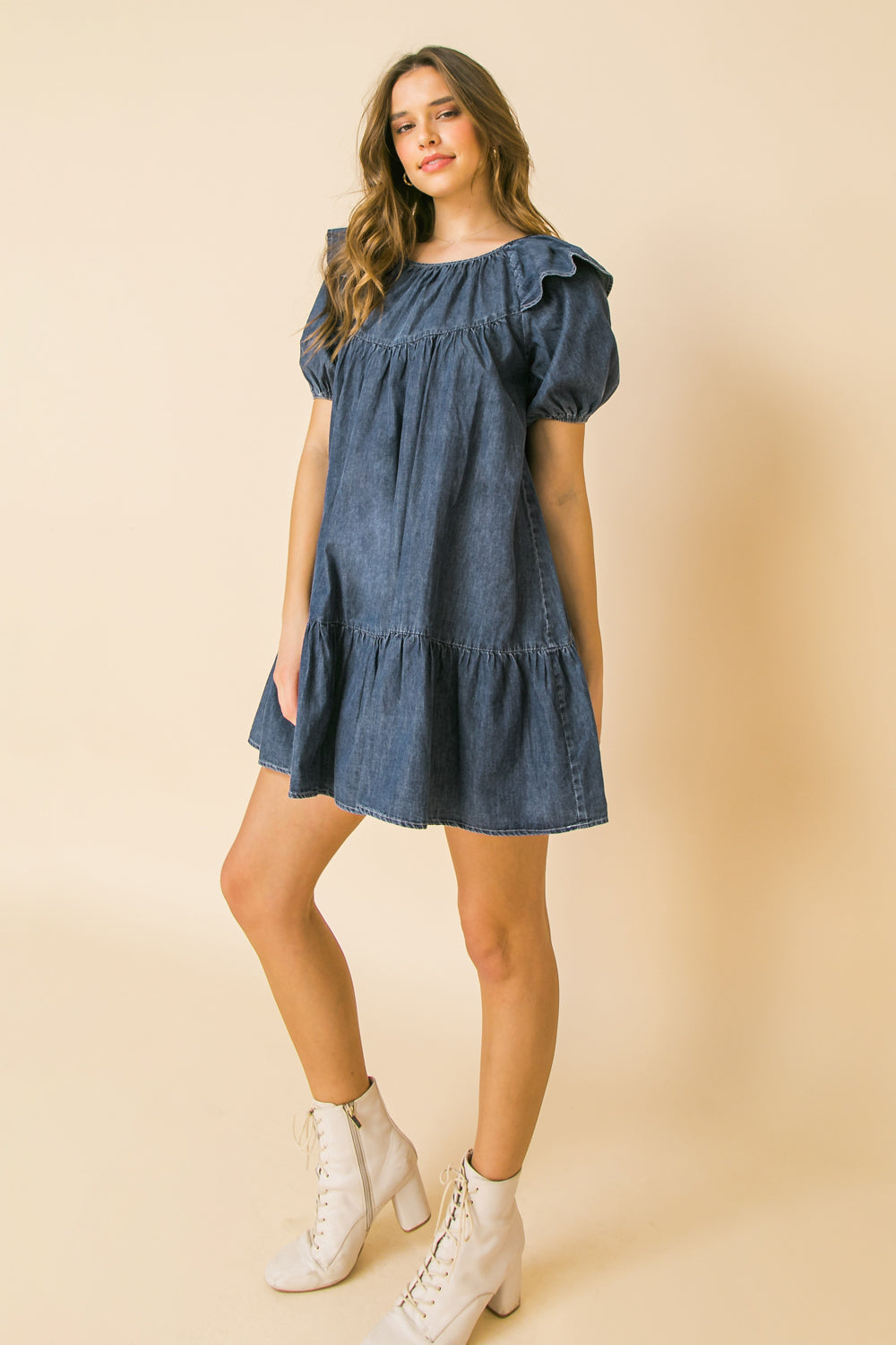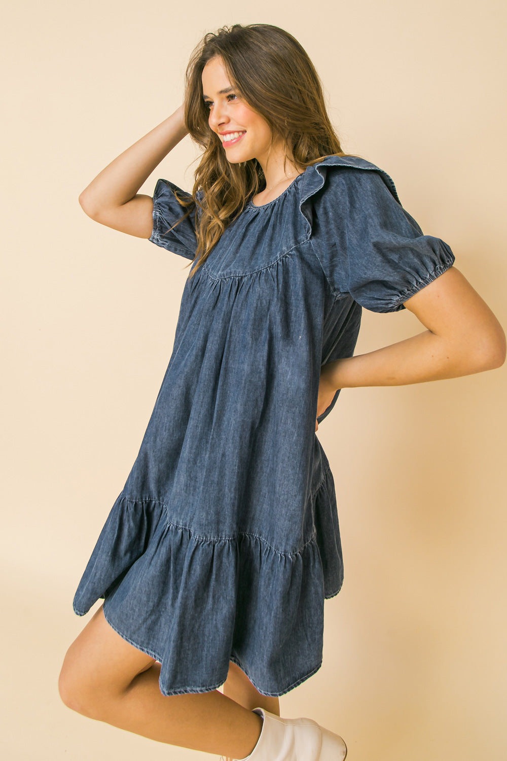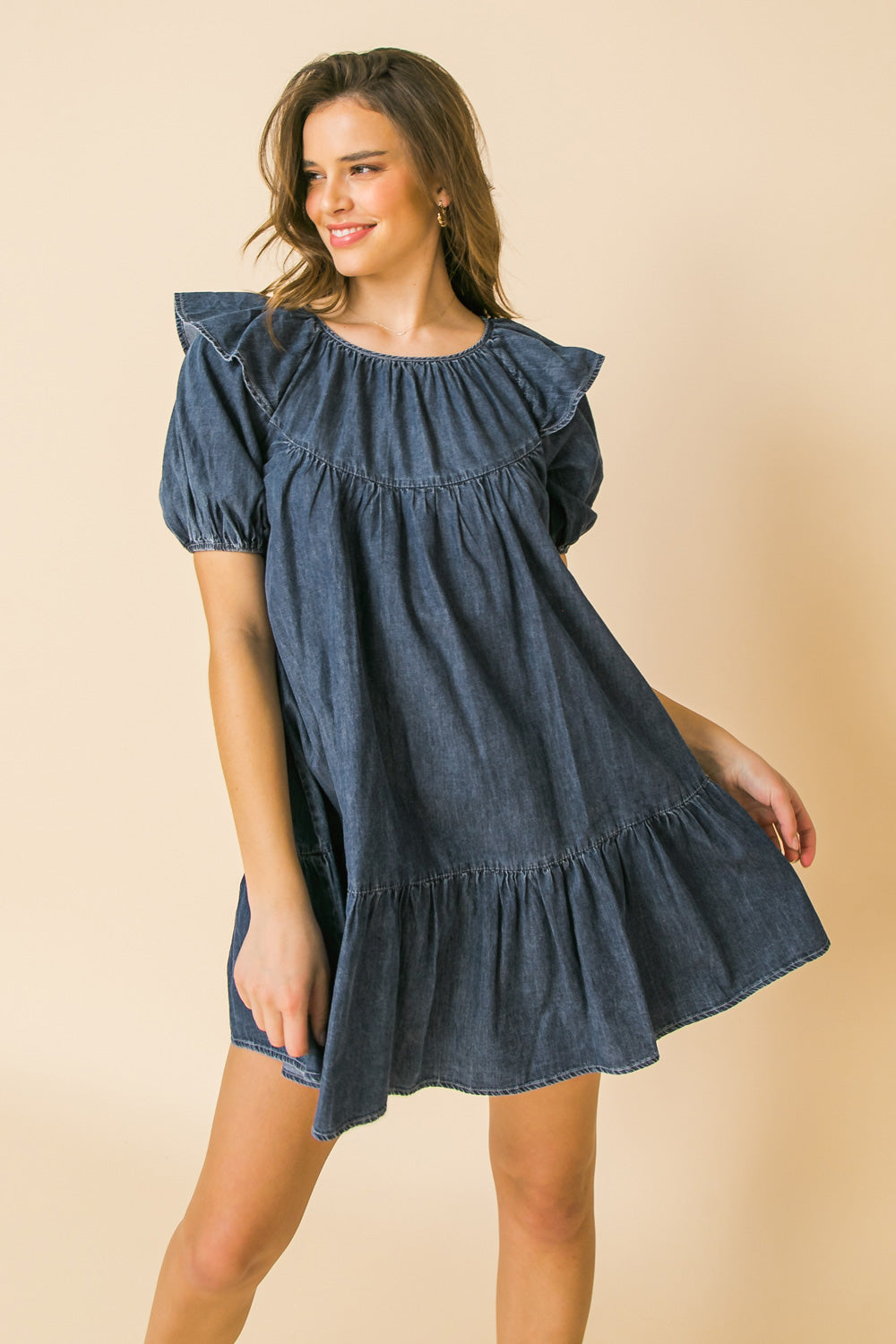 Look stylish and feel comfortable in the Cheerful Sights Denim Mini Dress. Crafted from lightweight denim, this stylish mini dress features a round neckline, ruffle at shoulder and puff sleeve for a flattering look. The perfect choice for any season, the dress is finished with ruffled hemline and keyhole button closure for a secure fit.