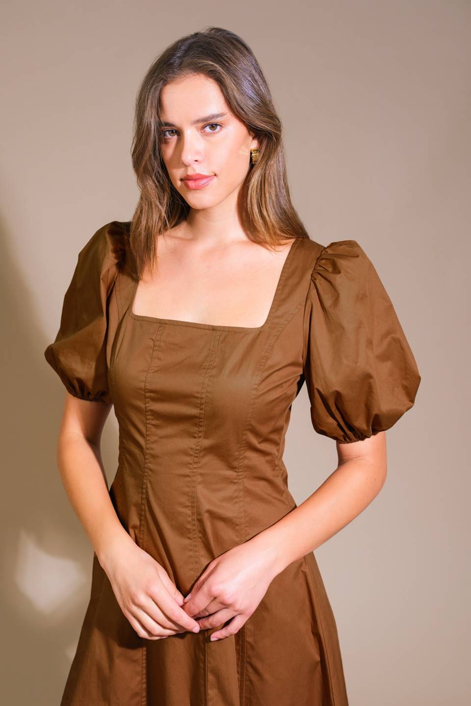 A solid woven midi dress featuring shirt collar, button down, short sleeve, pleated body and elasticized waist with self sash tie