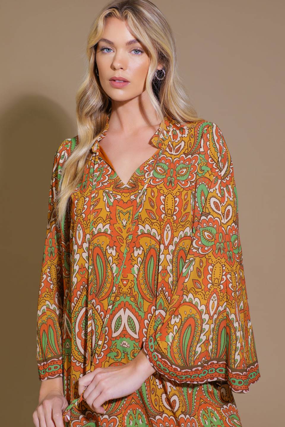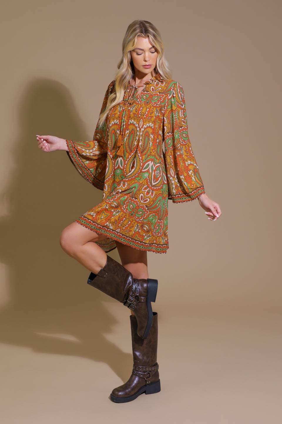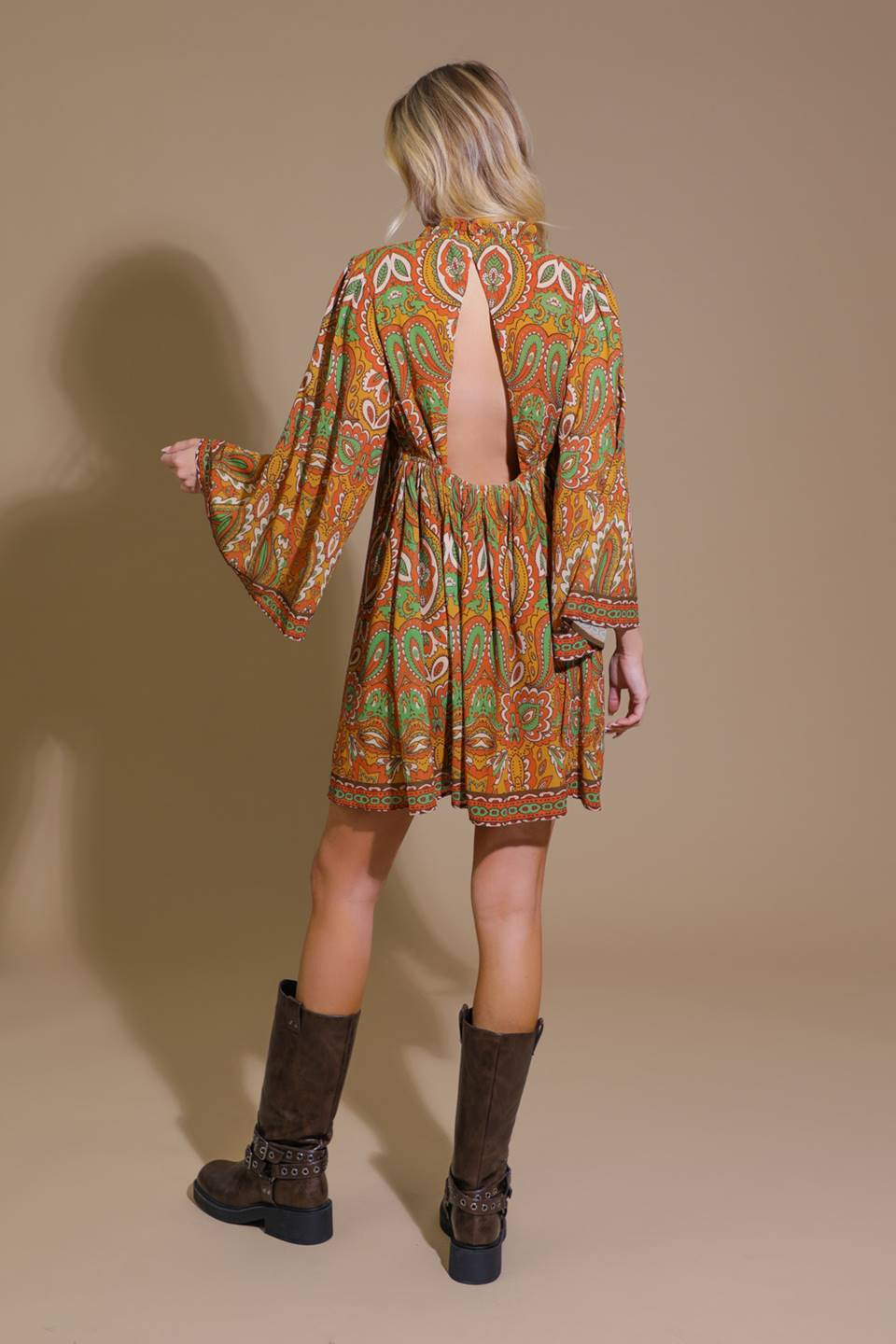 A printed woven mini dress featuring ruffled neckline with tie/tassel, long bell sleeve and cut out back