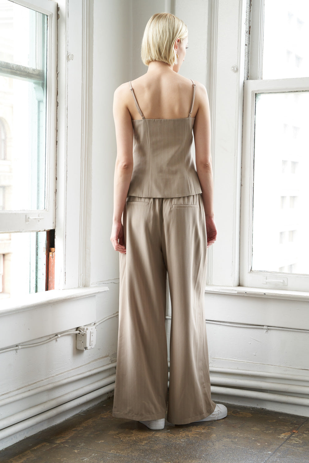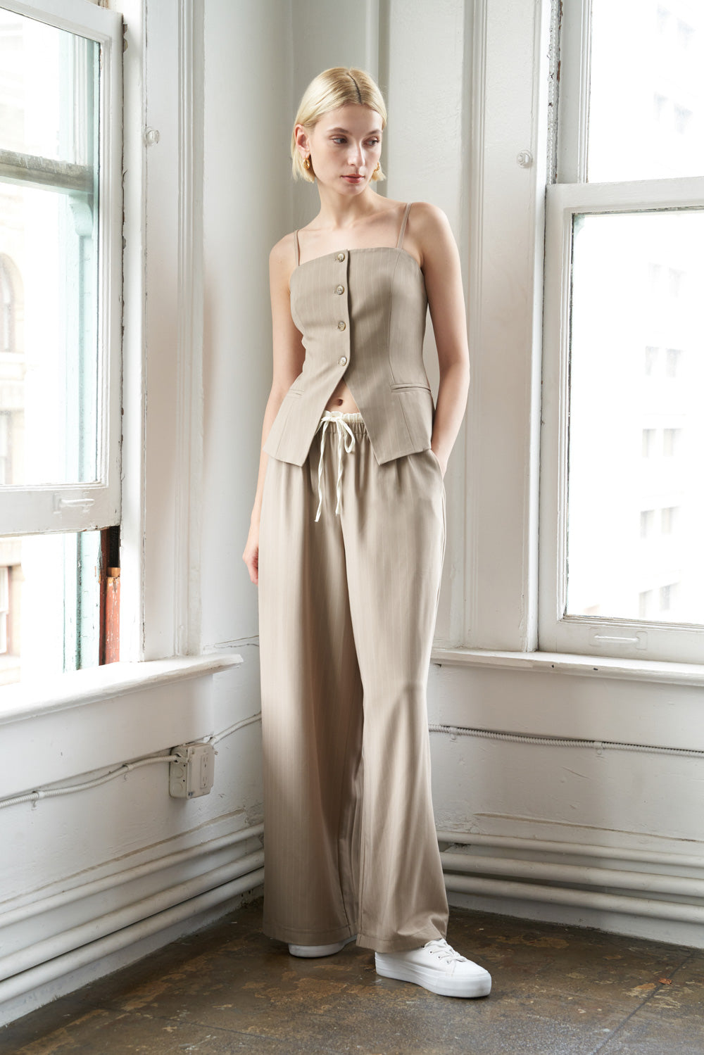 A Striped woven top featuring straight neckline, adjustable straps, button down and lip pocket. Matching pant FP1168