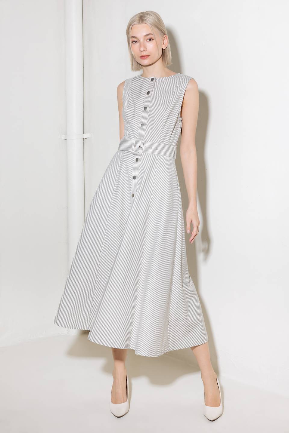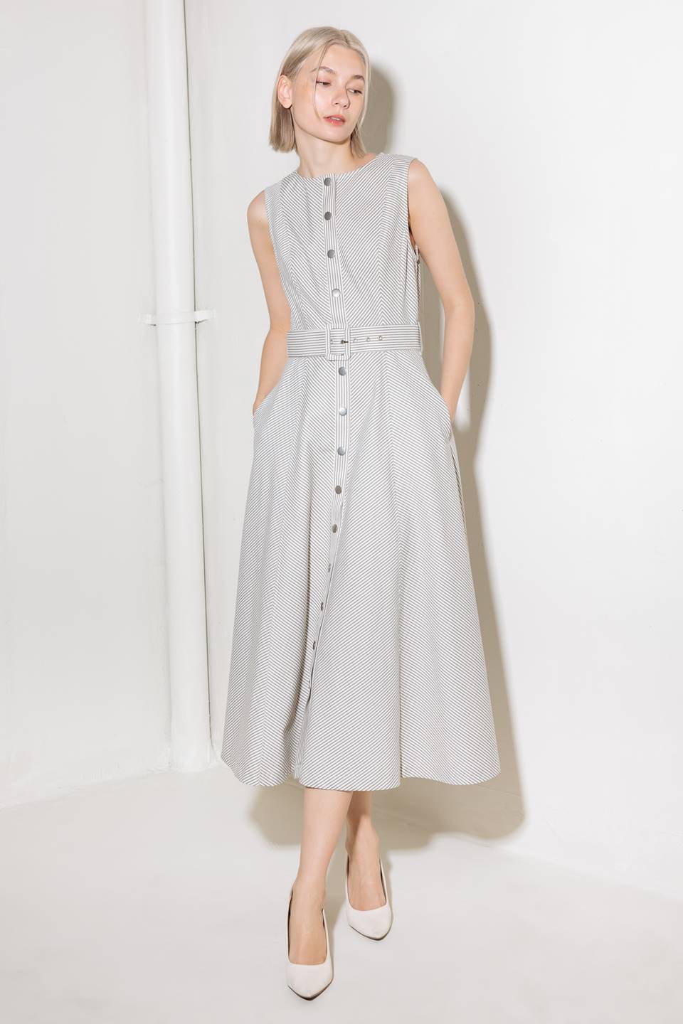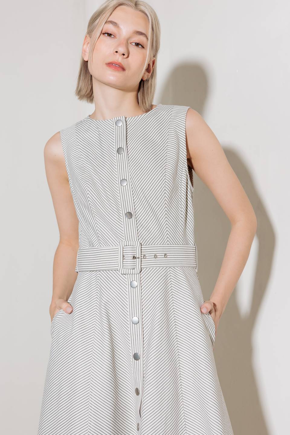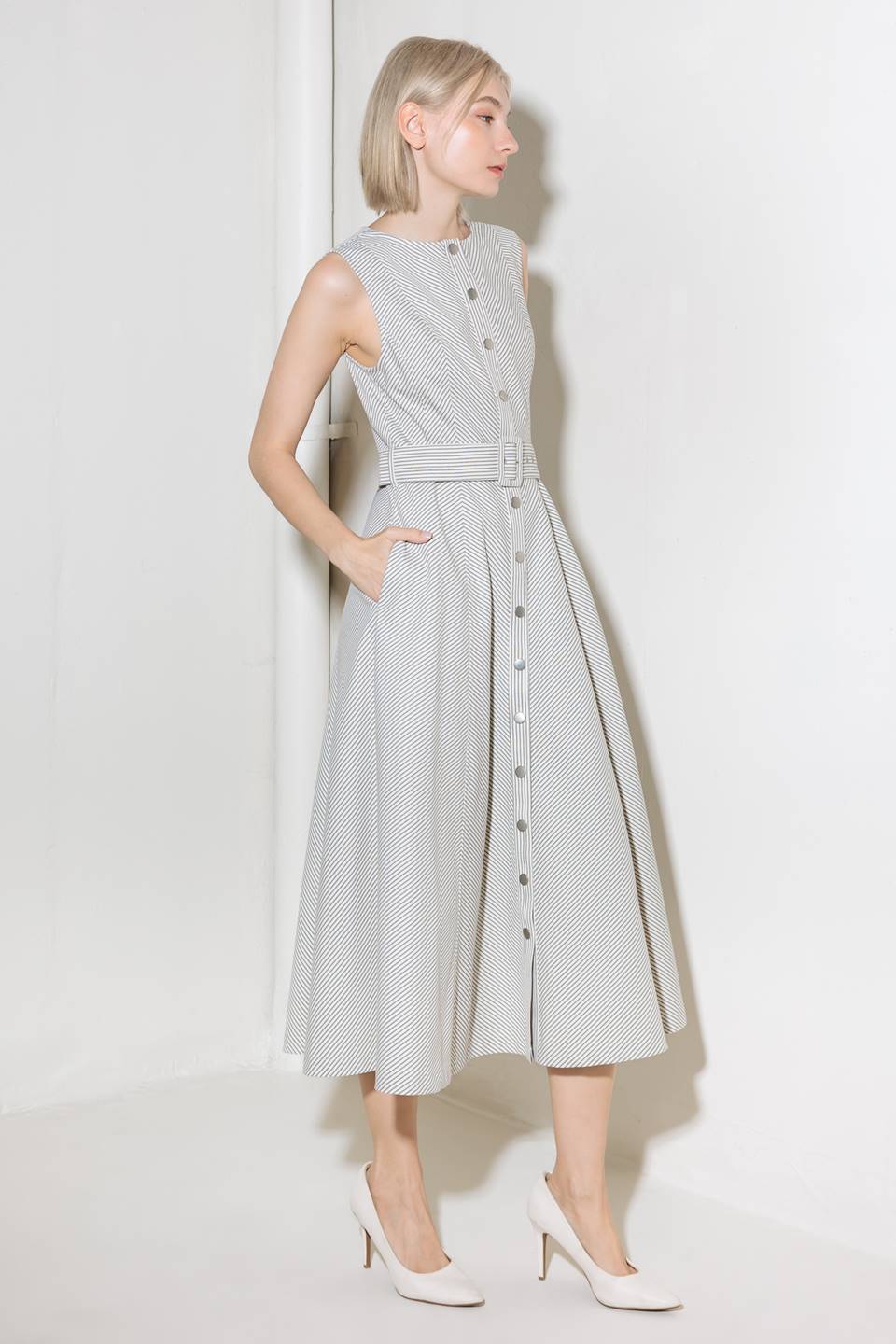 A striped woven midi dress featuring round neckline, sleeveless, button down, self belt and circle skirt with side pockets.