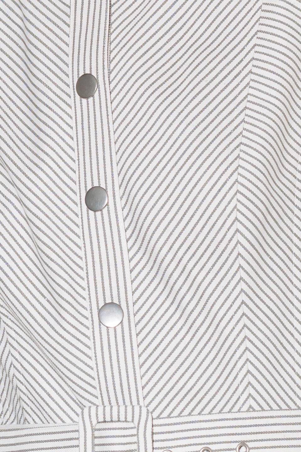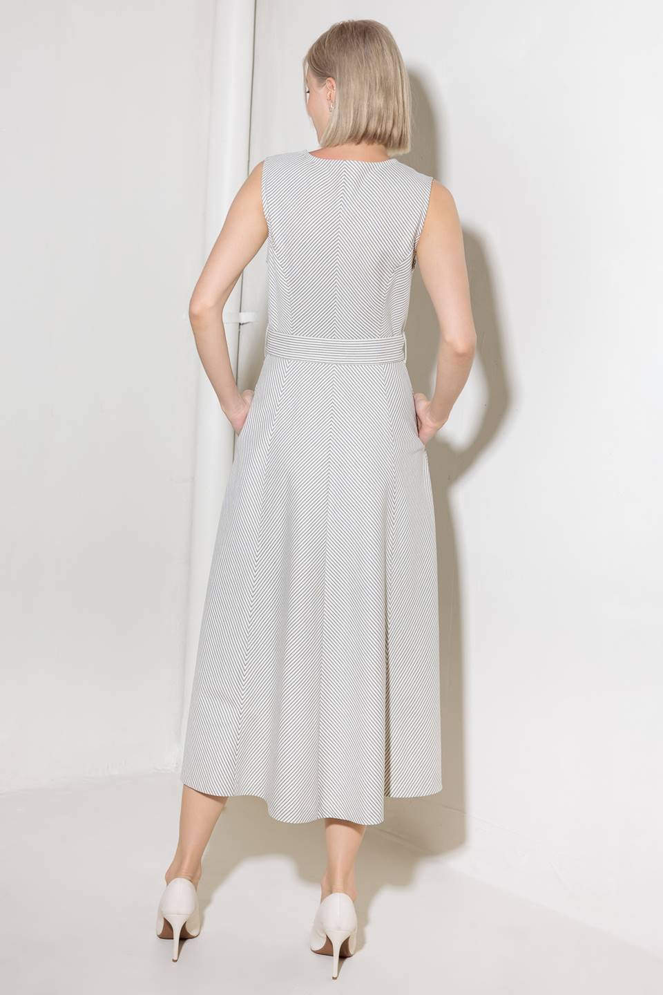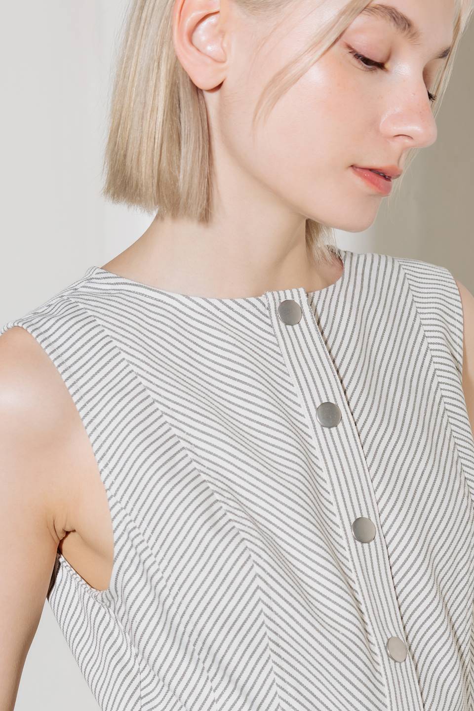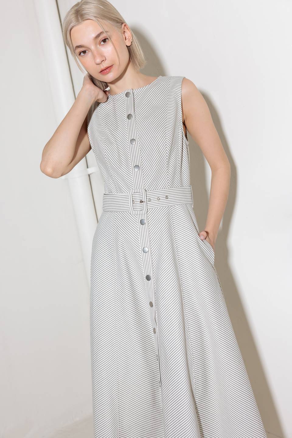 A striped woven midi dress featuring round neckline, sleeveless, button down, self belt and circle skirt with side pockets.
