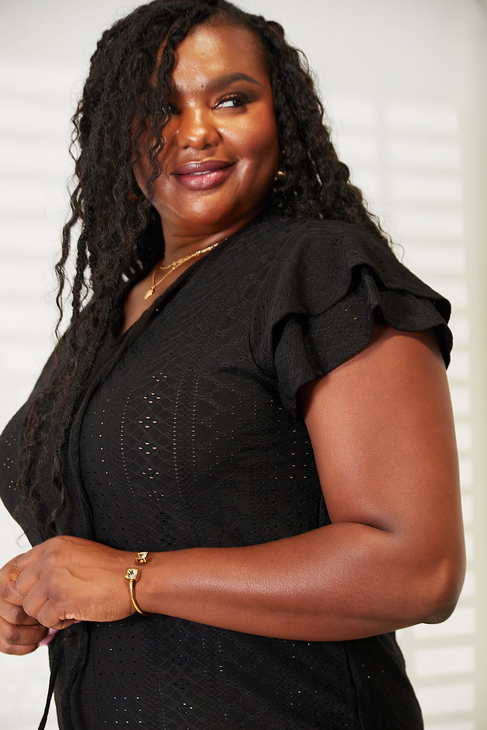 Double Take Eyelet Tie-Neck Flutter Sleeve Blouse