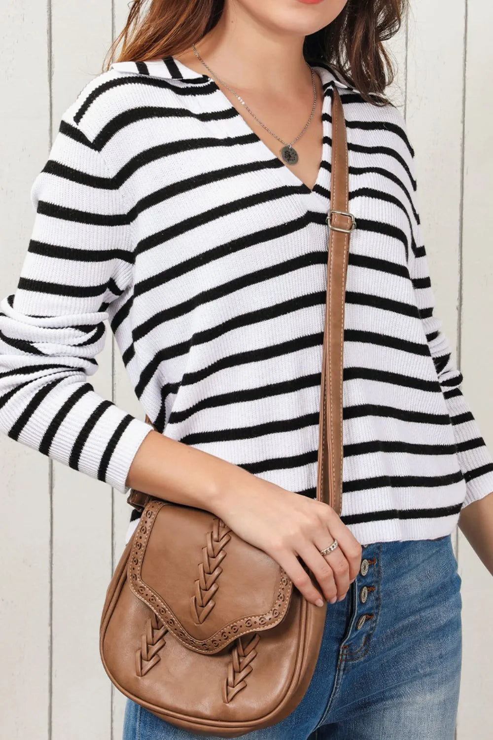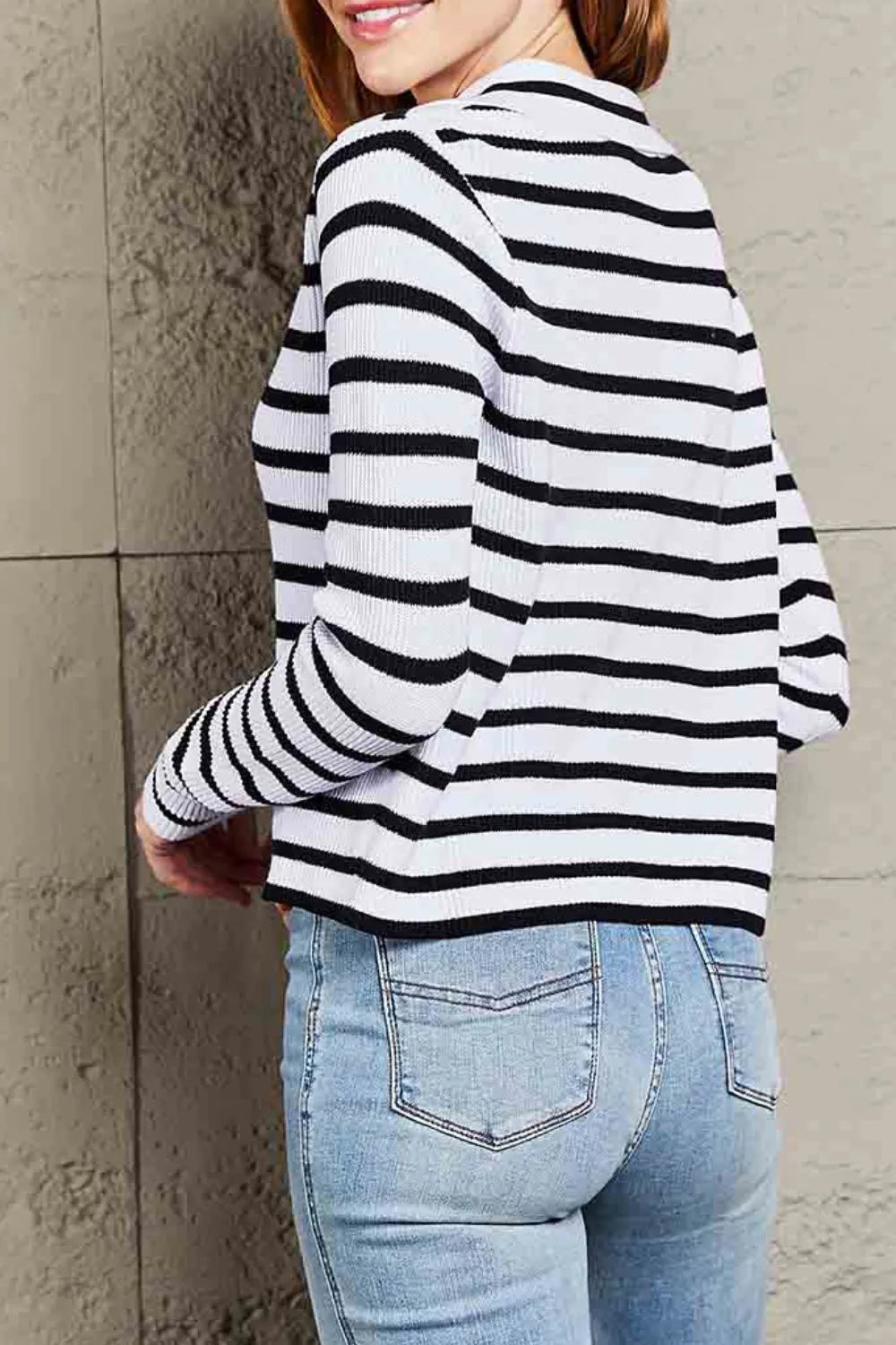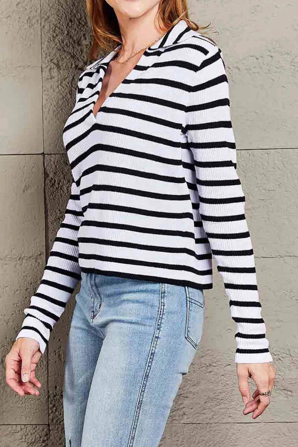 Double Take Striped Johnny Collar Long Sleeve Knit Top