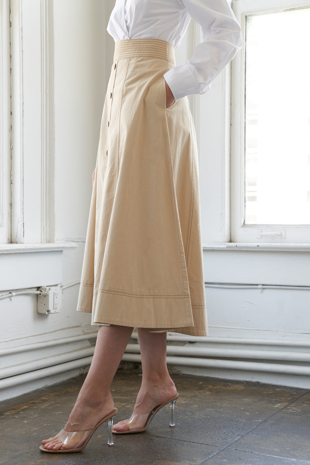 A solid full skirt with front button detail