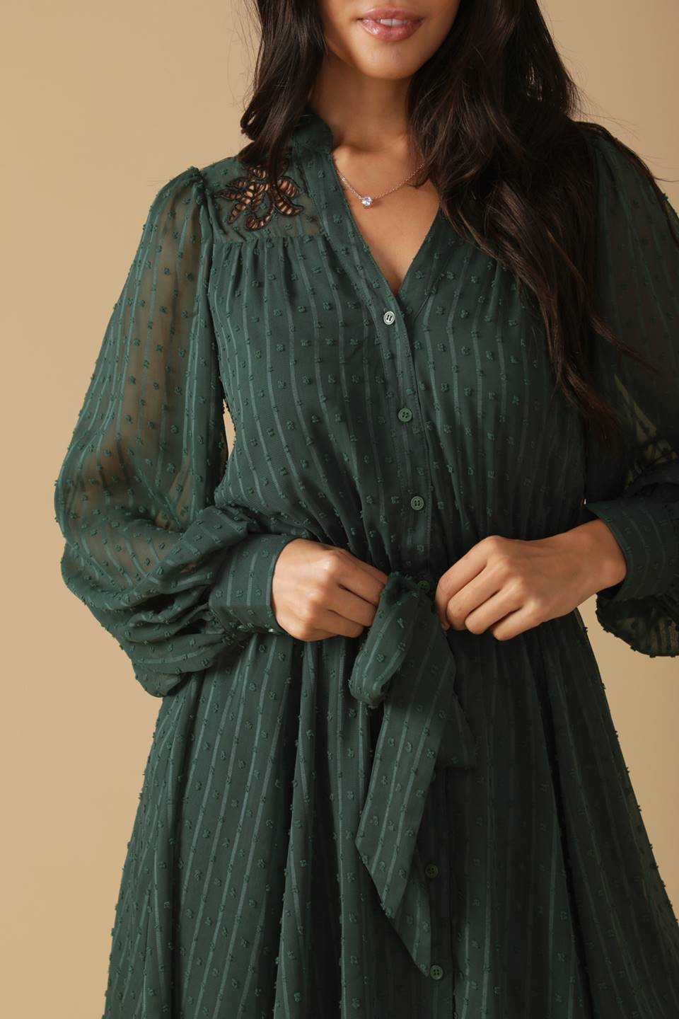 A textured woven mini dress featuring V neckline, embroidered yoke, long sleeve, elasticized waist with self sash belt and button down
