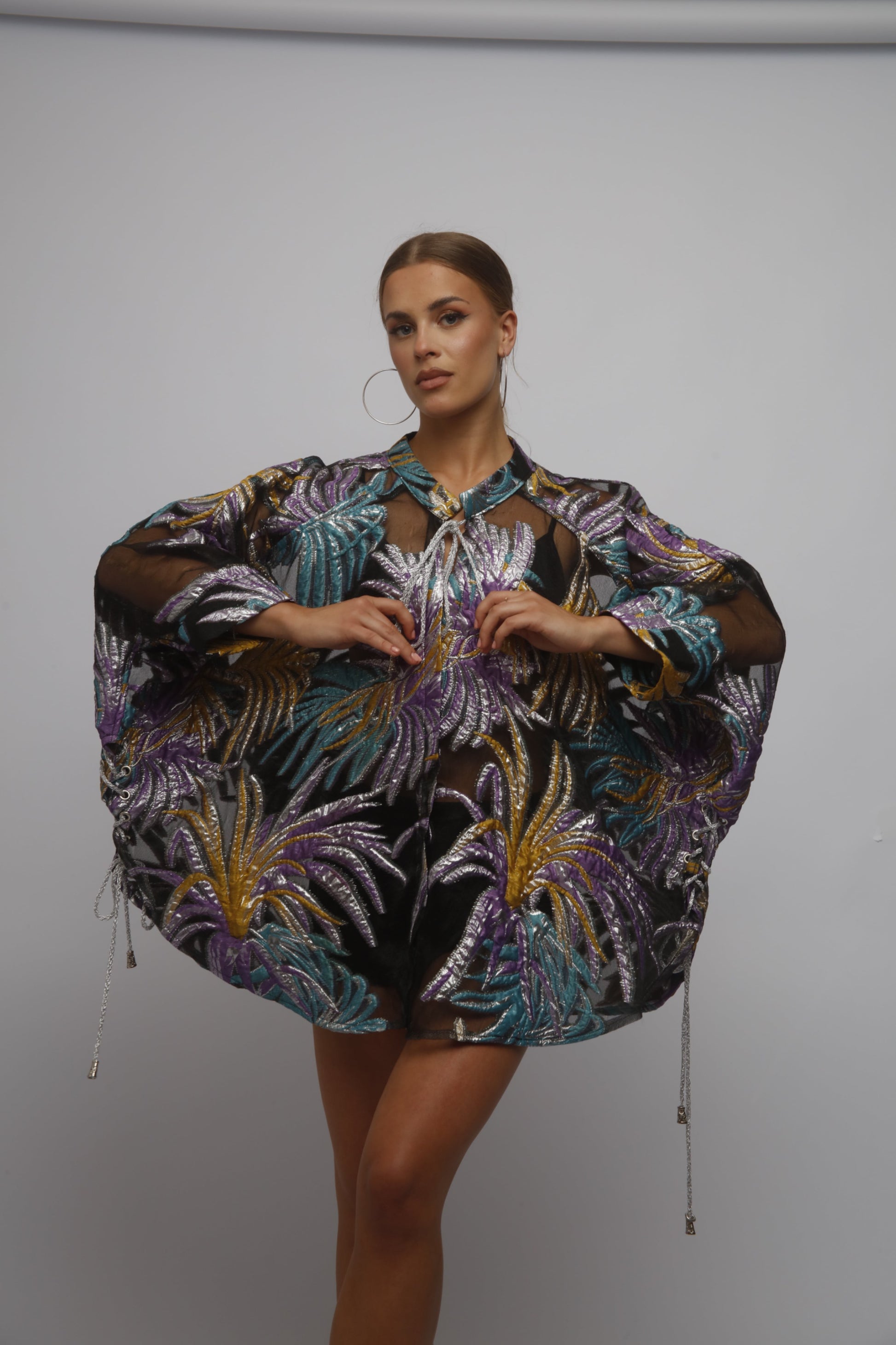 KIMONO WITH TRANSPARENT BROCADE FABRIC TIE AT THE COLLAR