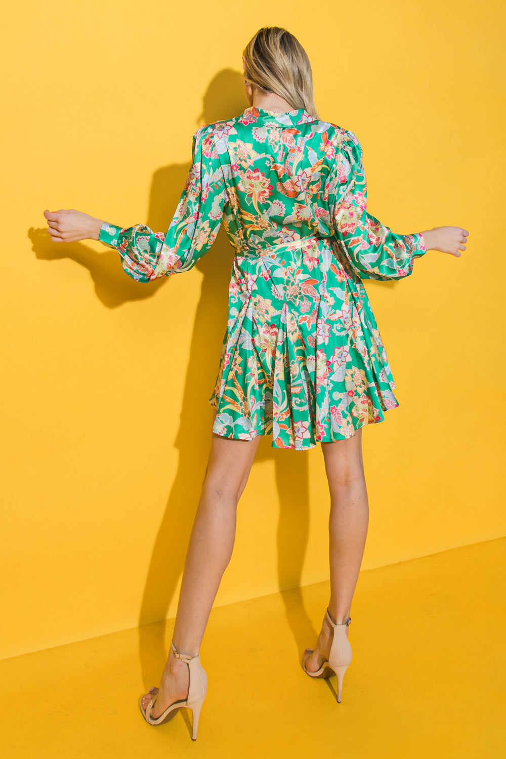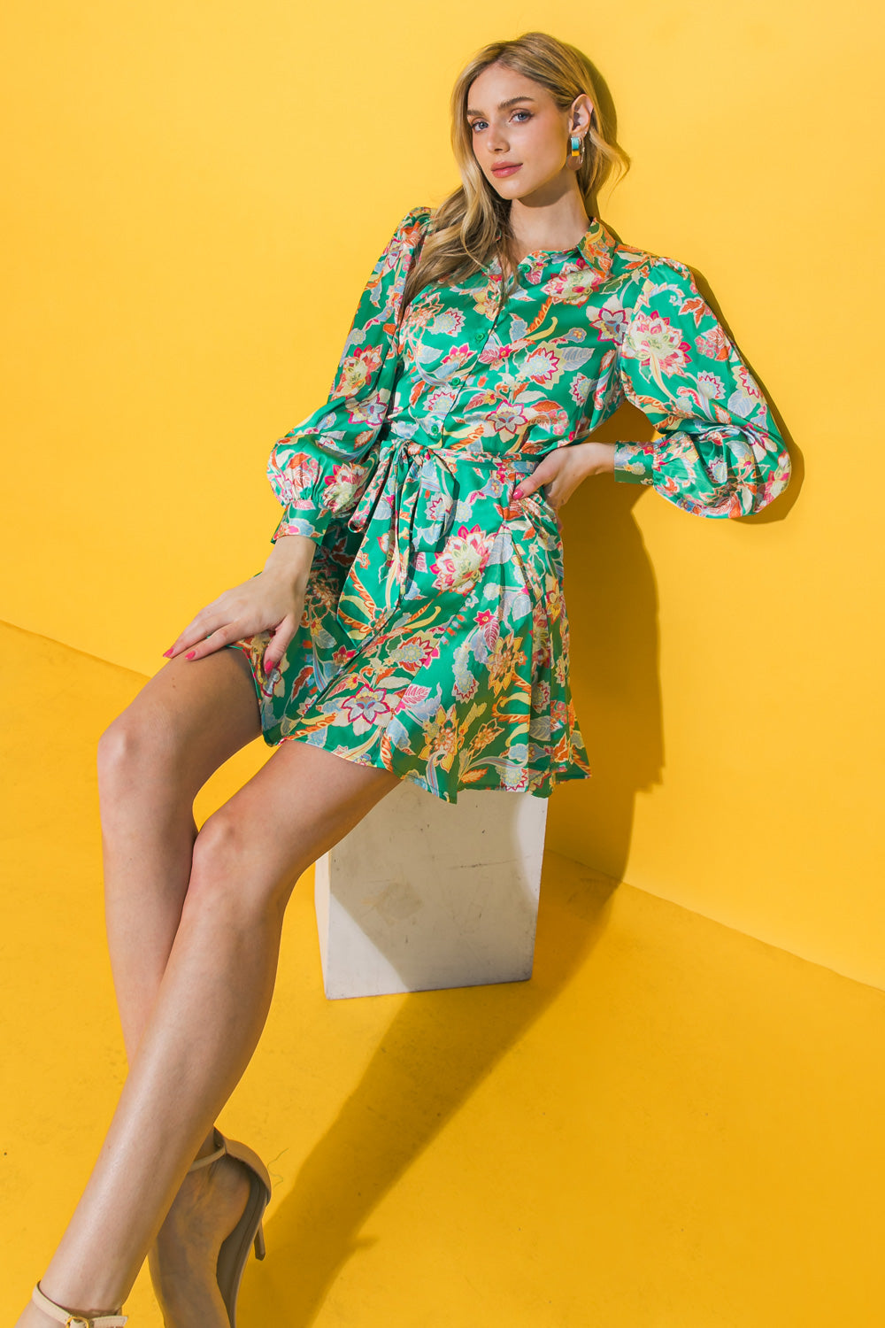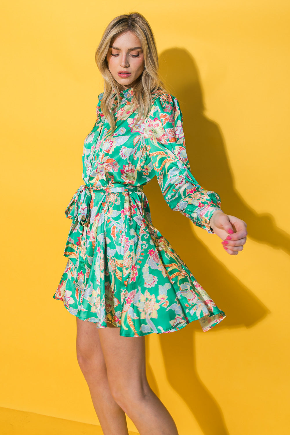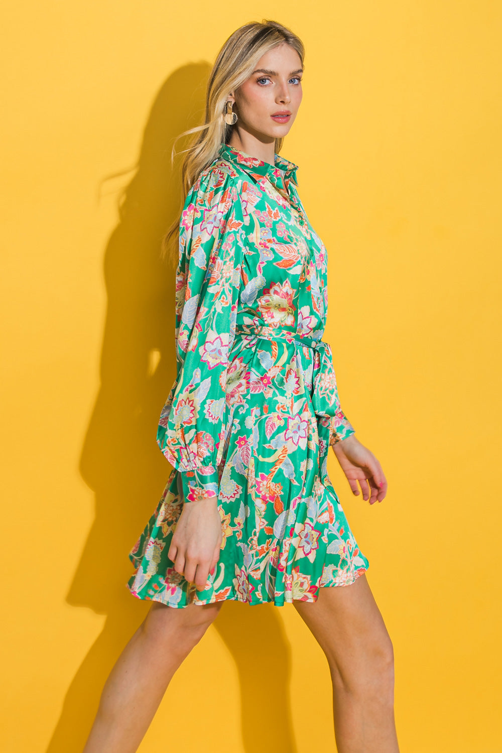 This FAIRYTALE LOVE SATIN MINI DRESS features a satin printed design, a shirt collar, peasant sleeve with cuff, button down, full skirt and self sash tie. Perfect for a special occasion, this sophisticated mini dress is sure to make you feel beautiful and comfortable. The full skirt design flows gracefully while the collar and cuff detailing adds an elegant flair to the look.