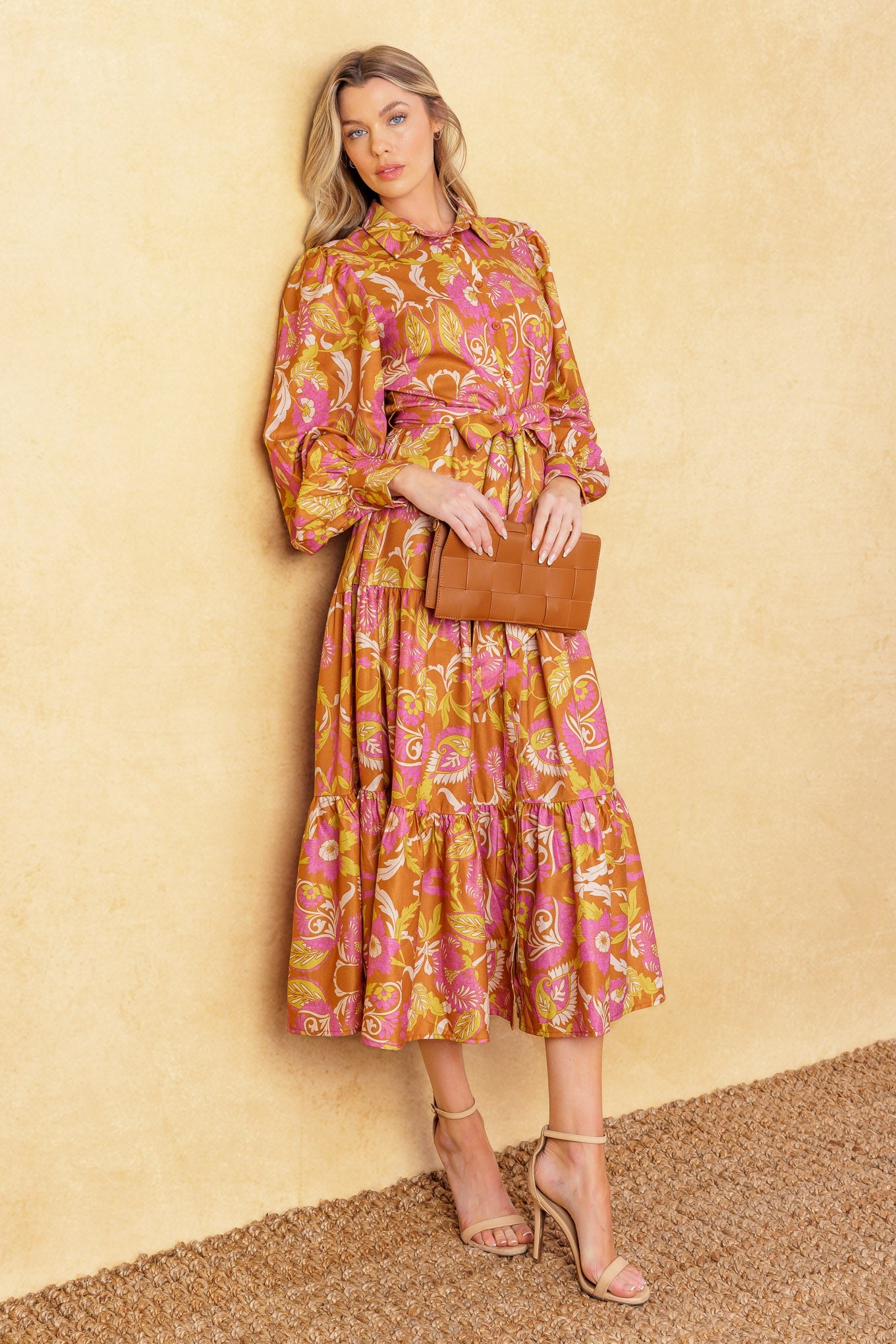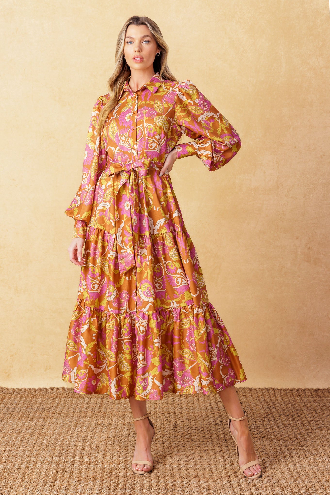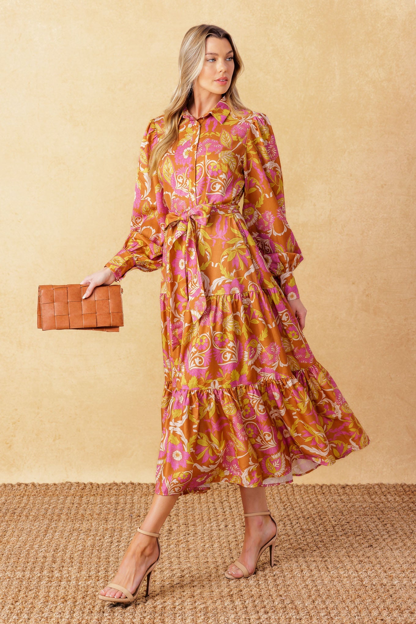 A printed woven midi dress featuring shirt collar, long sleeve, button down, self sash tie and tiered skirt