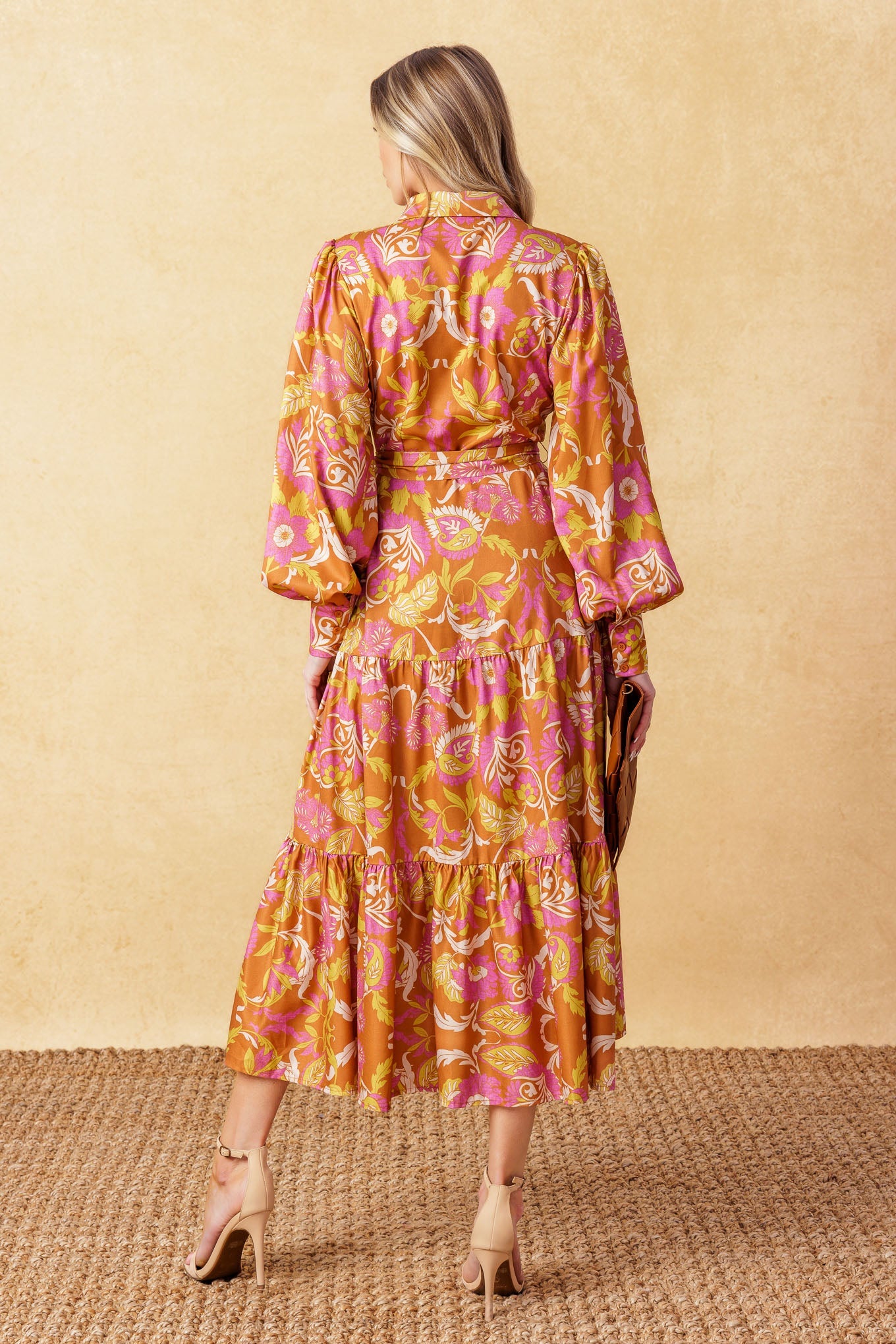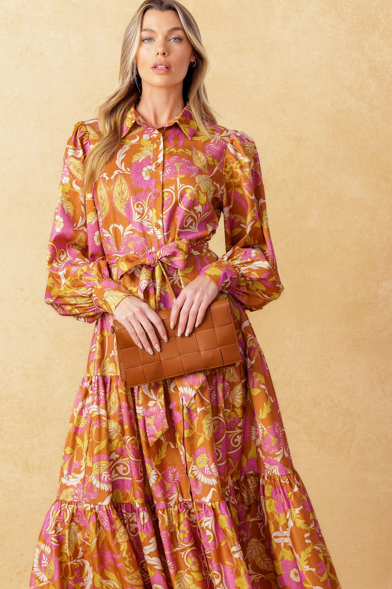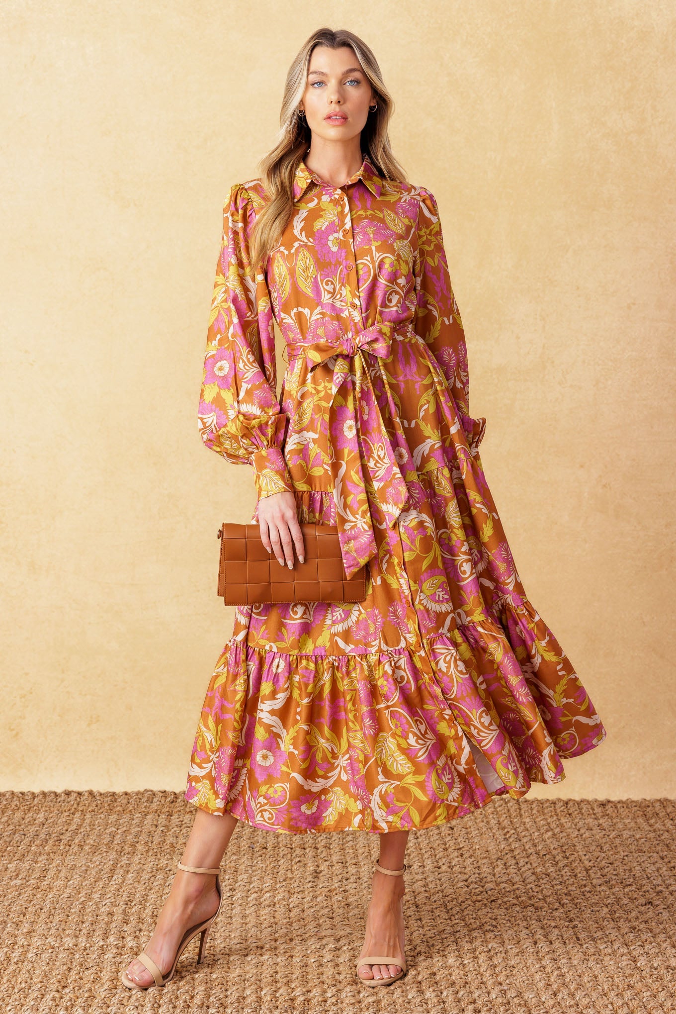 A printed woven midi dress featuring shirt collar, long sleeve, button down, self sash tie and tiered skirt