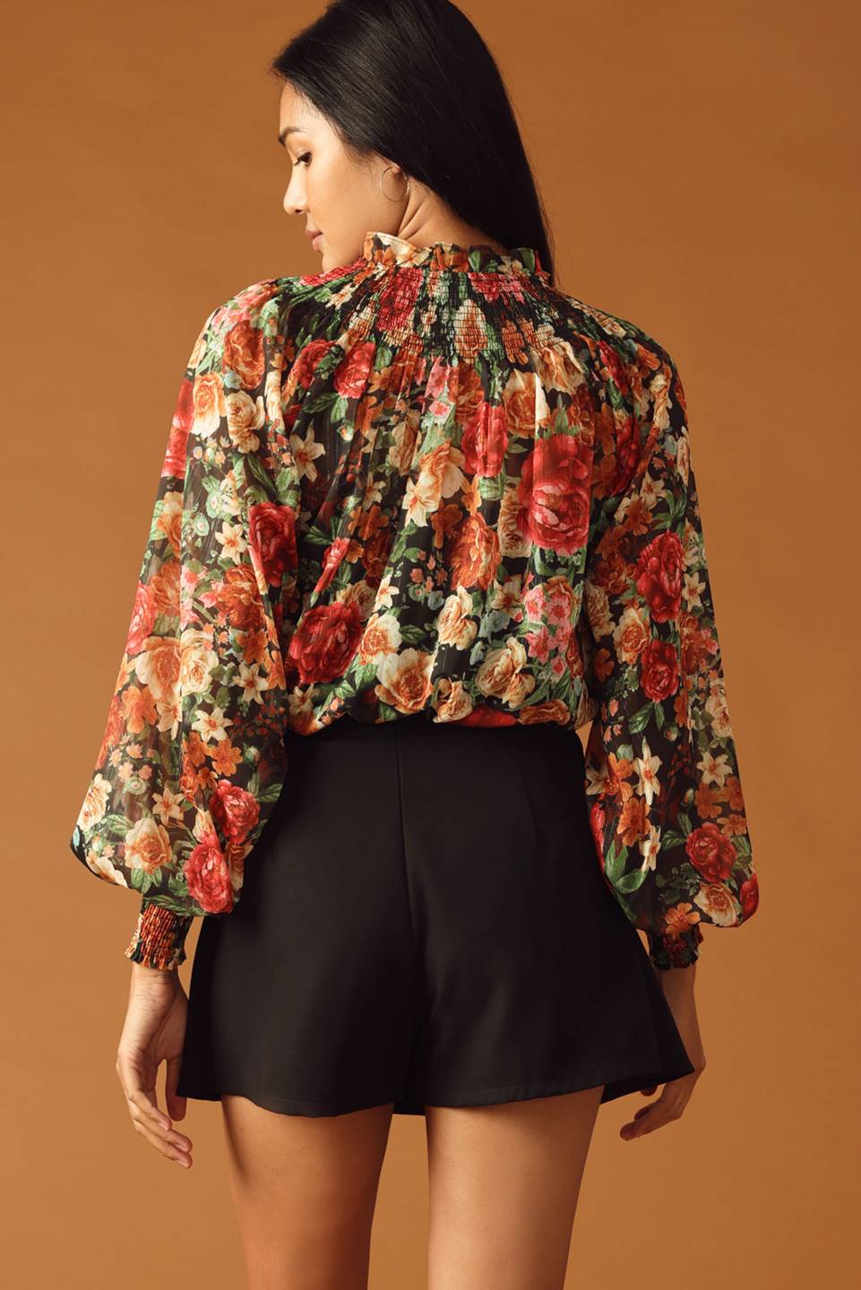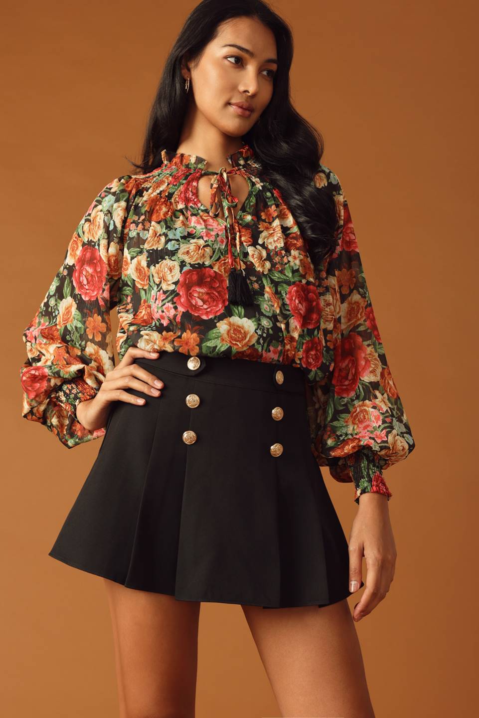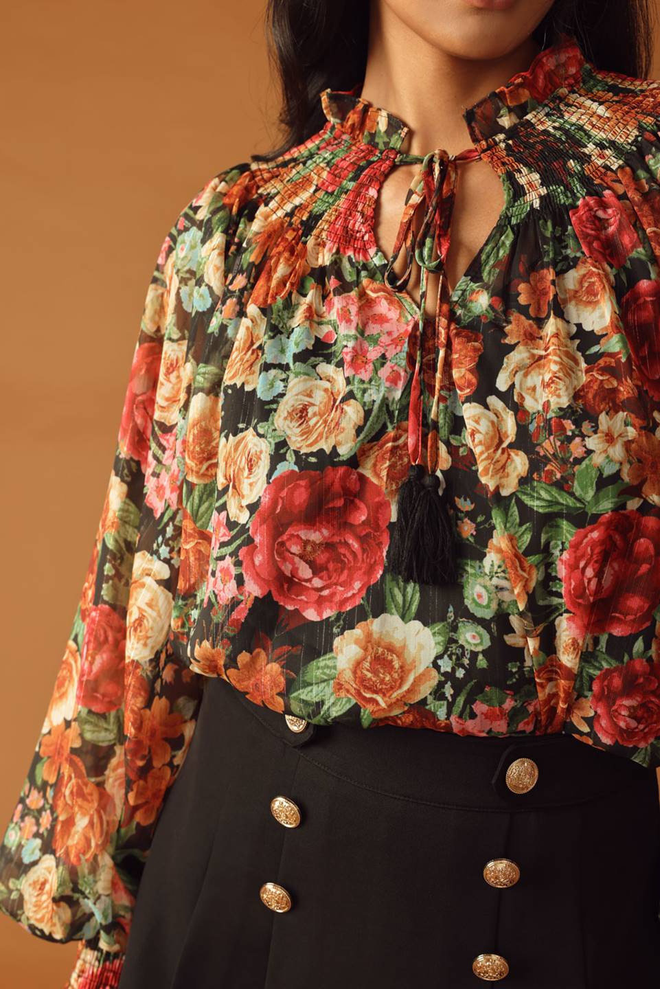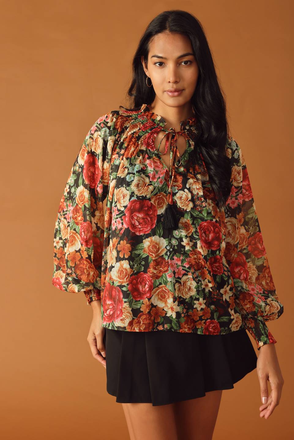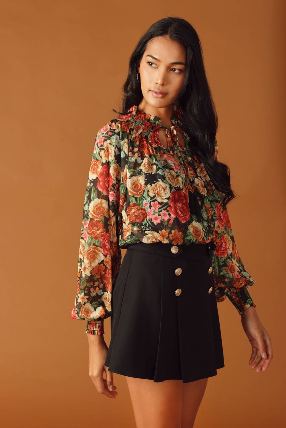 A printed woven top featuring high neckline, peasant sleeve with smocked cuff and front tie detail