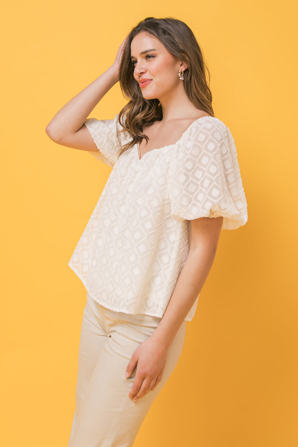 The Forever Your Girl Woven Top offers a stylish and contemporary look with its textured solid woven fabric, sweetheart neckline, puff short sleeves, square back, and loose fit. Perfect for your everyday style.