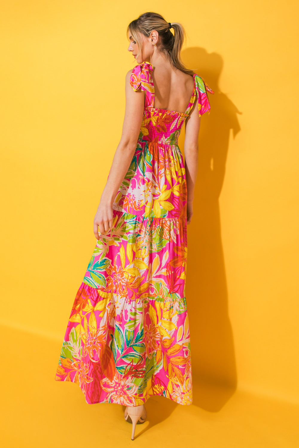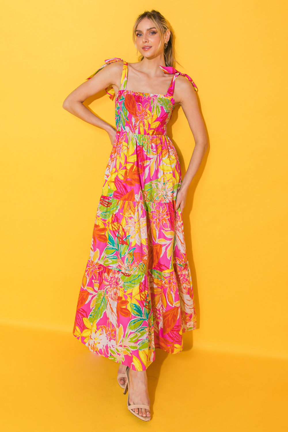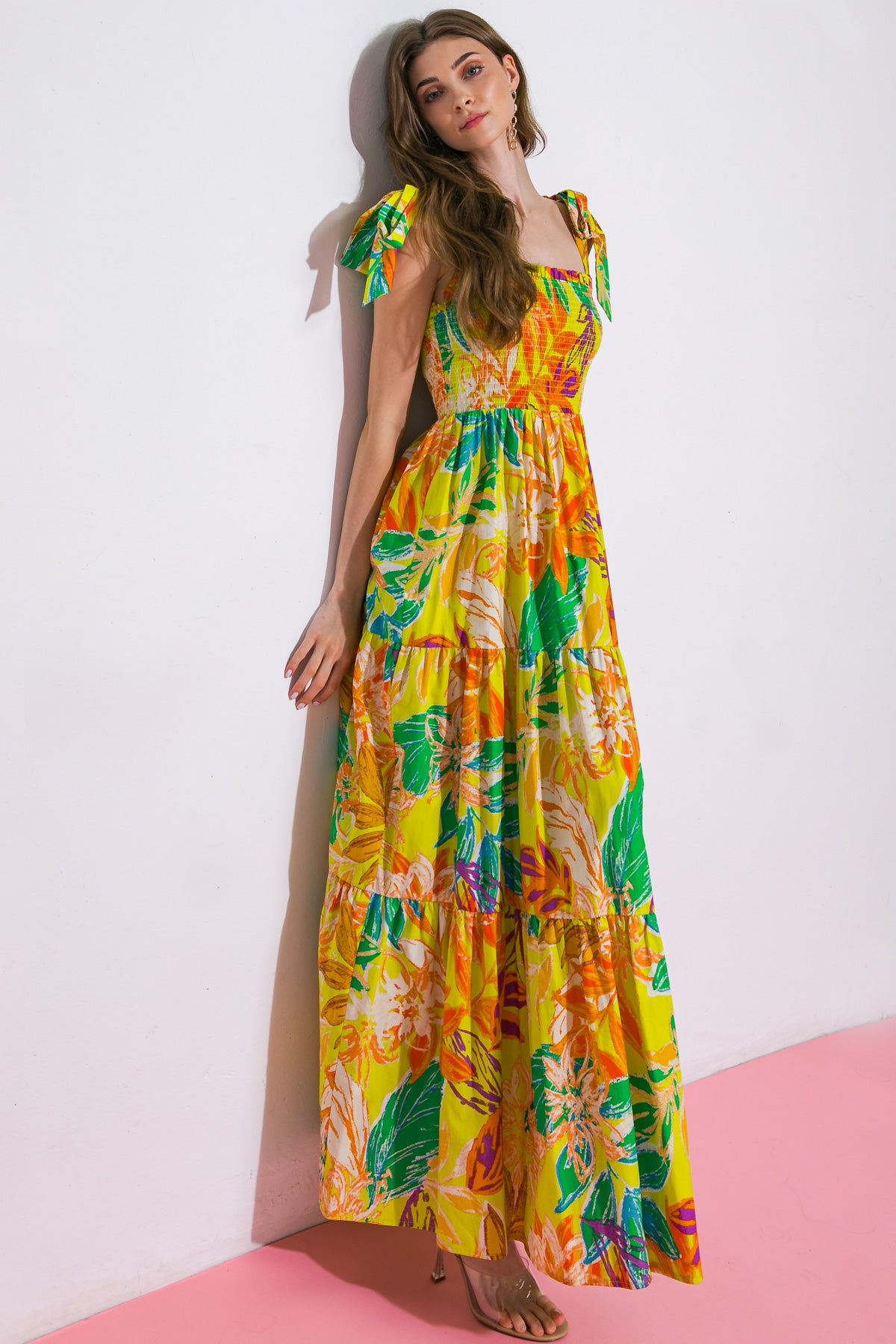 The Forget Your Troubles Poplin Maxi Dress is made of high-quality poplin fabric with a straight neckline and ruffled edges for a classic and sophisticated look. It features a smocked bodice and a tiered skirt, all designed to provide a comfortable fit. With its beautiful print, this dress is perfect for events, parties, or just a casual day out.