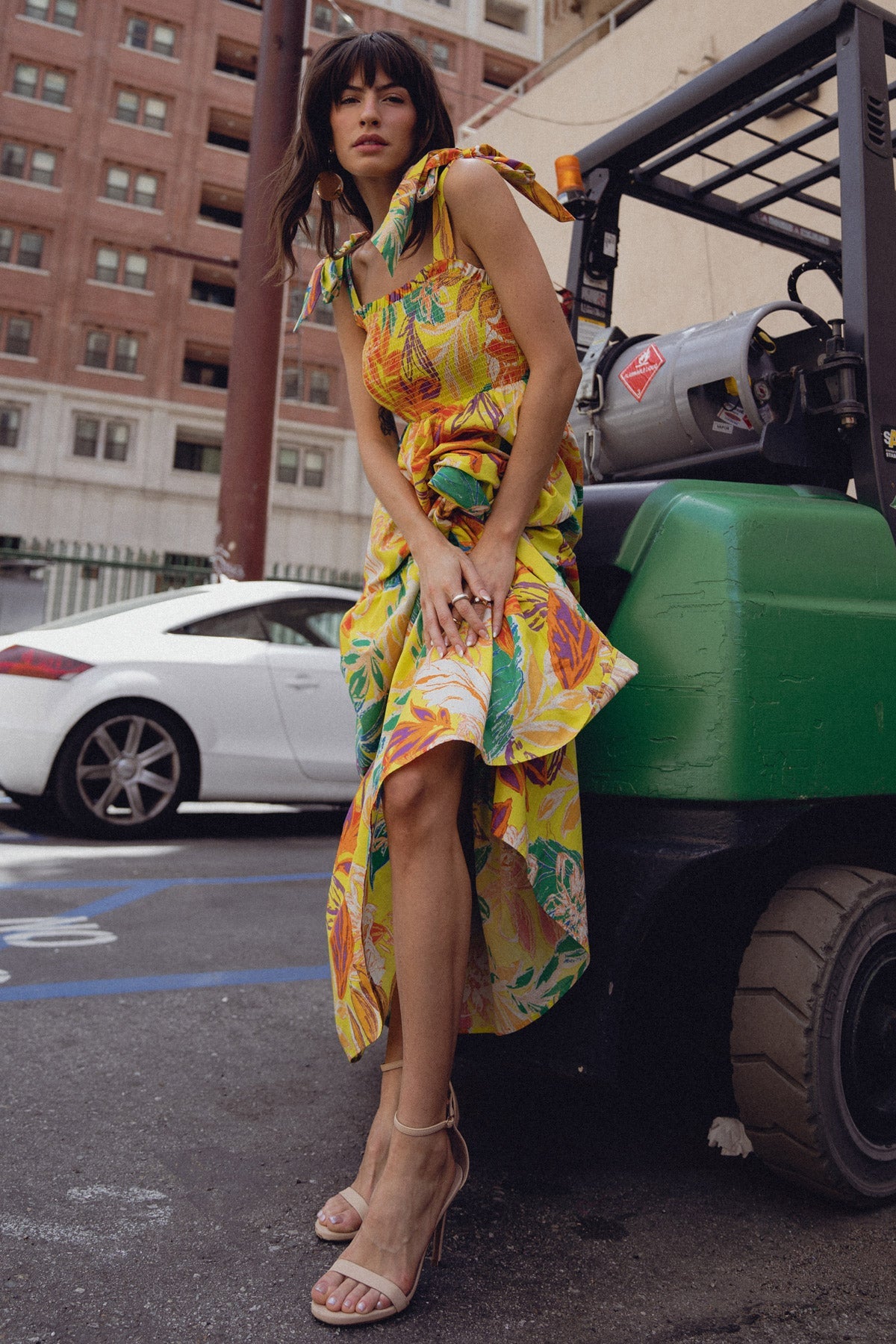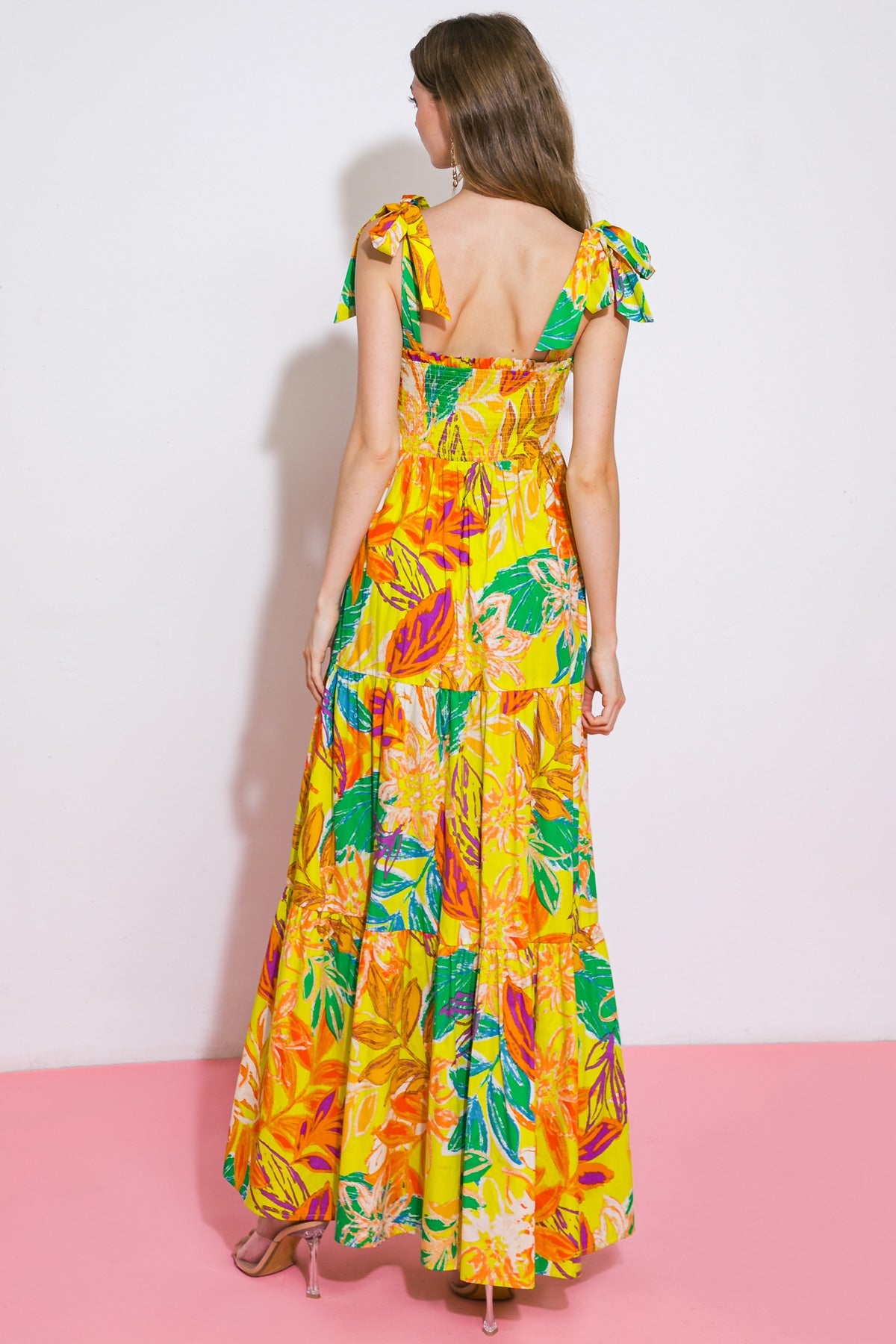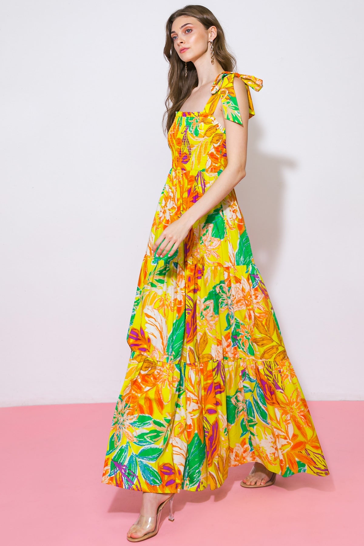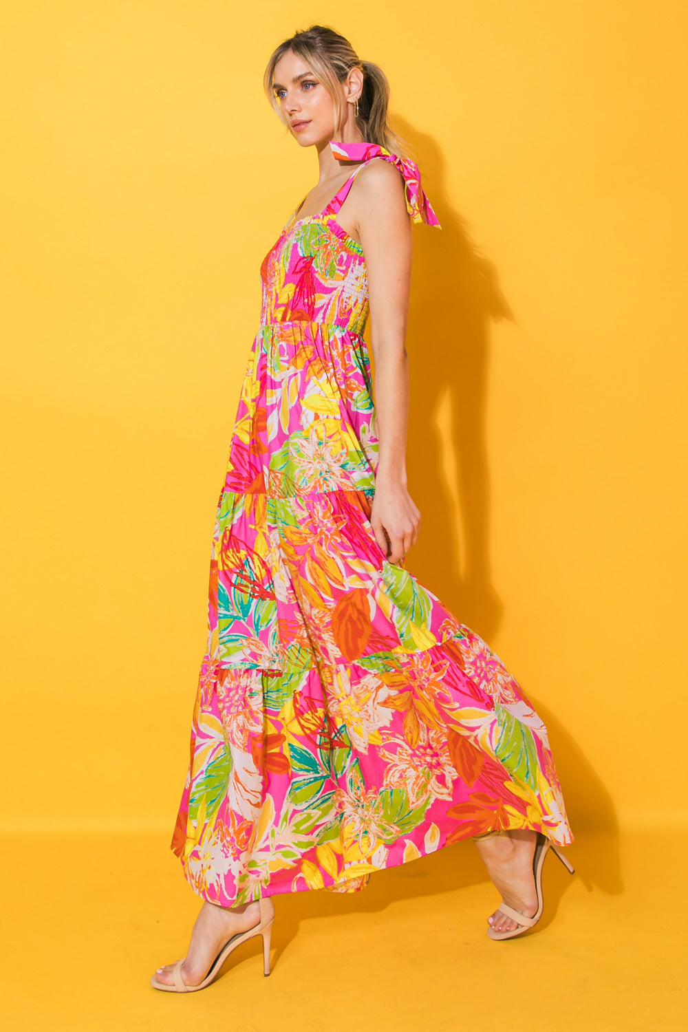 The Forget Your Troubles Poplin Maxi Dress is made of high-quality poplin fabric with a straight neckline and ruffled edges for a classic and sophisticated look. It features a smocked bodice and a tiered skirt, all designed to provide a comfortable fit. With its beautiful print, this dress is perfect for events, parties, or just a casual day out.