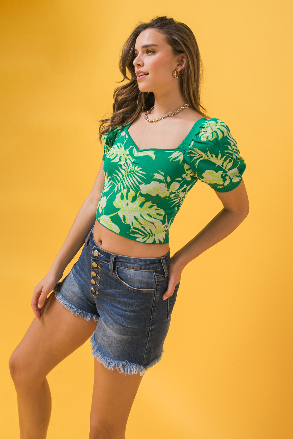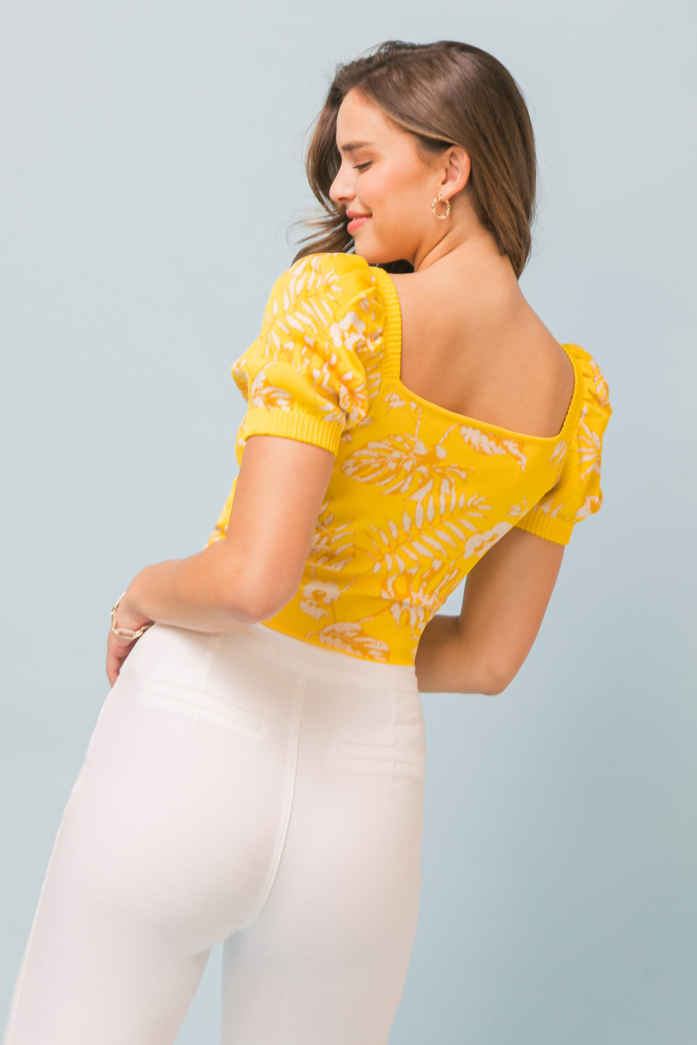 A jacquard sweater top featuring V neckline, short puff sleeve, square back and body contouring