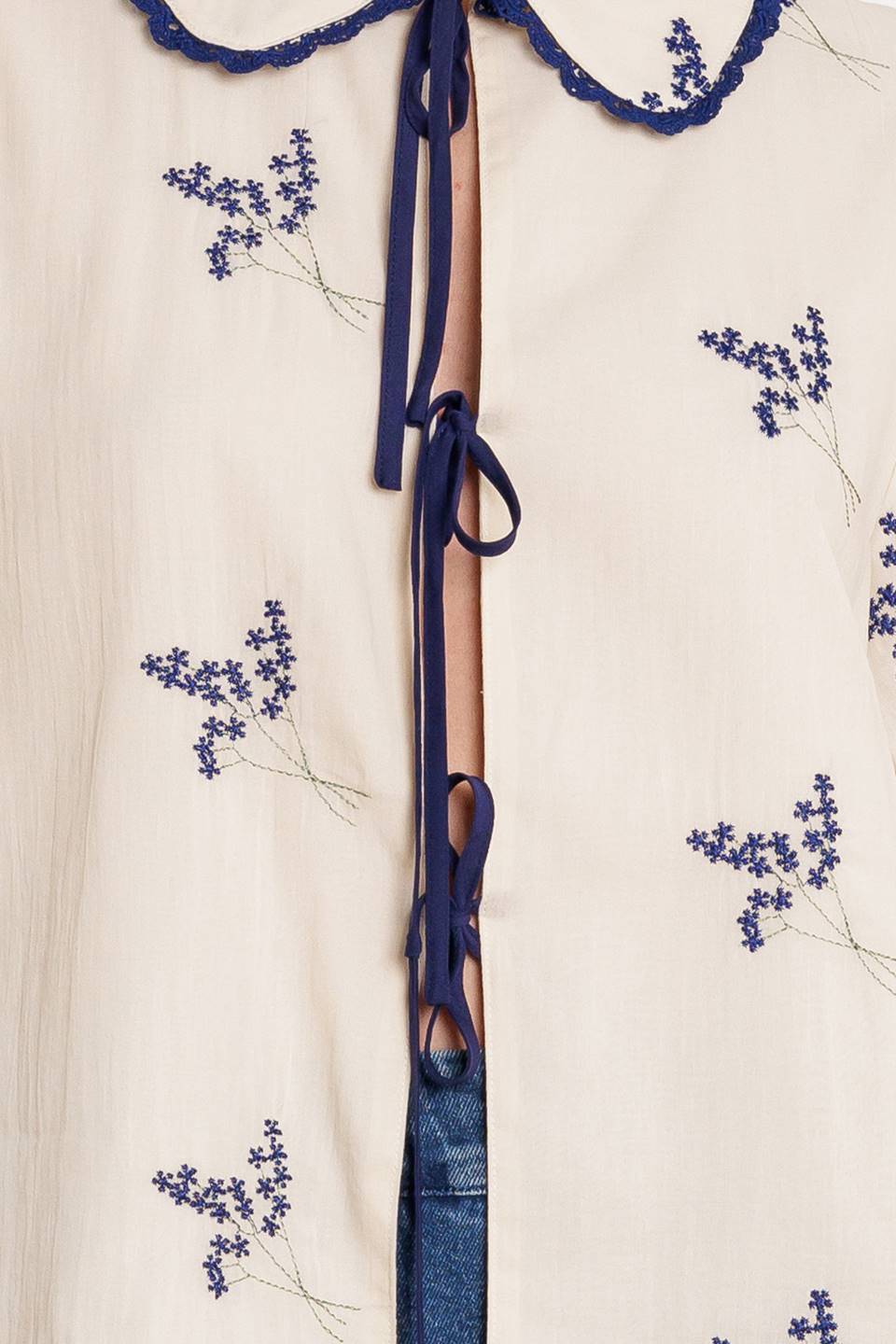 A solid woven embroidered top featuring round collar with lace edge, short puff sleeve and front bow tie closure