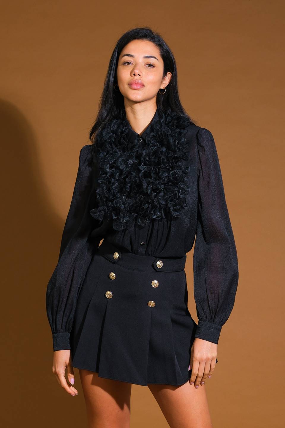 A solid woven top featuring shirt collar, button down, floral embellished front and long sleeve