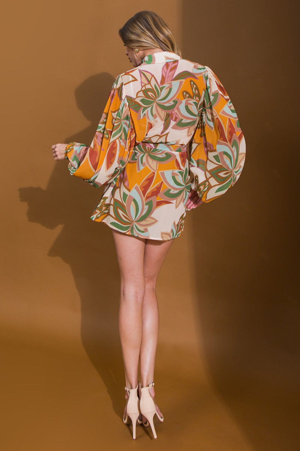 A printed woven tunic top featuring shirt collar, button down, exaggerated sleeve with smocked cuff and self sash tie