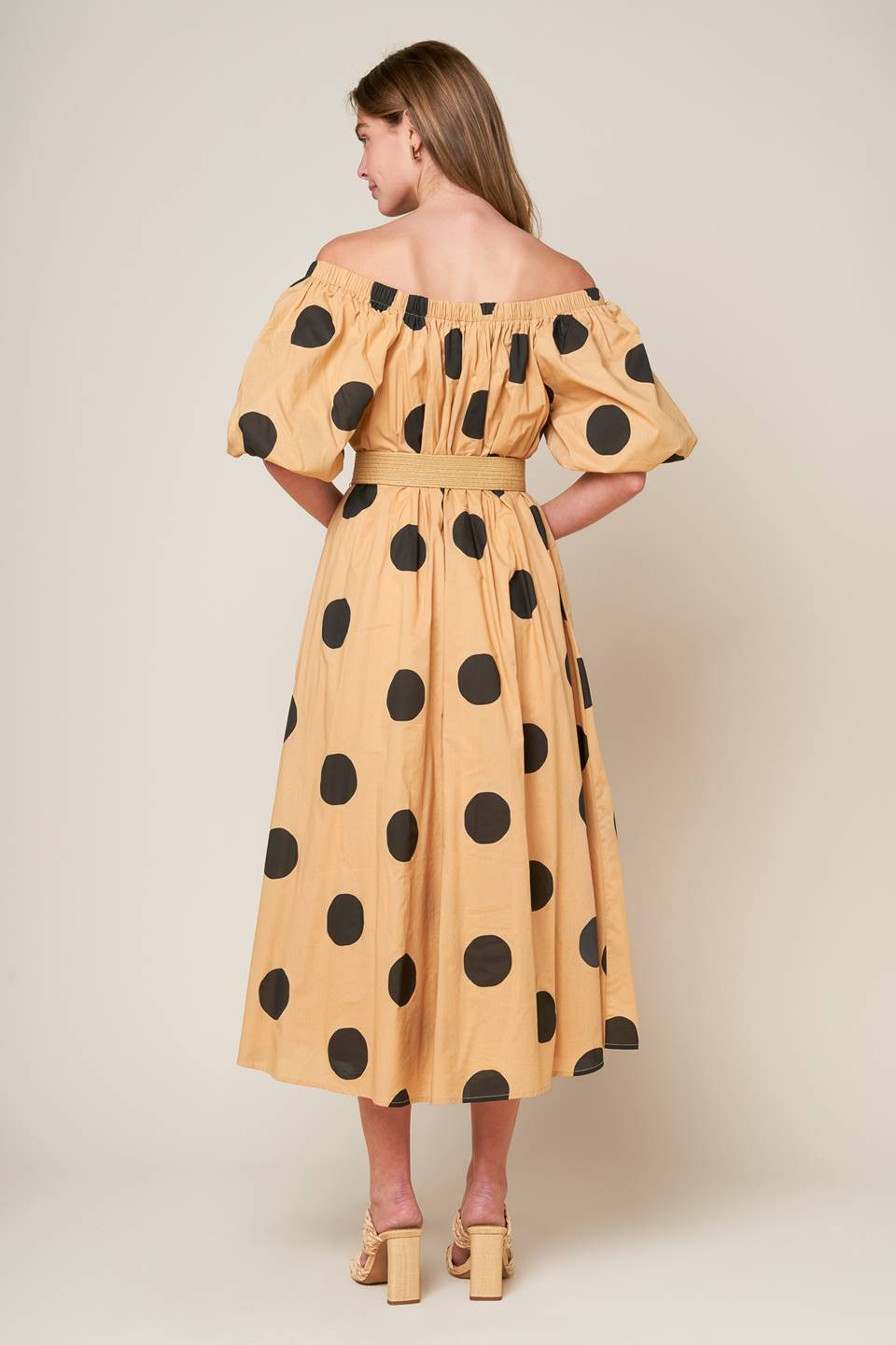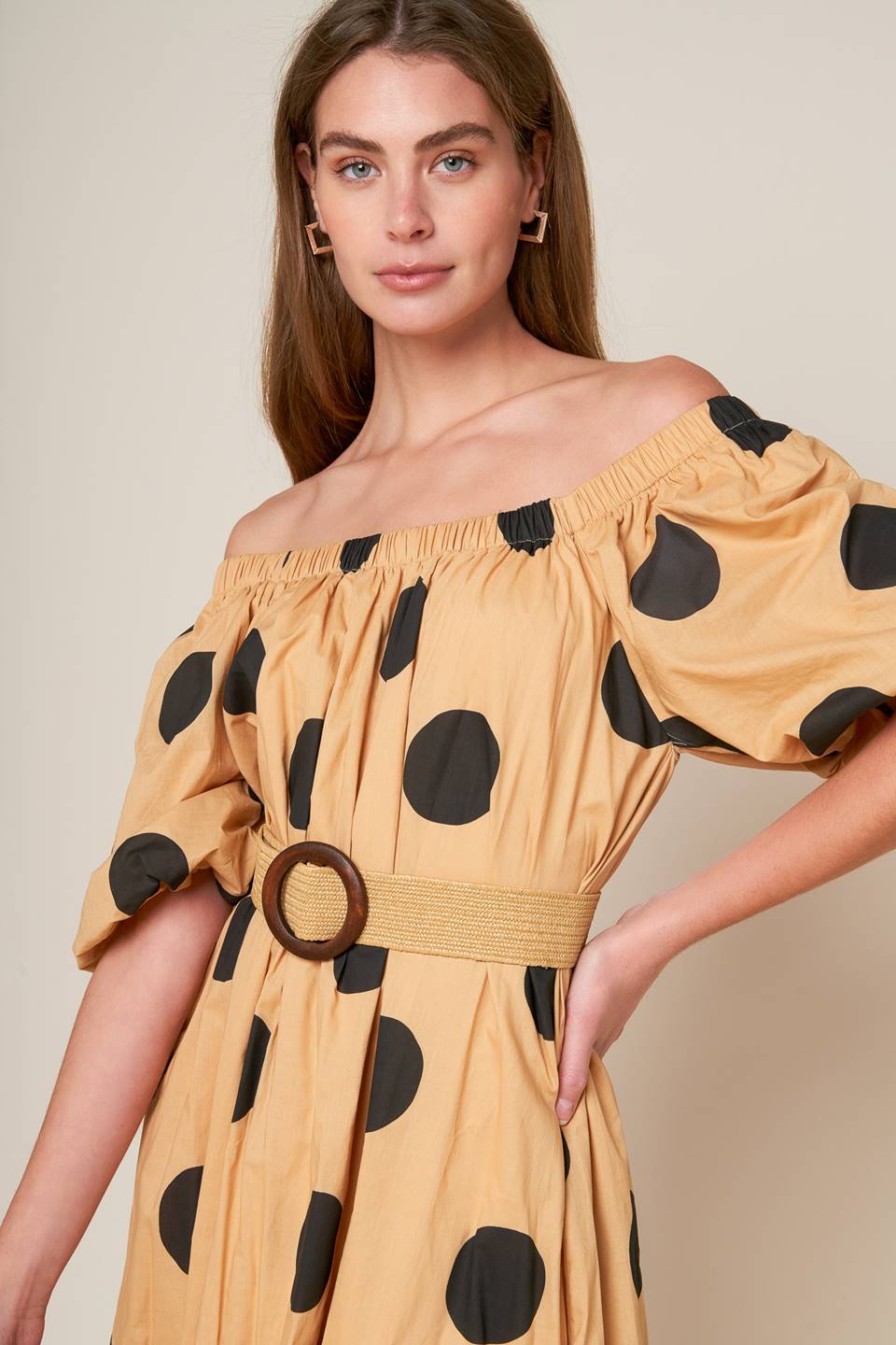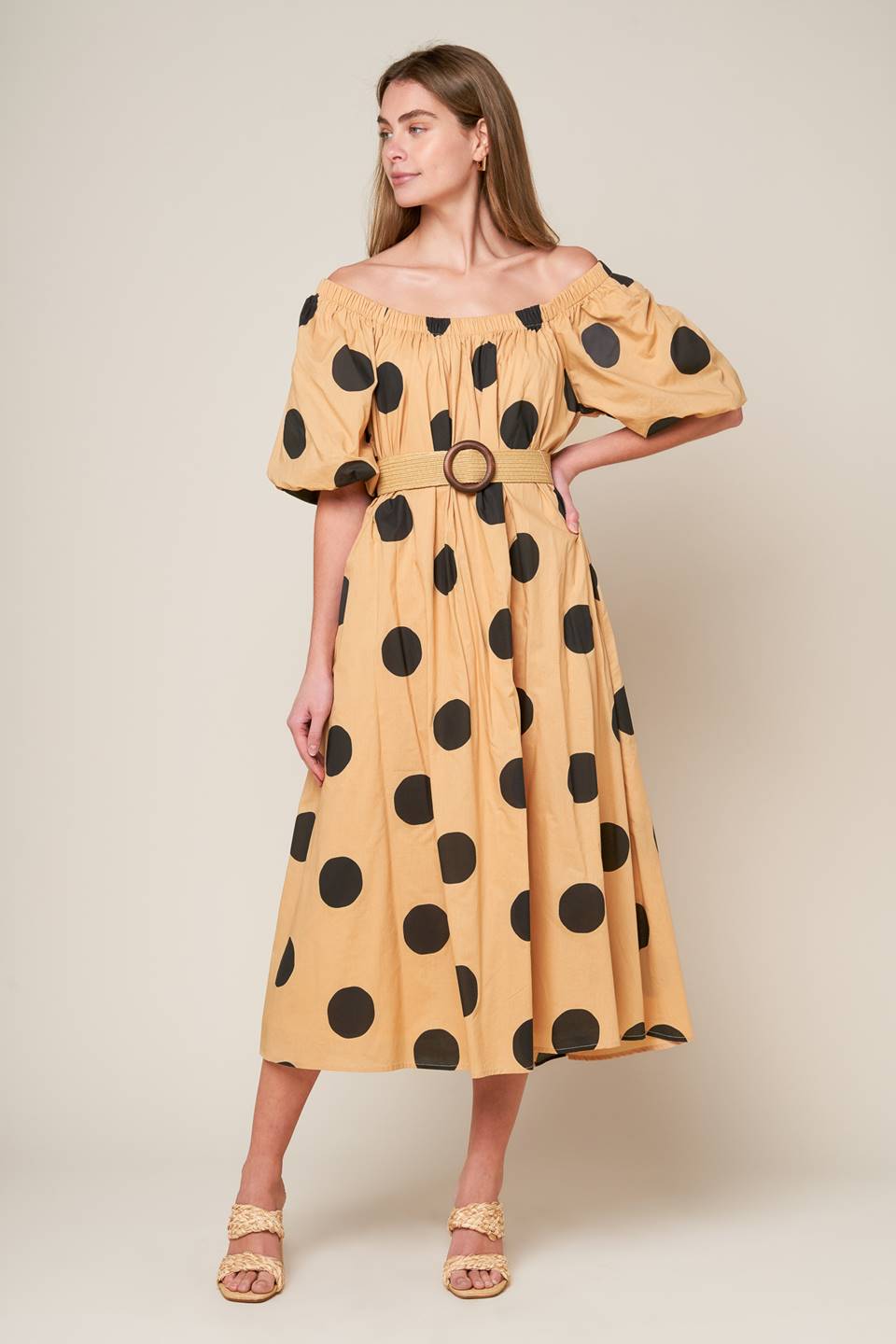 This midi dress features a square neckline, short puff sleeves, and a printed polka dot woven design, complete with a belt for added style.