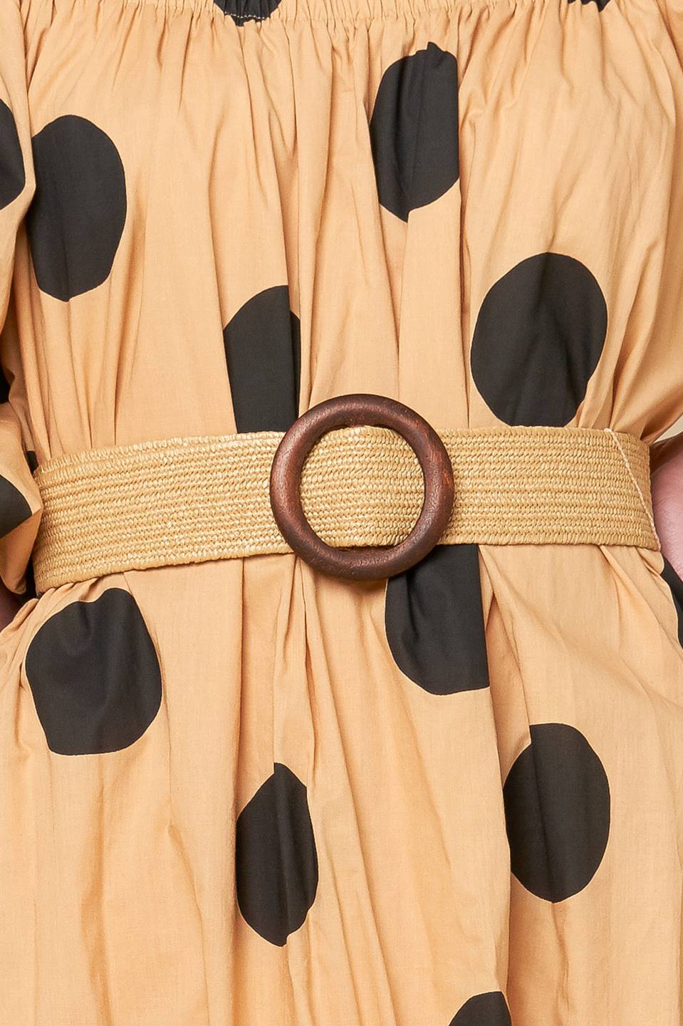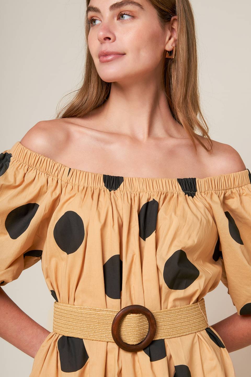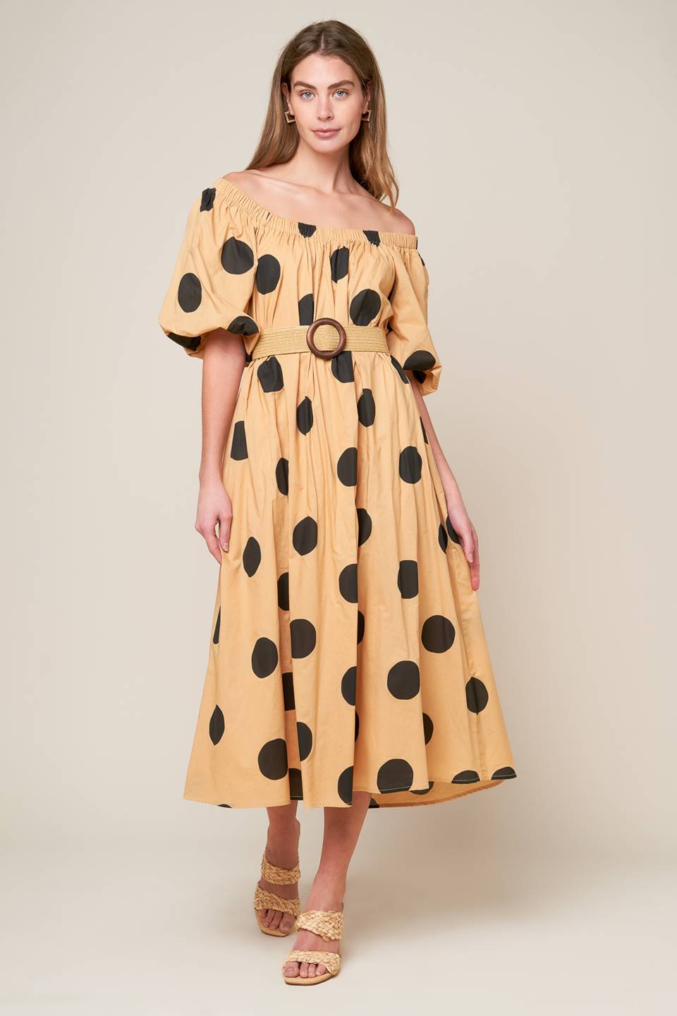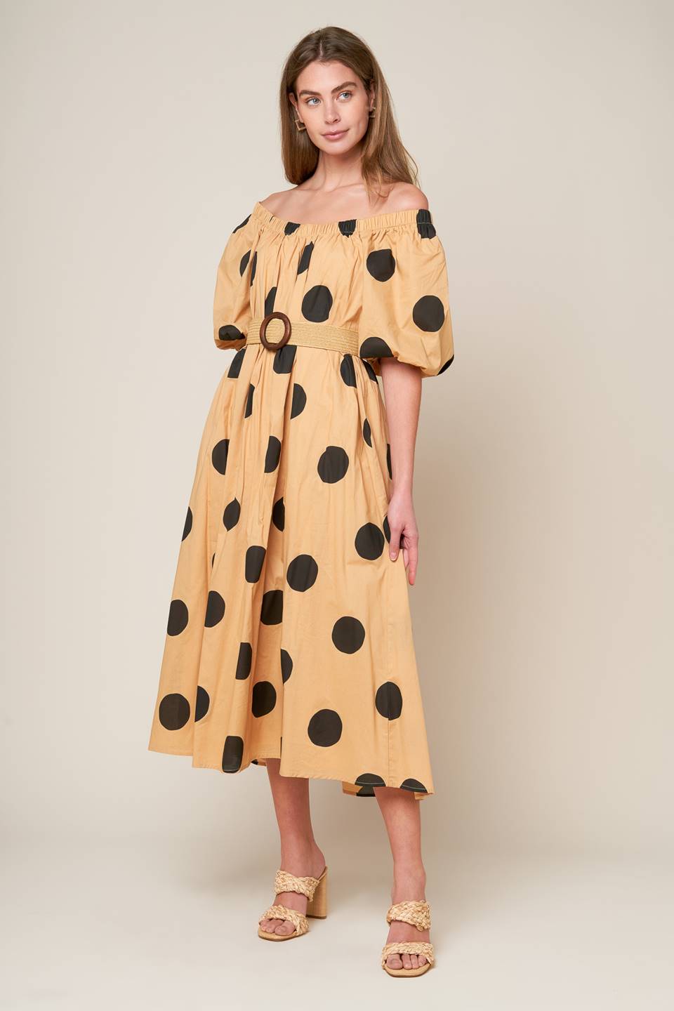 This midi dress features a square neckline, short puff sleeves, and a printed polka dot woven design, complete with a belt for added style.