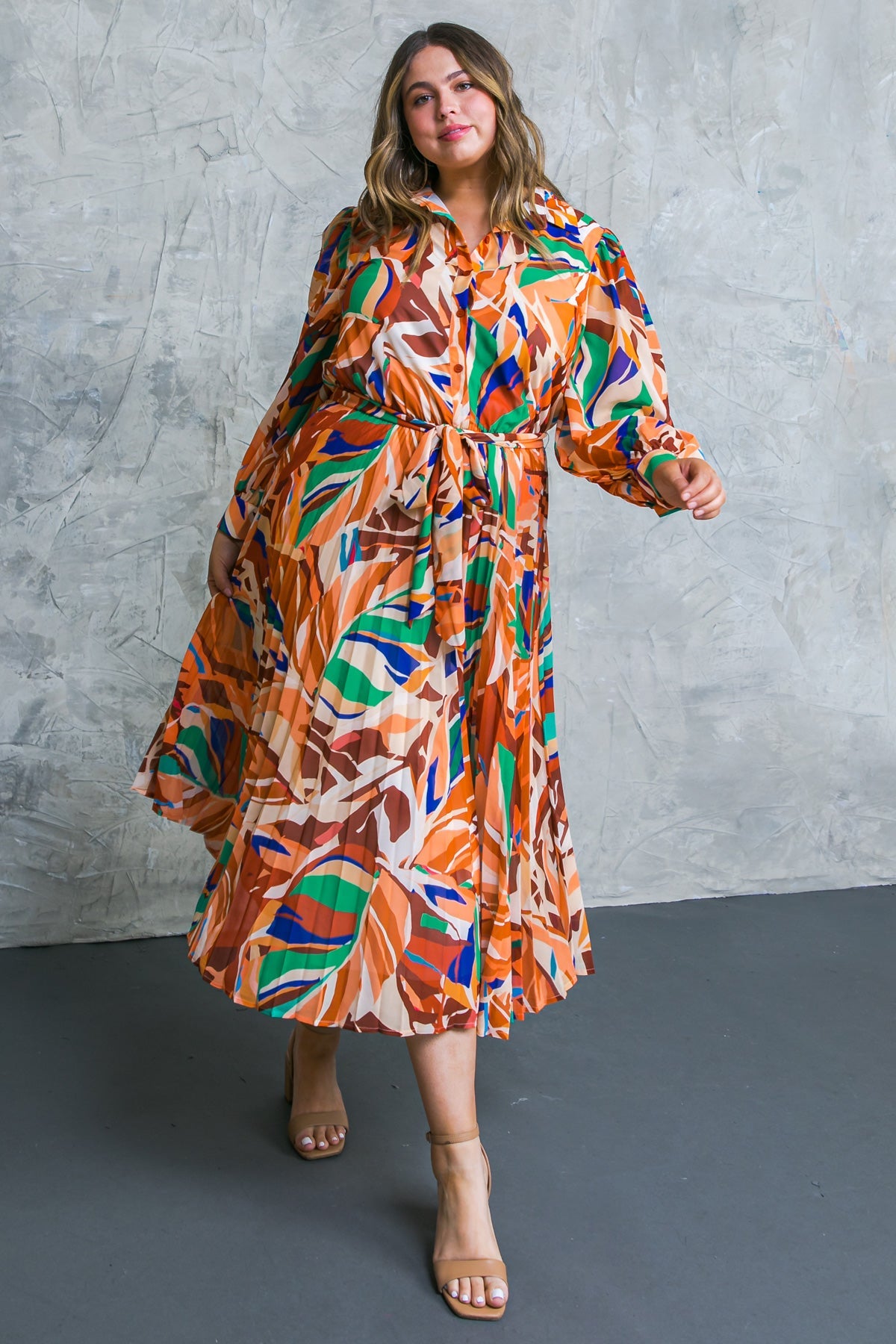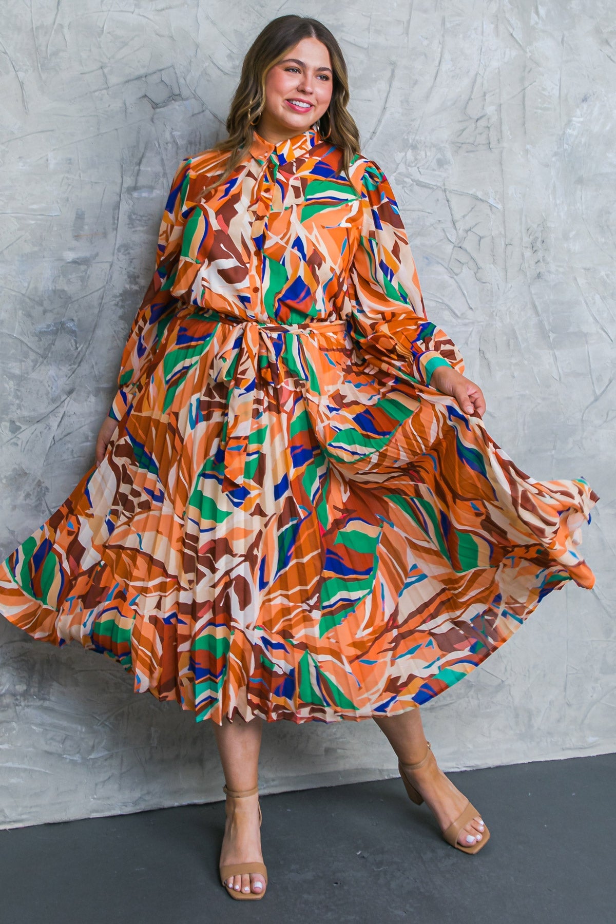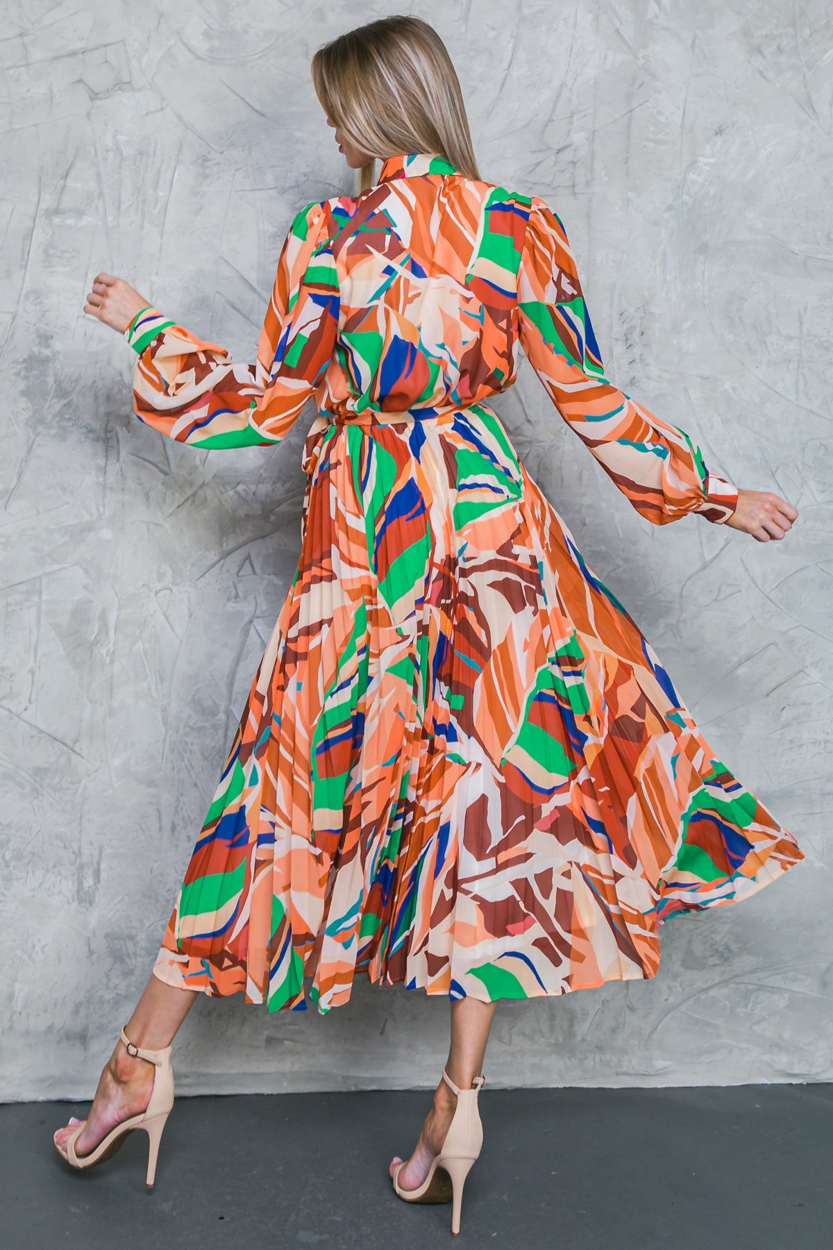 Show off your femininity with this INTOXICATING AURA WOVEN MIDI DRESS, featuring a shirt collar, button-down closure, elasticized waist with self sash tie, and pleated skirt. Its long sleeves with cuffs create a beautiful silhouette, ensuring you look your best. Enjoy the perfect balance of modern style and classic sophistication.