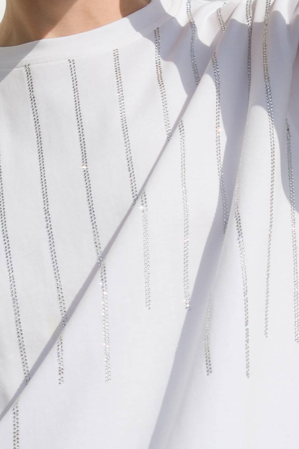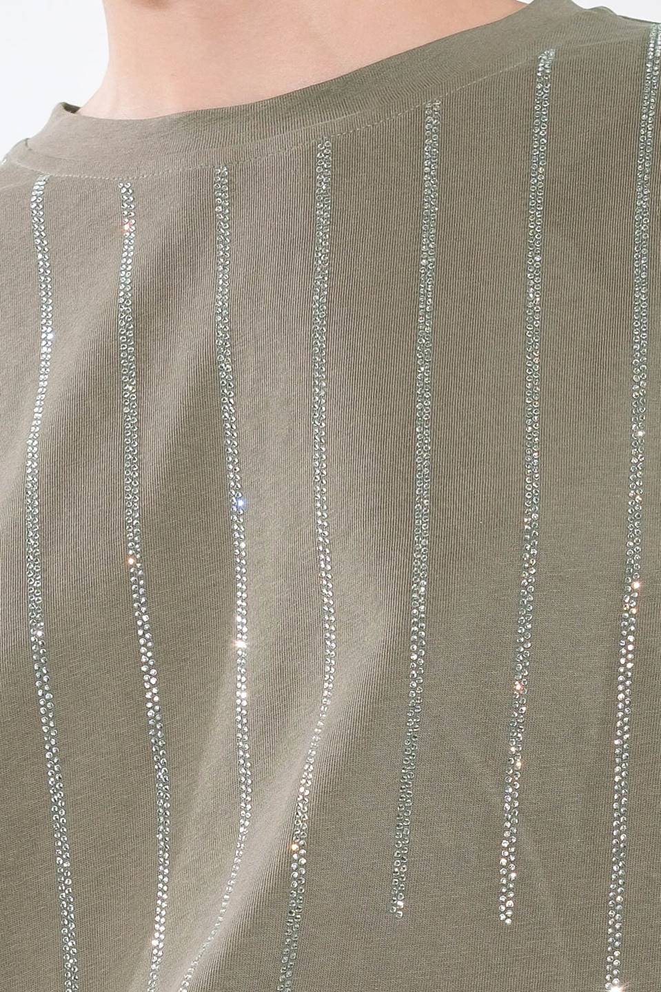 A knit top featuring round neckline short sleeve and rhinestone embellishments