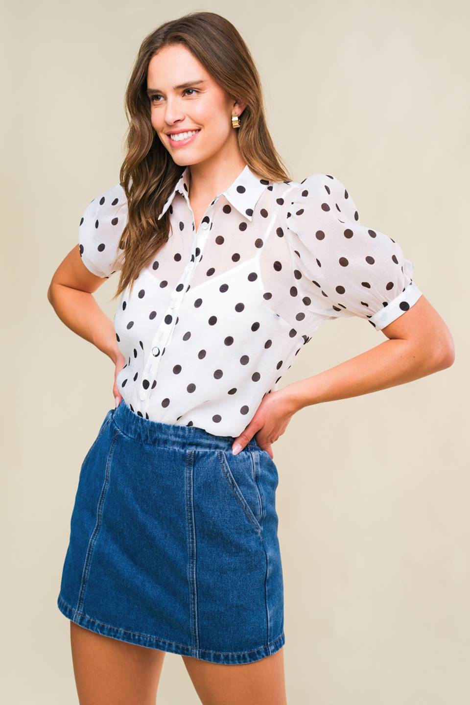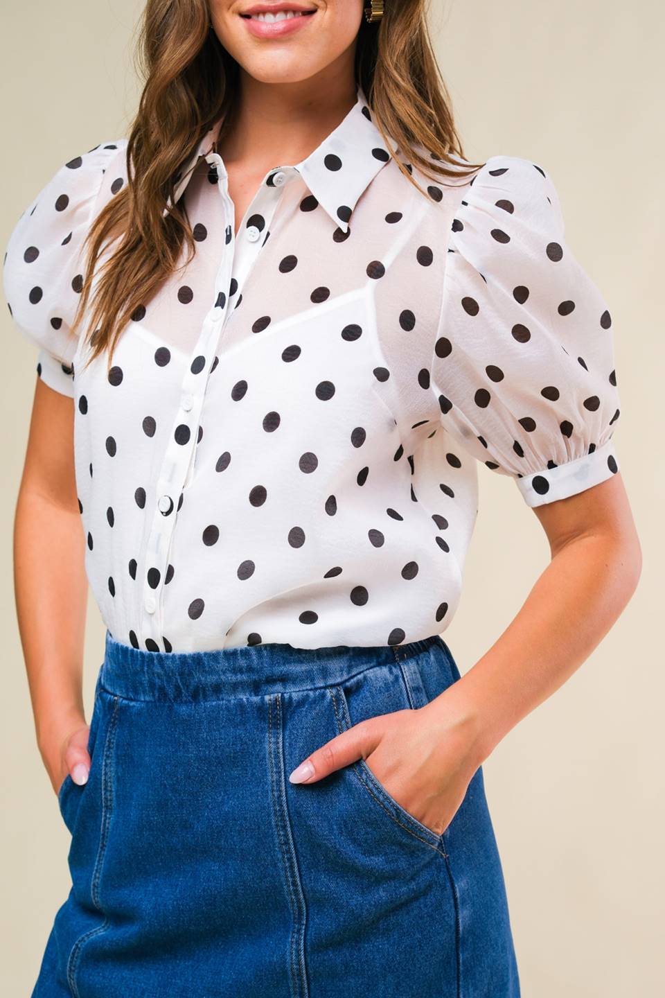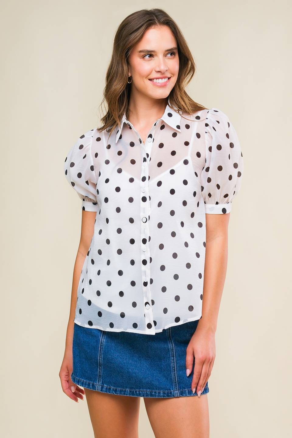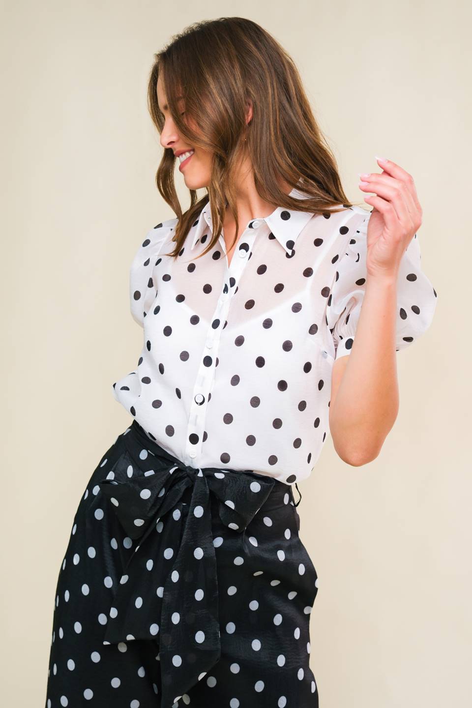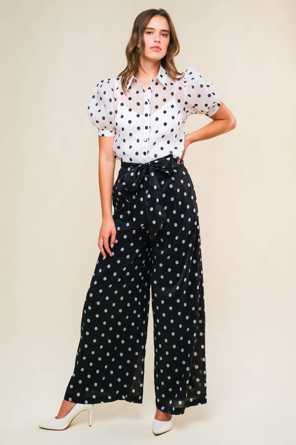 A printed woven top featuring shirt collar, button down, short puff sleeve and cami. Matching pant IP8593