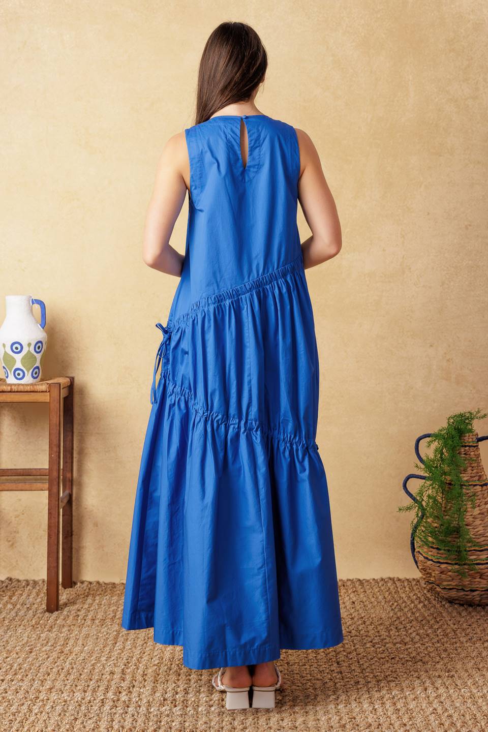 A solid woven midi dress featuring round neckline, sleeveless, asymmetrical tie and back neck button closure