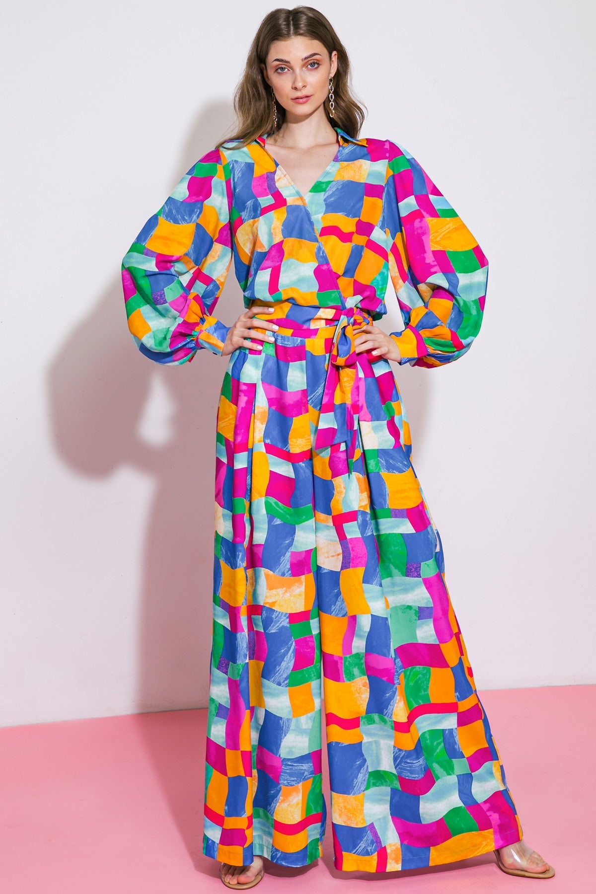 A printed woven top featuring shirt collar, surplice neckline, long puff sleeve with cuff, side tack tie and elasticized back waist. Matching pant IP8264