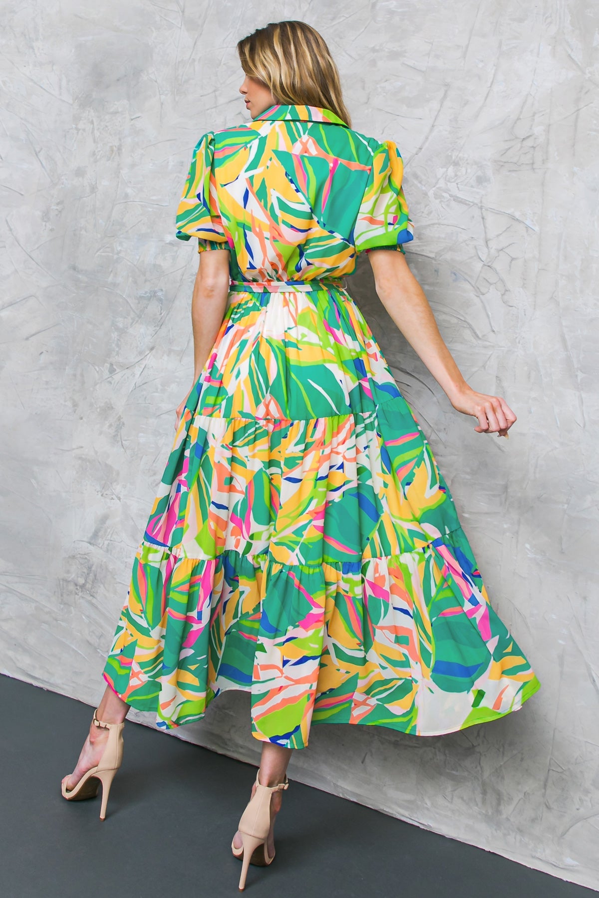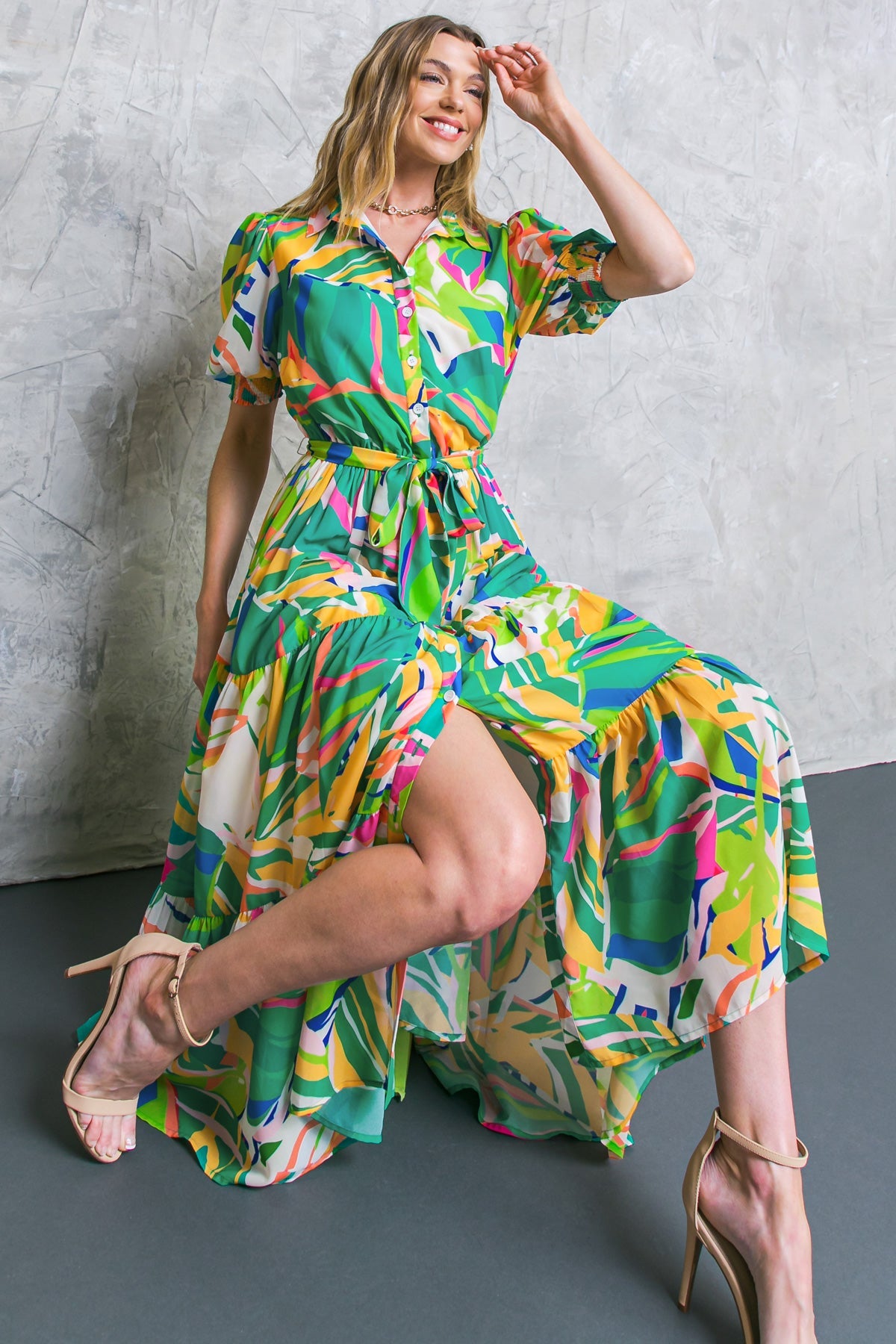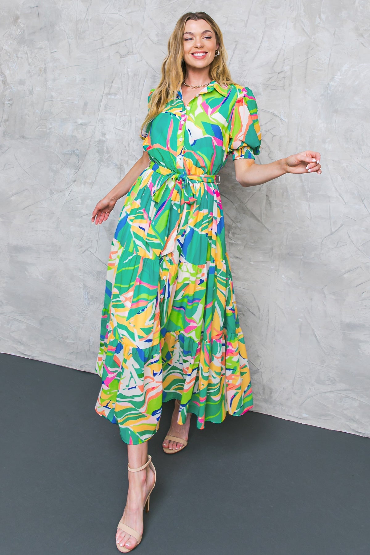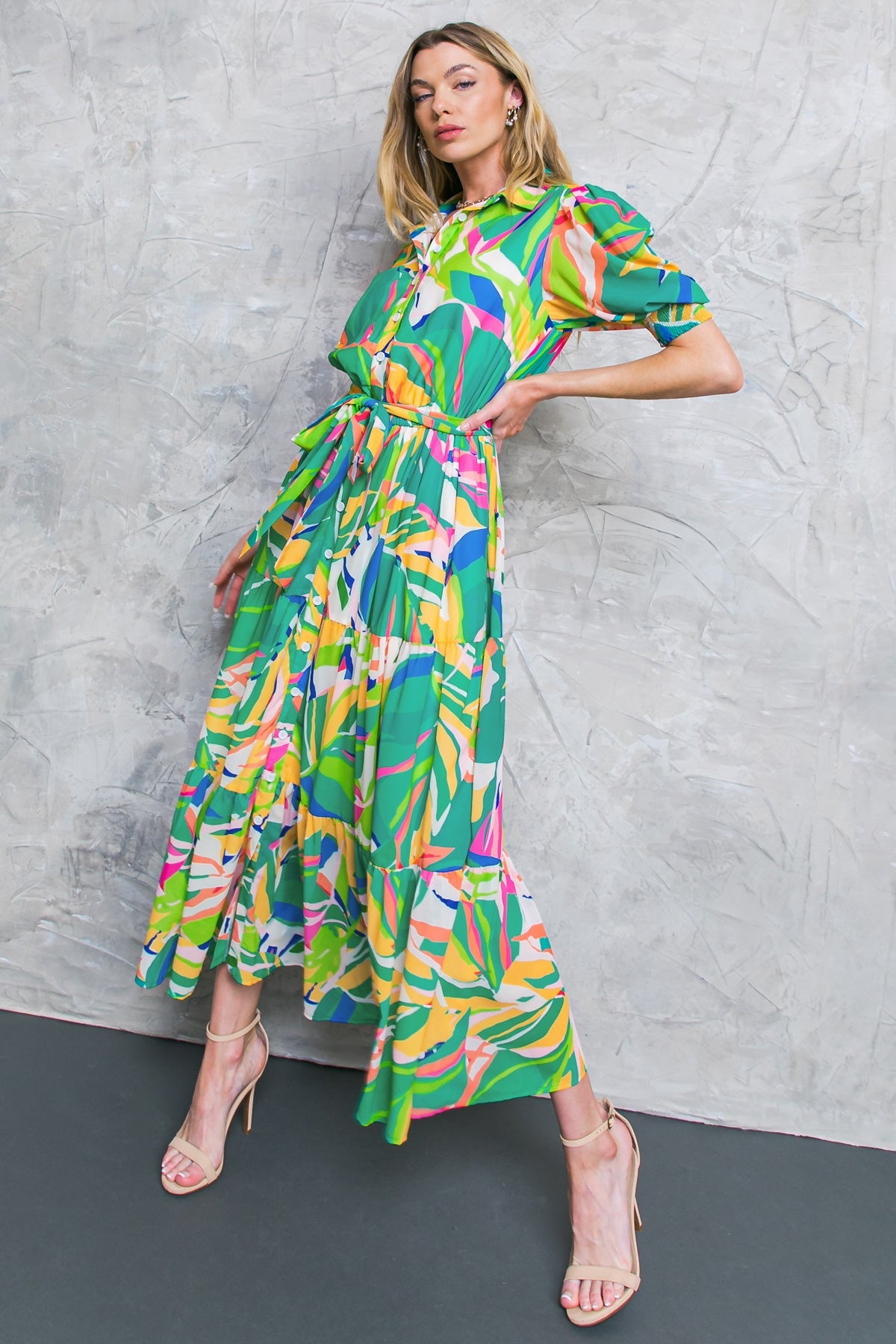 The MAUI LOVE WOVEN MIDI DRESS is sure to exceed your expectations. It features a shirt collar, button-down closure, and short sleeves with smocked cuffs for a perfect fit. The elasticized waist and self-sash tie provide a flattering silhouette, and the tiered skirt adds elegance. This piece is sure to be a staple in your wardrobe.