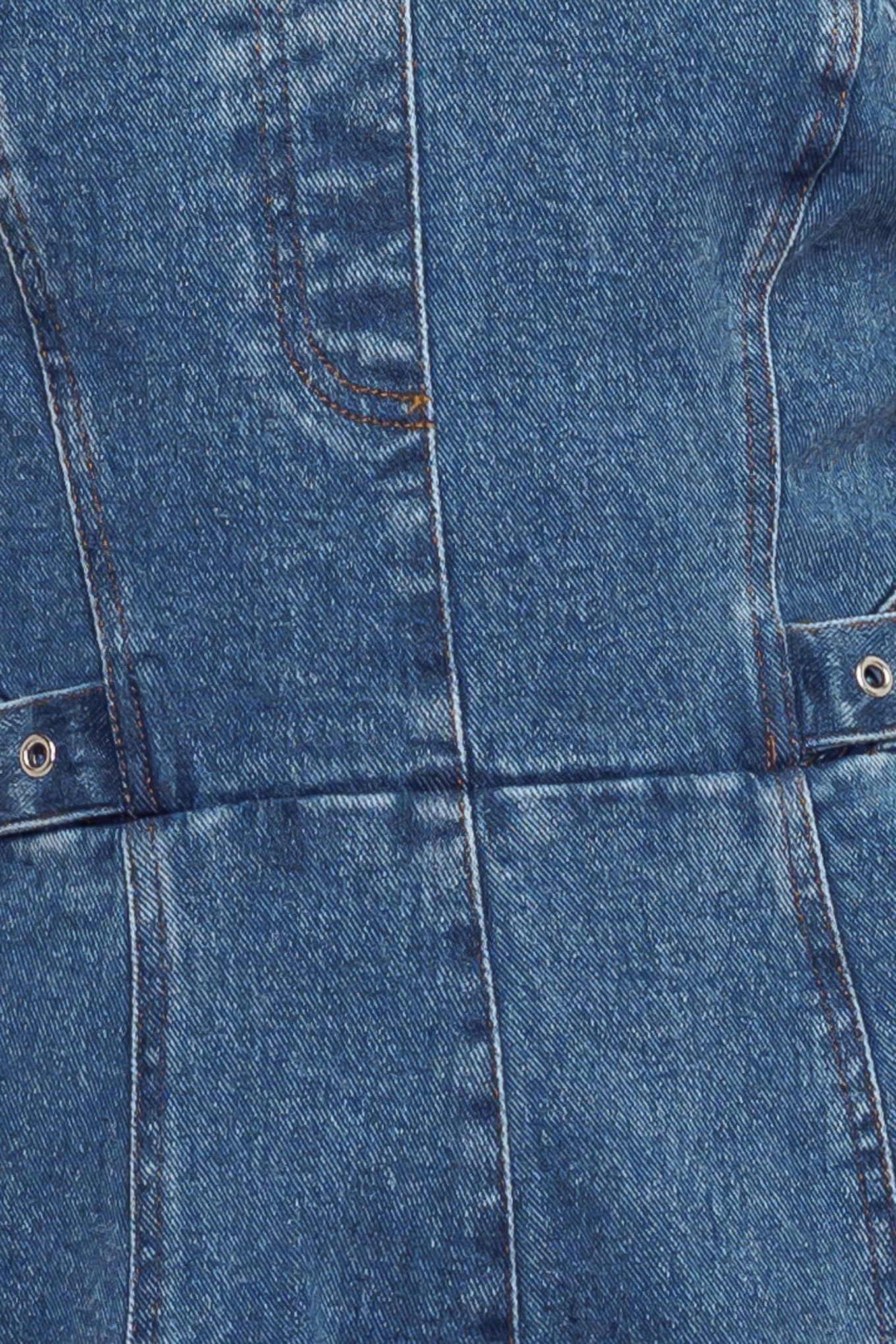 A washed denim midi dress featuring strapless straight neckline, front and side detail, circle skirt and back zipper closure