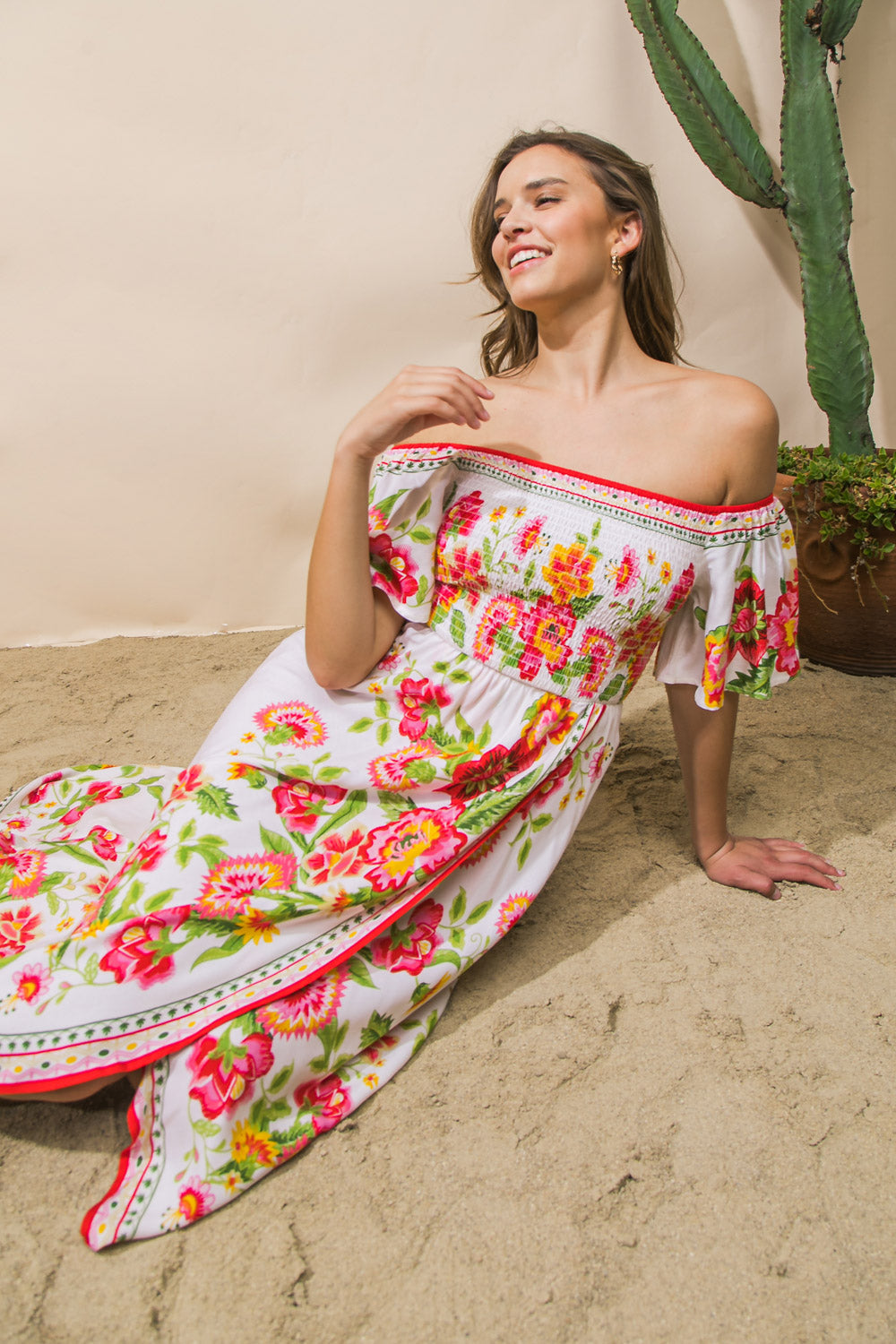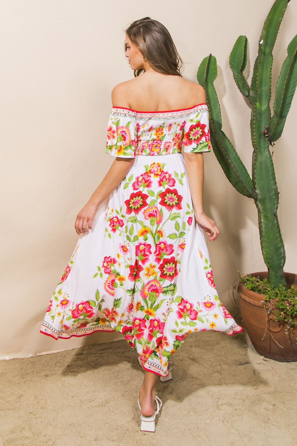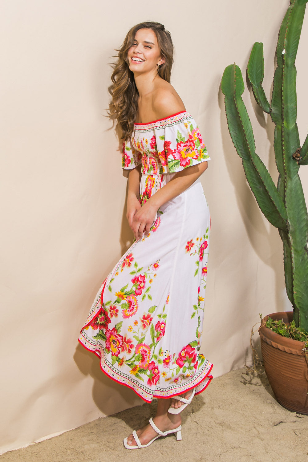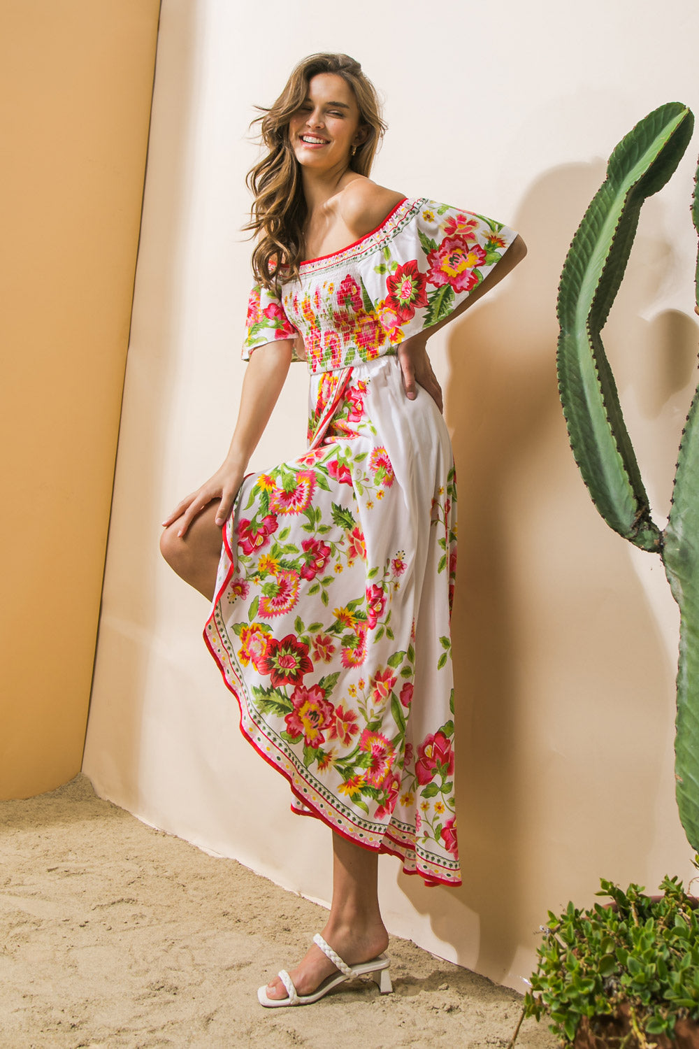 Take your vacation style to the next level with this stylish MY VACATION ESSENTIALS HI-LO DRESS. Crafted from breathable printed woven fabric, it features off shoulder neckline, flutter sleeve, smocked bodice and faux wrap to create a flattering fit. Perfect for a summer getaway.