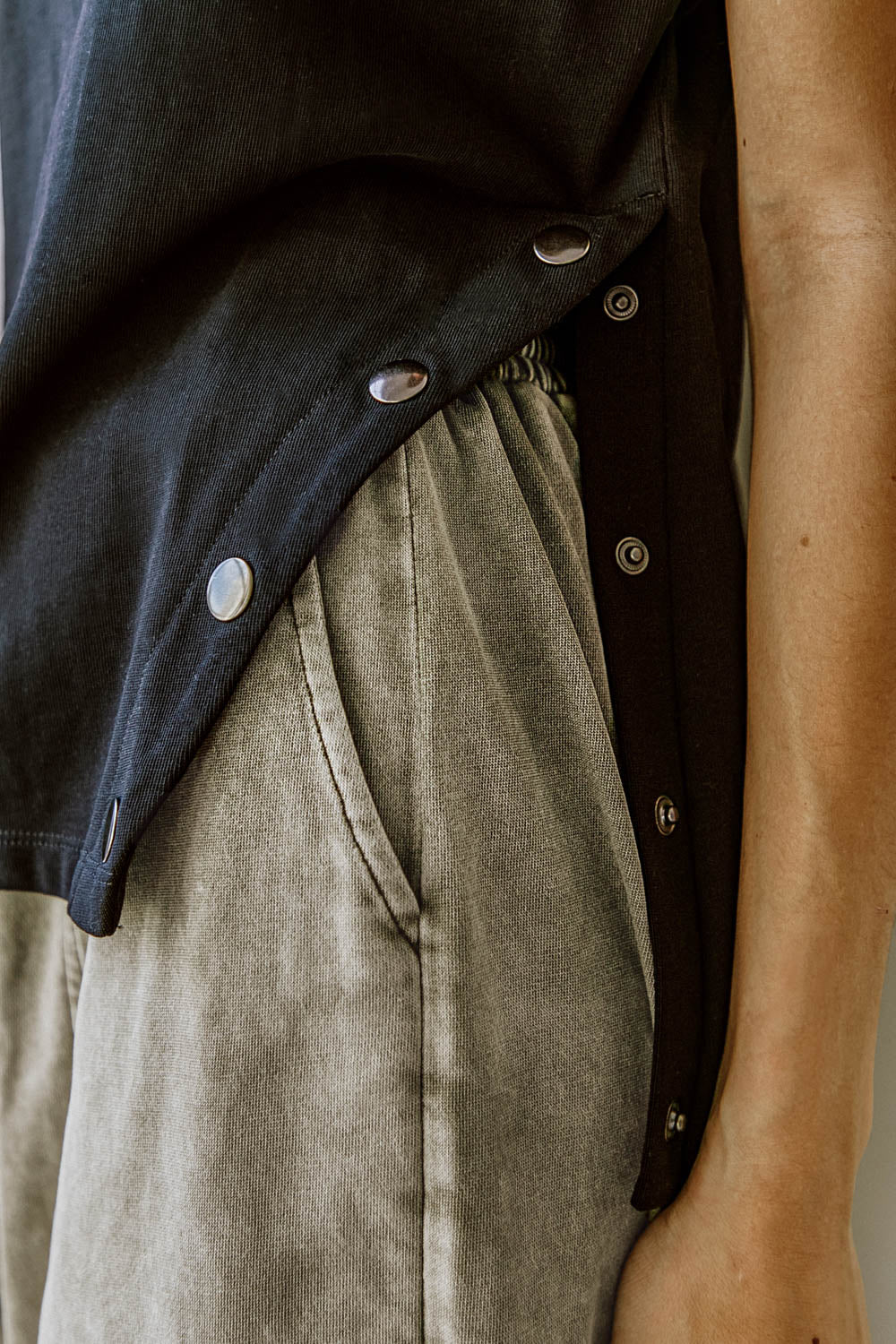 A solid knit top featuring round neckline, sleeveless with shoulder pad and side snap detail