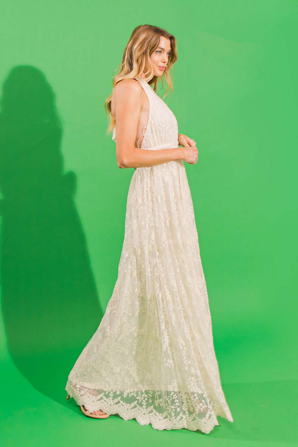 A woven lace maxi dress featuring plunging halter neckline, scalloped hemline, back neck tie and zipper closure