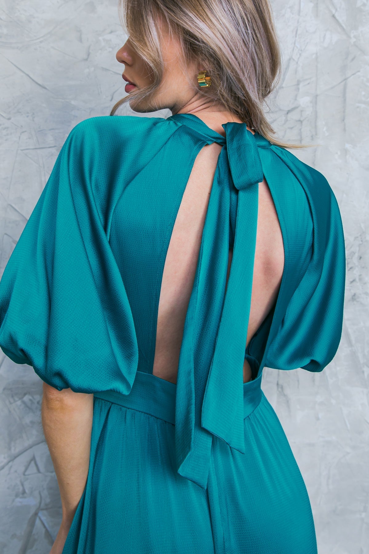 This sophisticated PETAL PROWESS WOVEN MIDI DRESS creates a timeless silhouette with its high neckline, elbow bell sleeve, and zipper closure. Show off your back with an open back and back neck tie. Stay stylish with the perfect balance of structured yet comfortable construction.