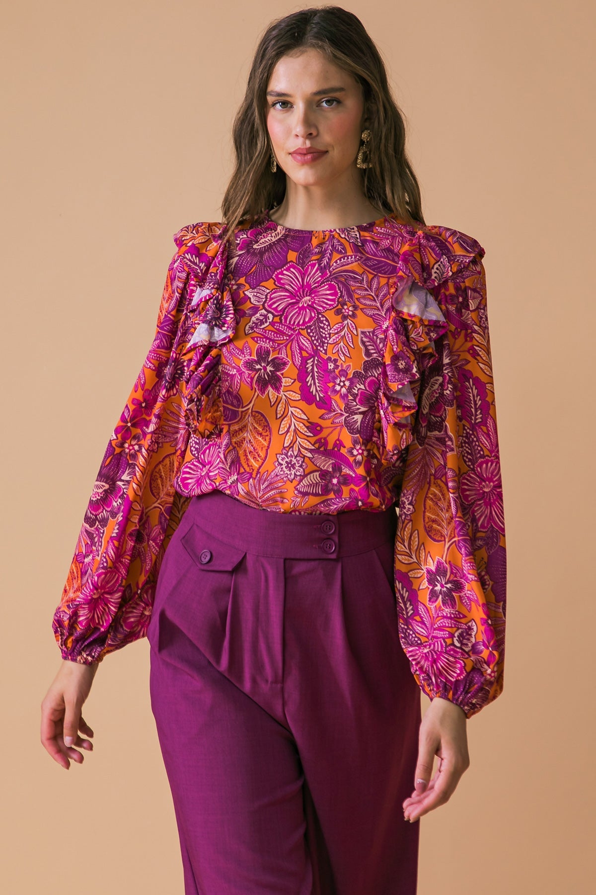 A printed woven top featuring round neckline, ruffle over shoulder, long sleeve and back neck button closure
