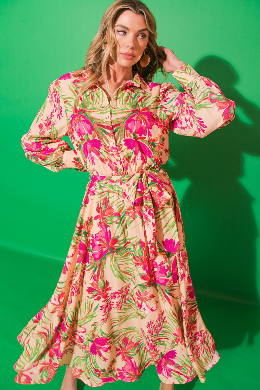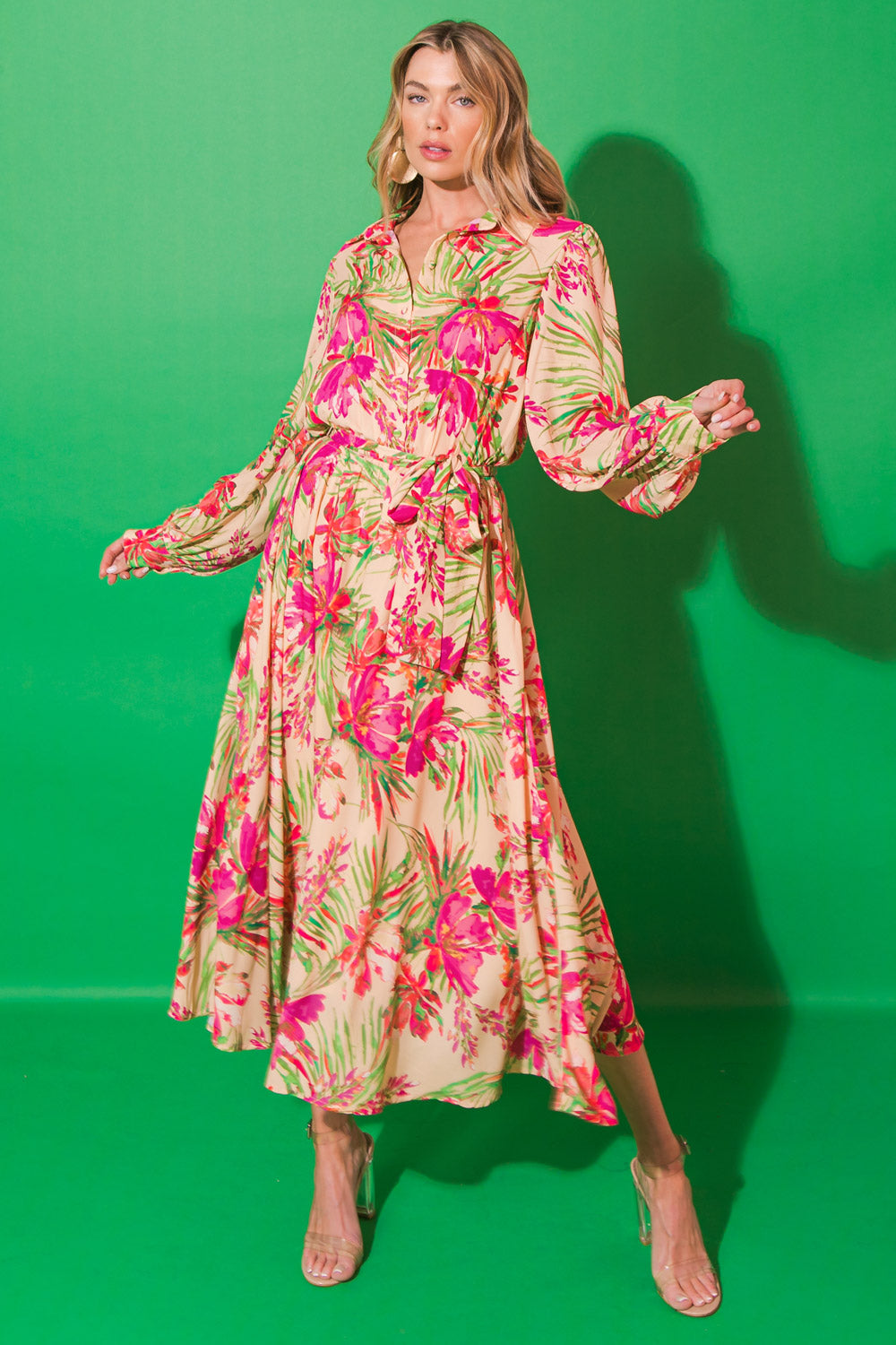 Step out in style in the RUN AWAY TOGETHER WOVEN MIDI DRESS. Produced using an intricately printed woven fabric, this midi dress features a classic shirt collar, button down bodice, and peasant sleeves with cuffs for a polished, sophisticated look. An elasticized waist and self sash tie cinch the waist to flatter your figure, while a full skirt flows gracefully with every movement.