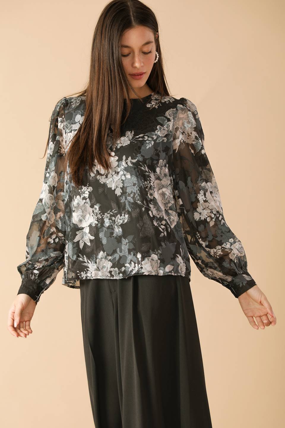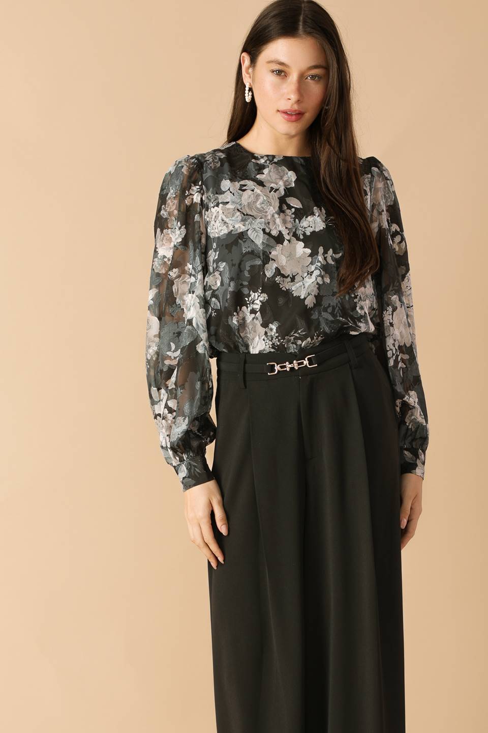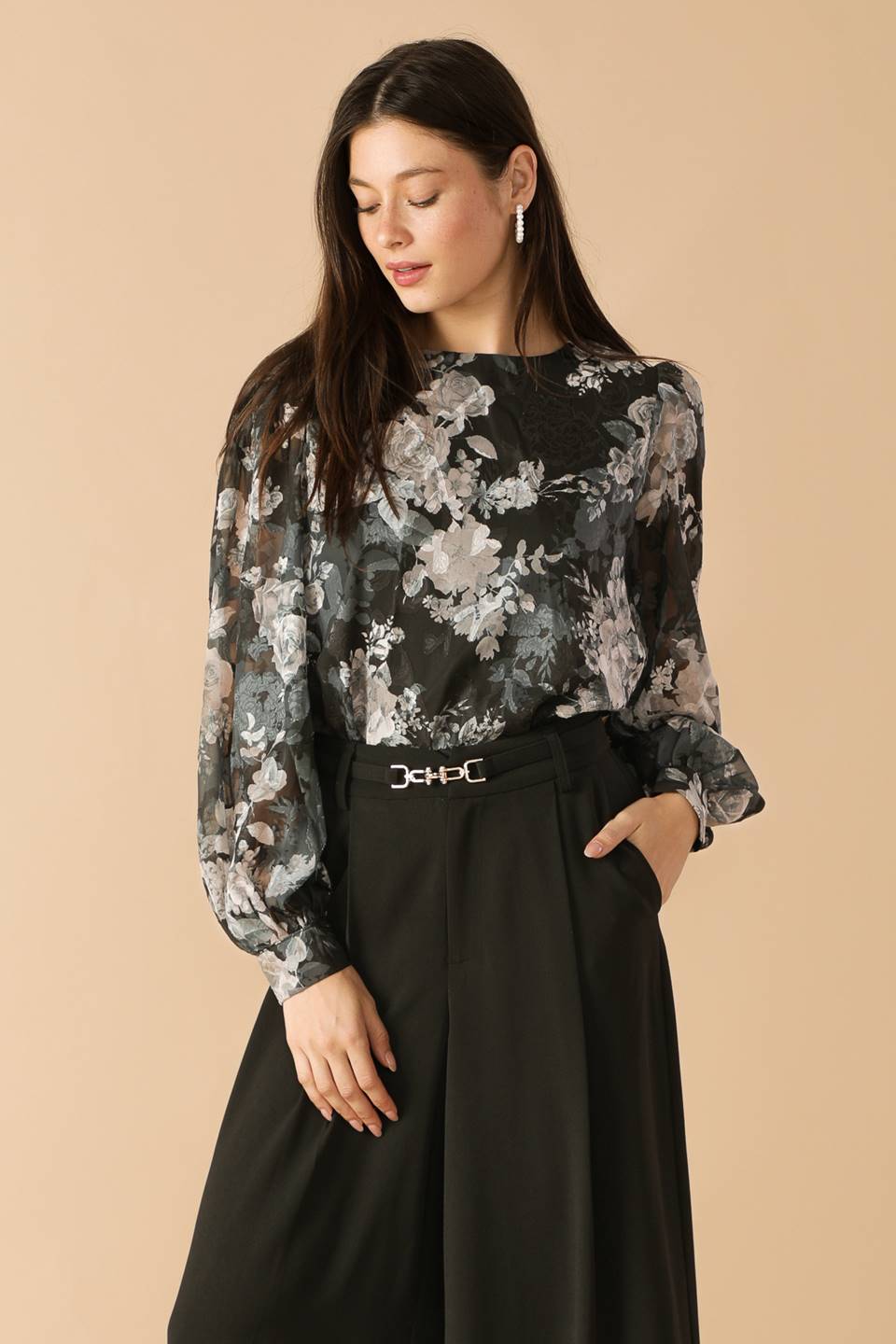 A printed woven top featuring round neckline, long sleeve and back bow tie detail