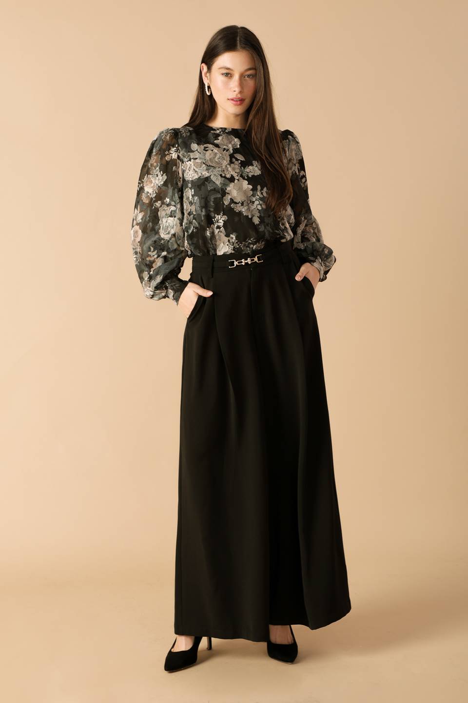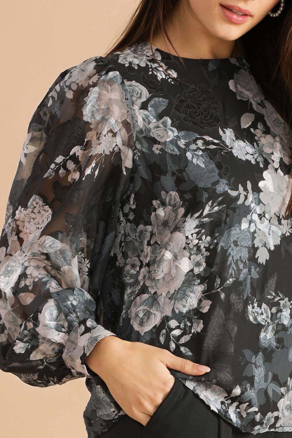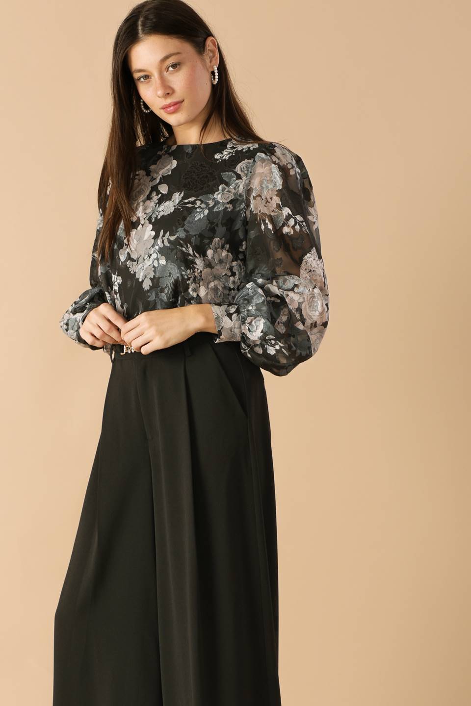 A printed woven top featuring round neckline, long sleeve and back bow tie detail