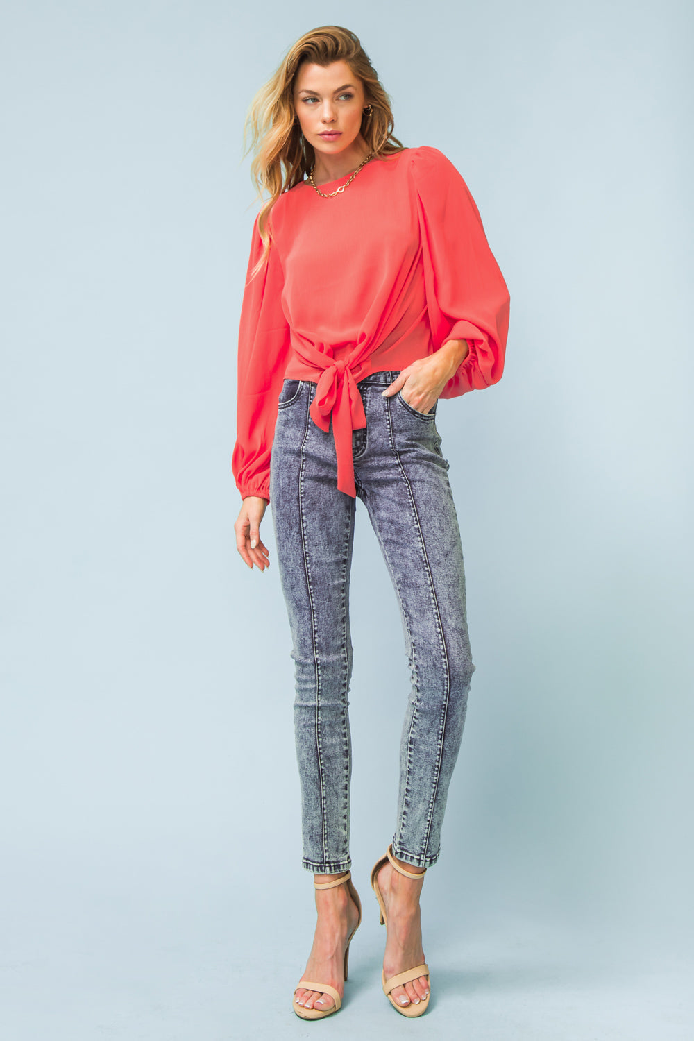 The RUNNING UP THAT HILL WOVEN TOP features a round neckline and peasant sleeves for a light and airy look. The front tie detail, back keyhole and button closure locks in the perfect fit with versatile styling options. For a stunning look, try this flawless top.