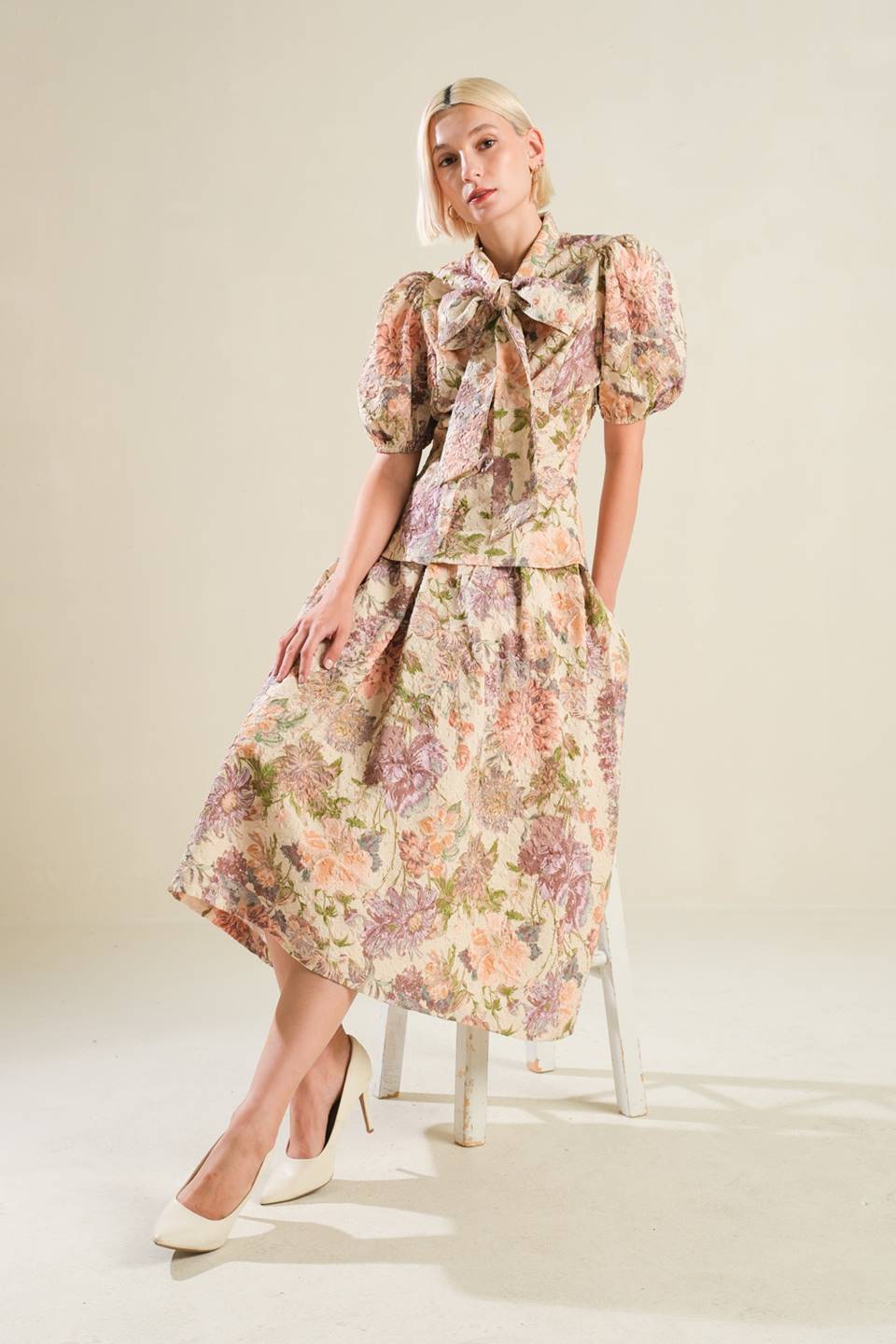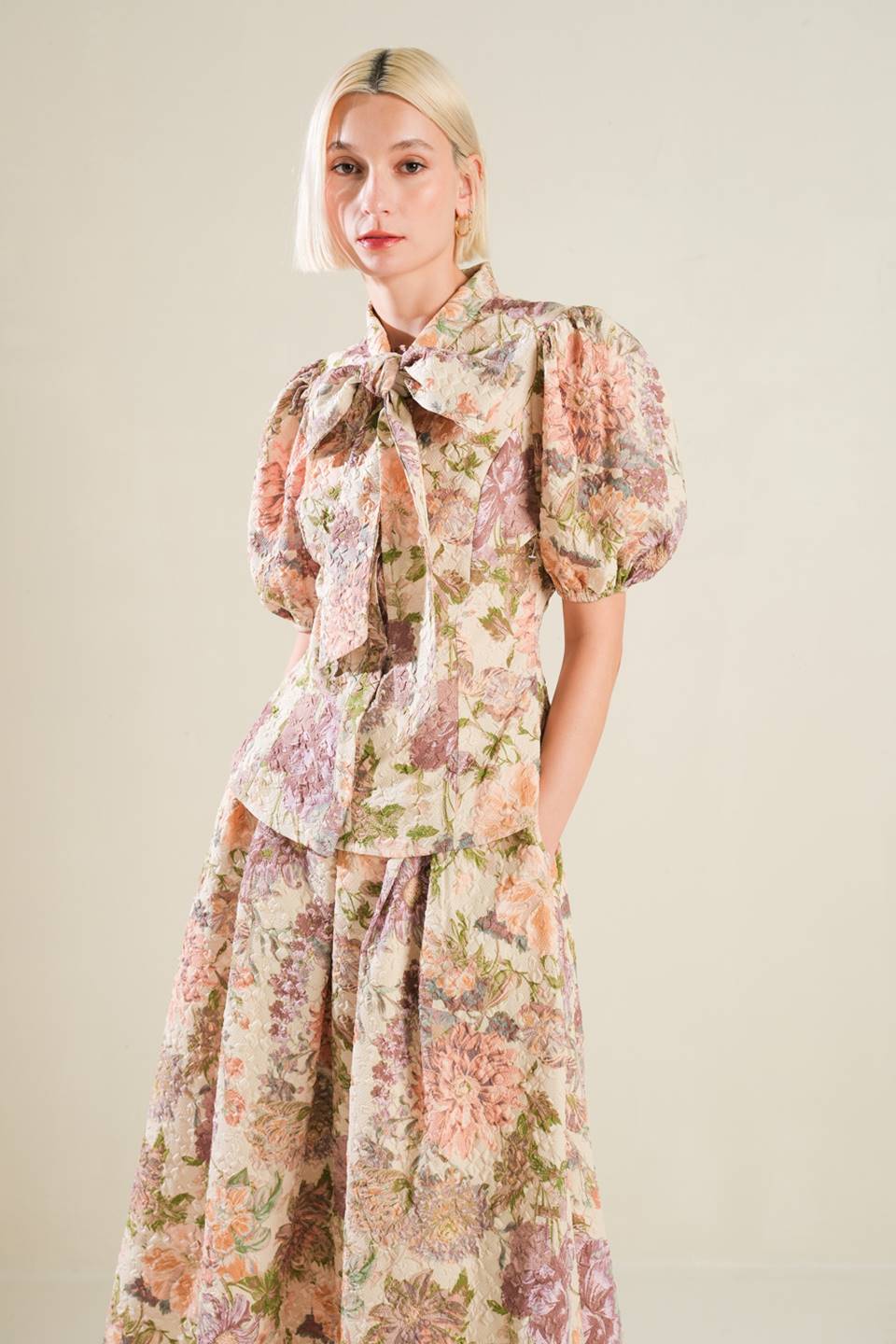 A printed textured woven top featuring front tie, button down and short puff sleeve. Matching skirt FK1100