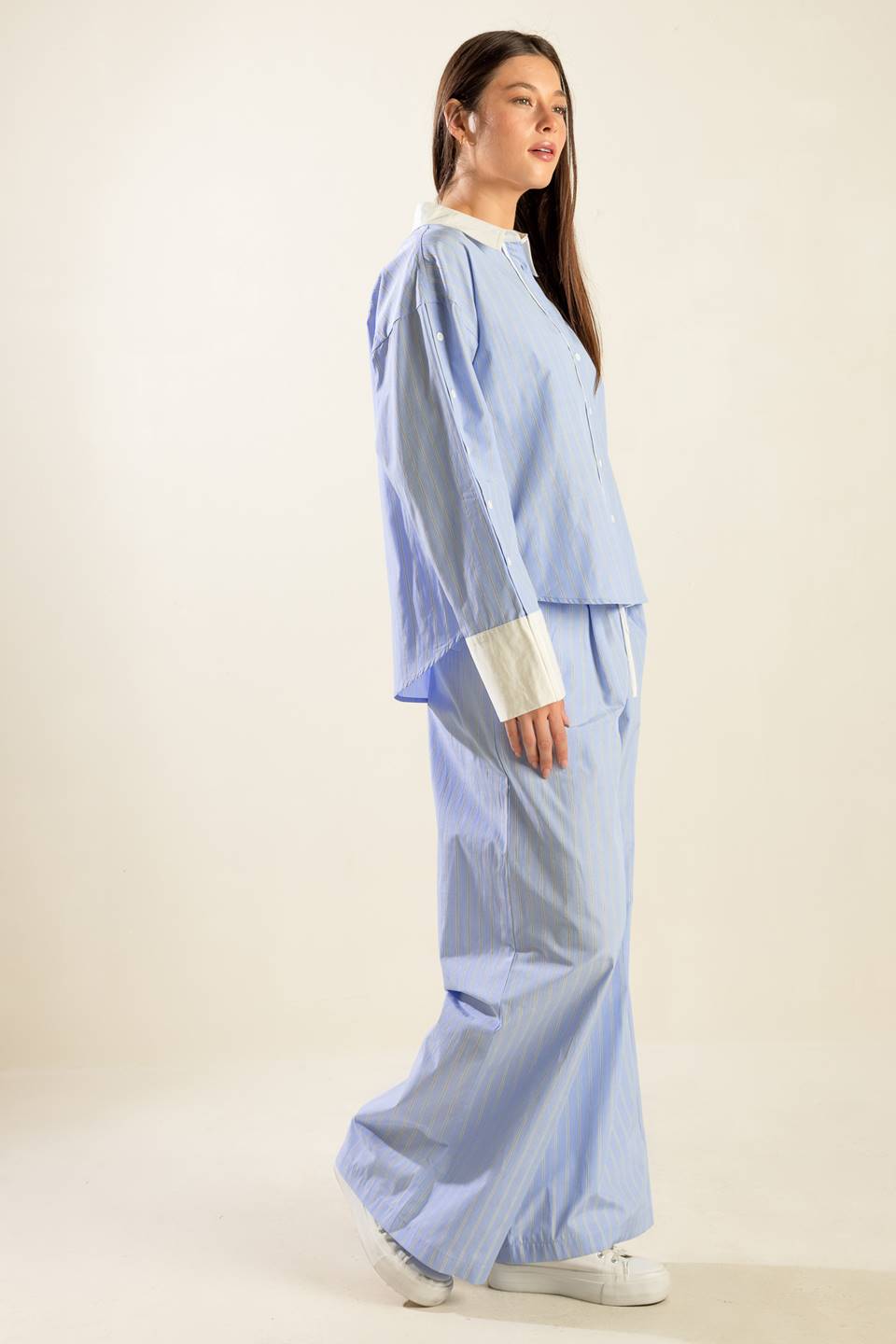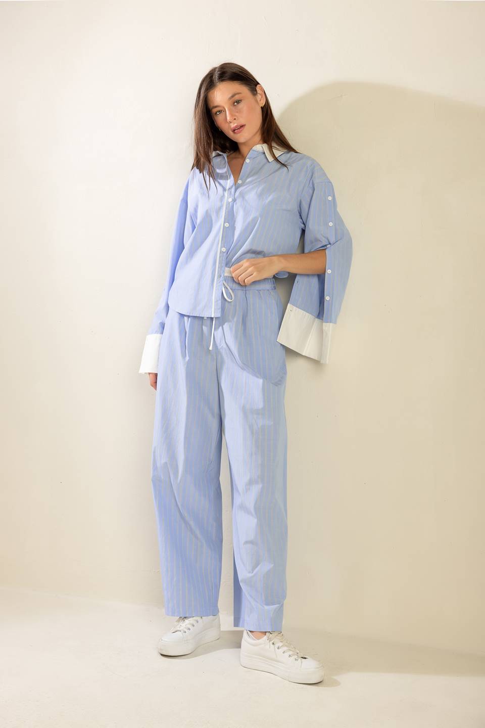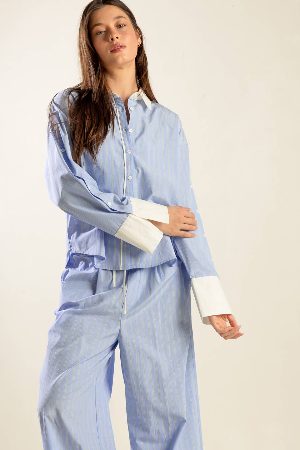 A long-sleeved woven top with contrasting collar/cuff and button-down.