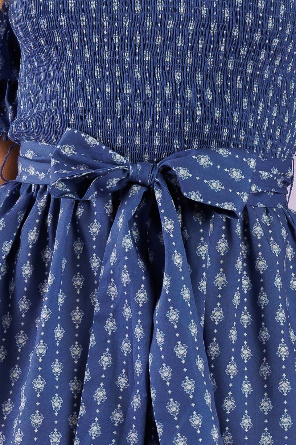 A textured woven romper featuring sweetheart neckline, short sleeve with lace trimmed ruffled cuff, smocked bodice, self sash belt and lace trimmed hemline.