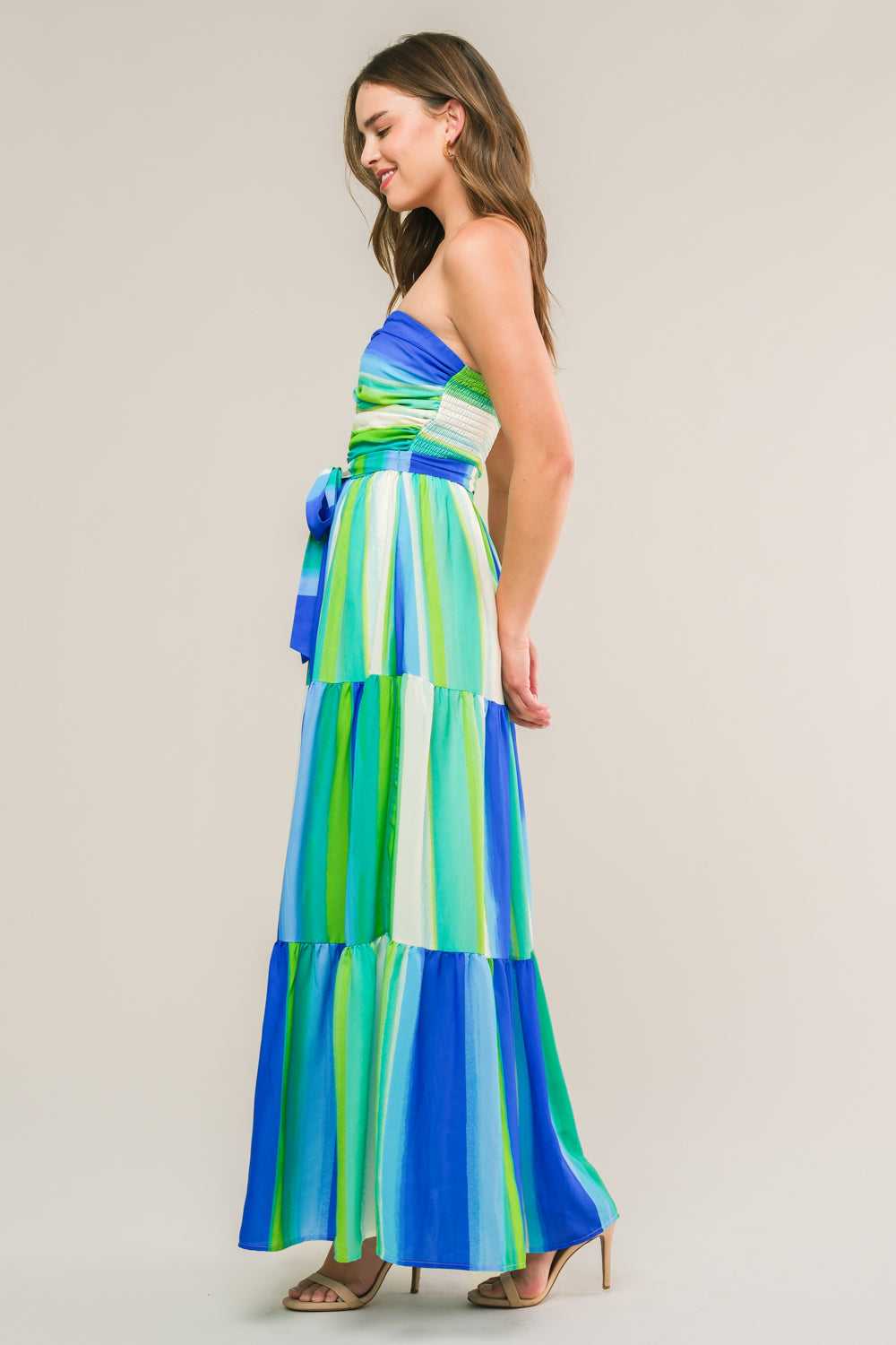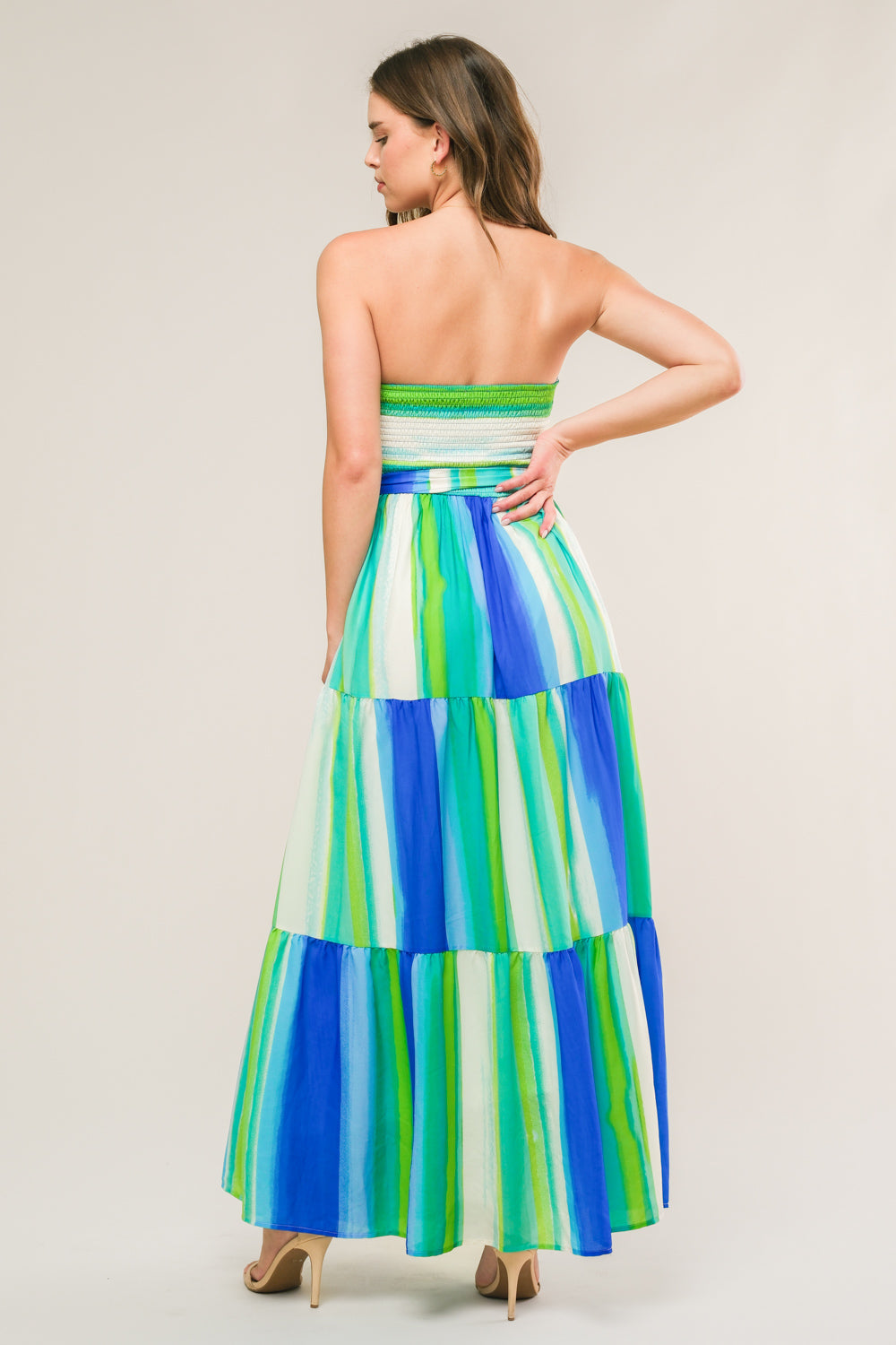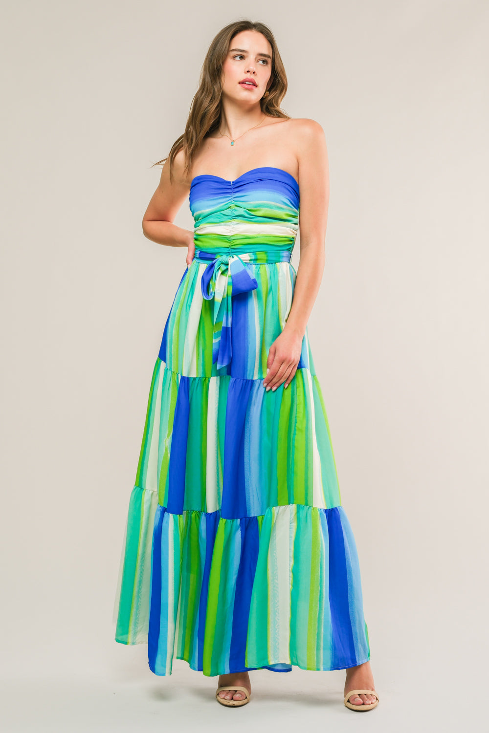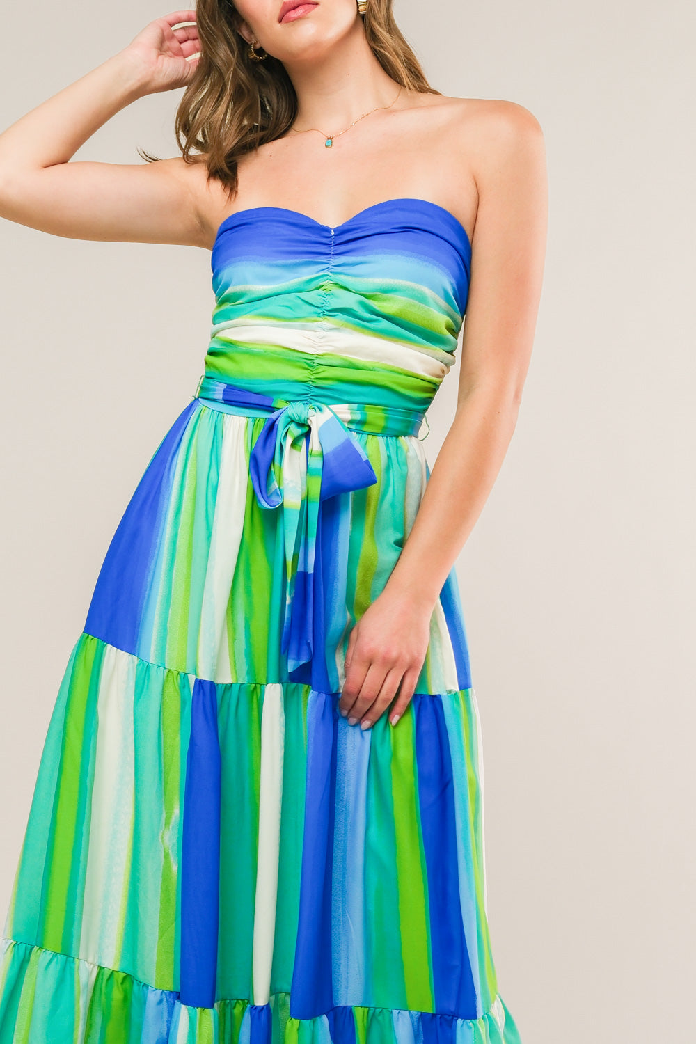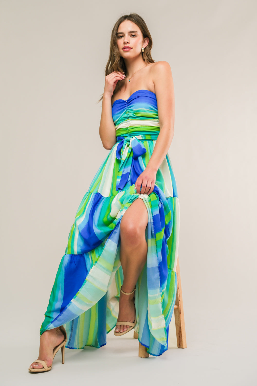 A printed woven midi dress featuring strapless sweetheart neckline, center gathered bodice, ruffled hemline and smocked back bodice
