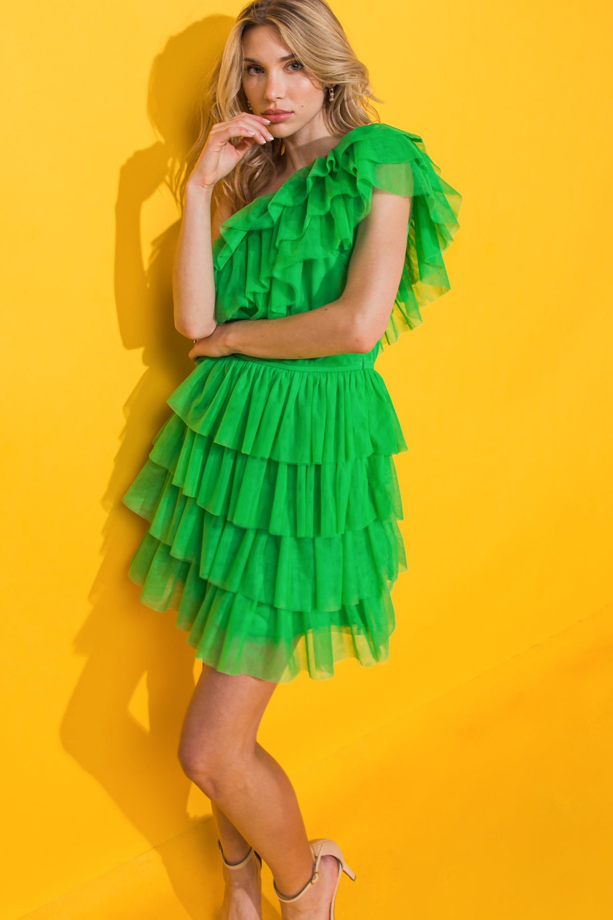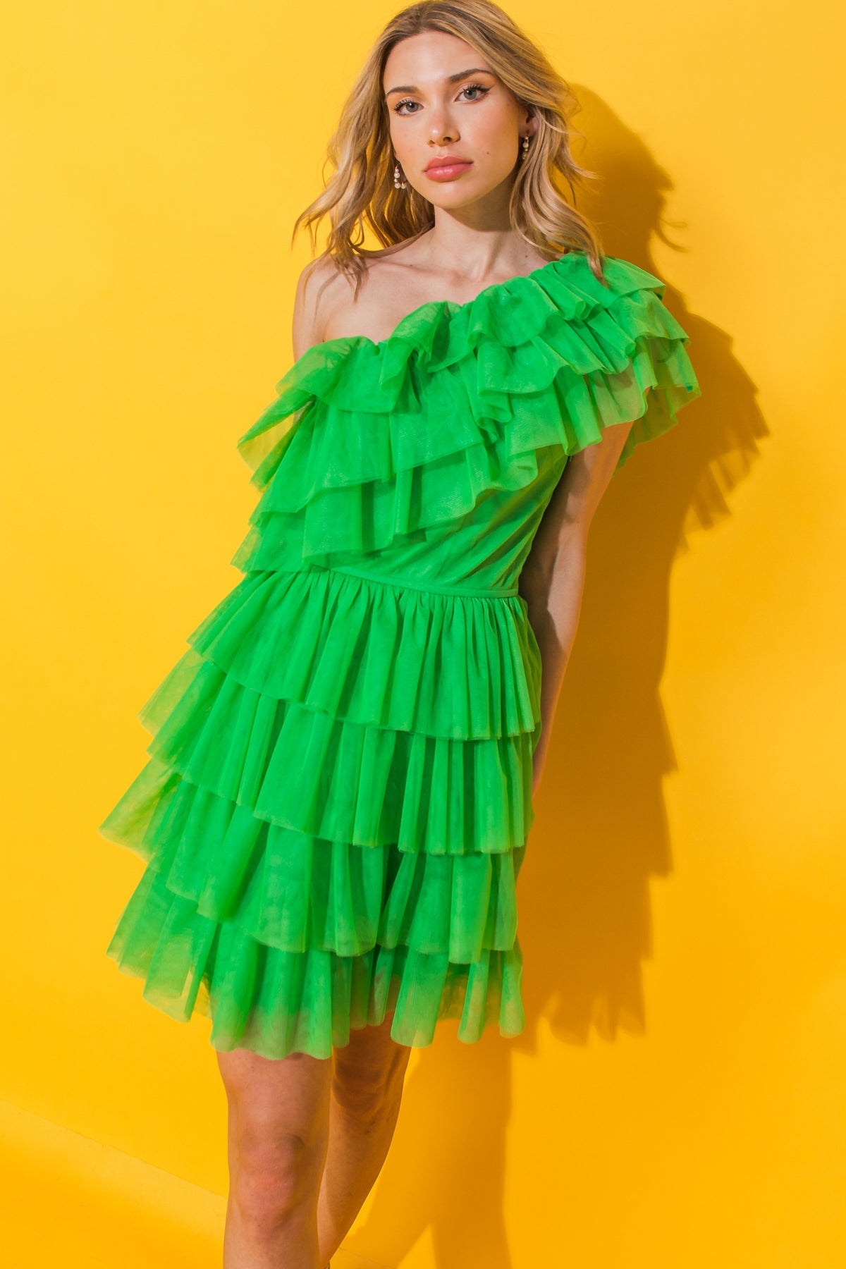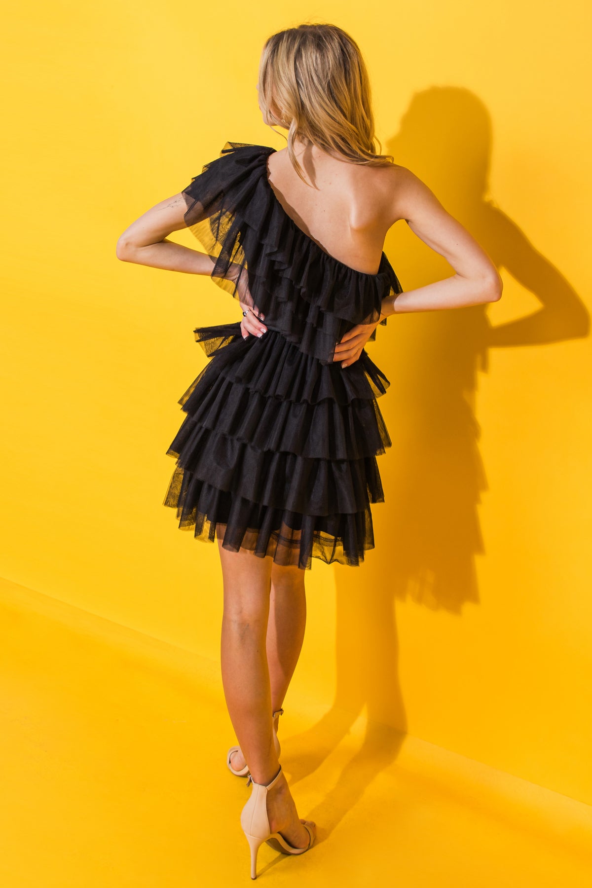 This STUNNING SOIREE TULLE MINI DRESS features a one shoulder neckline, elasticized waist and layered skirt to flatter any figure. The layered flounce is eye-catching, creating a timelessly chic look perfect for any special occasion. Treat yourself to a dress that combines sophistication and elegance.