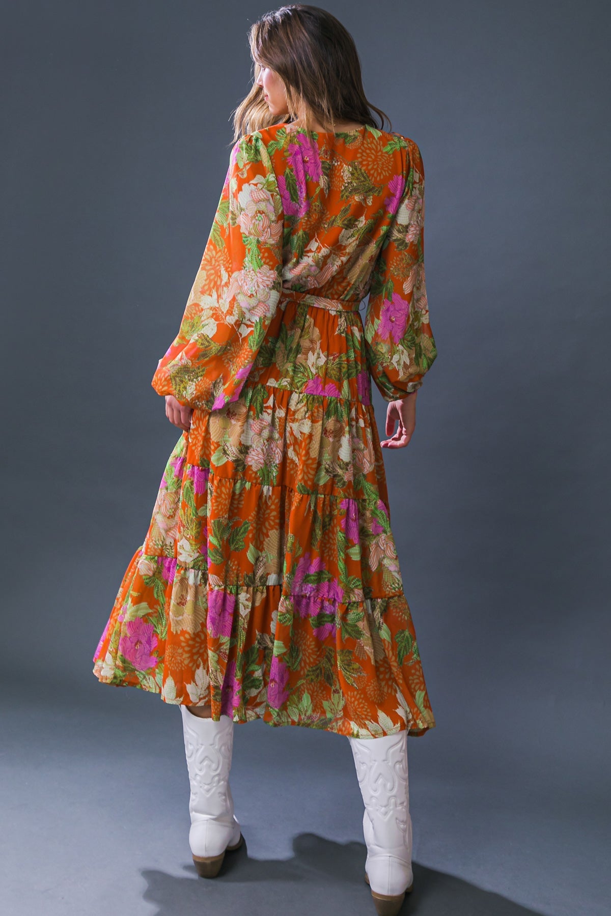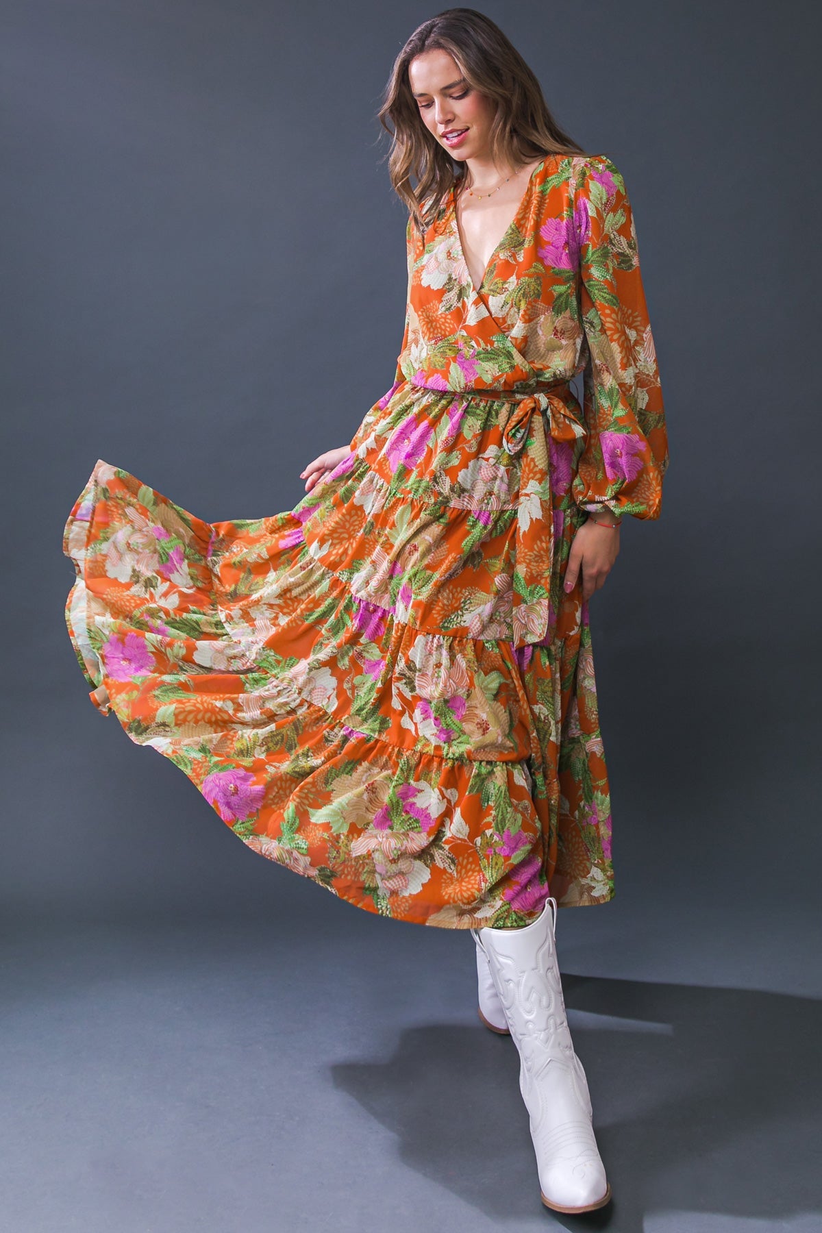 This SUBTLE SWEETNESS WOVEN MIDI DRESS is perfect for any special occasion. Constructed from a lightweight yet sturdy fabric, this dress features a surplice neckline, long sleeve, an elasticized waist with a self sash tie, and a tiered skirt for a flattering silhouette. With its beautiful print, this dress is sure to make a statement.